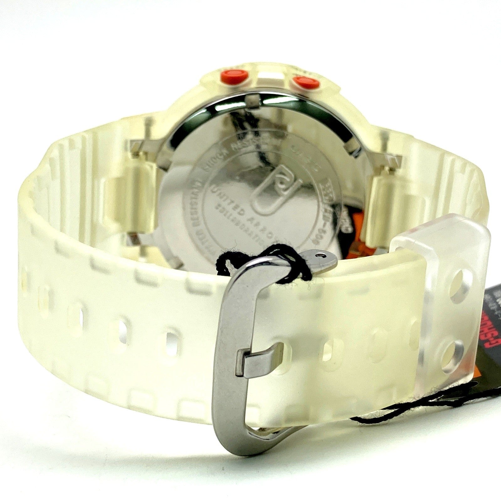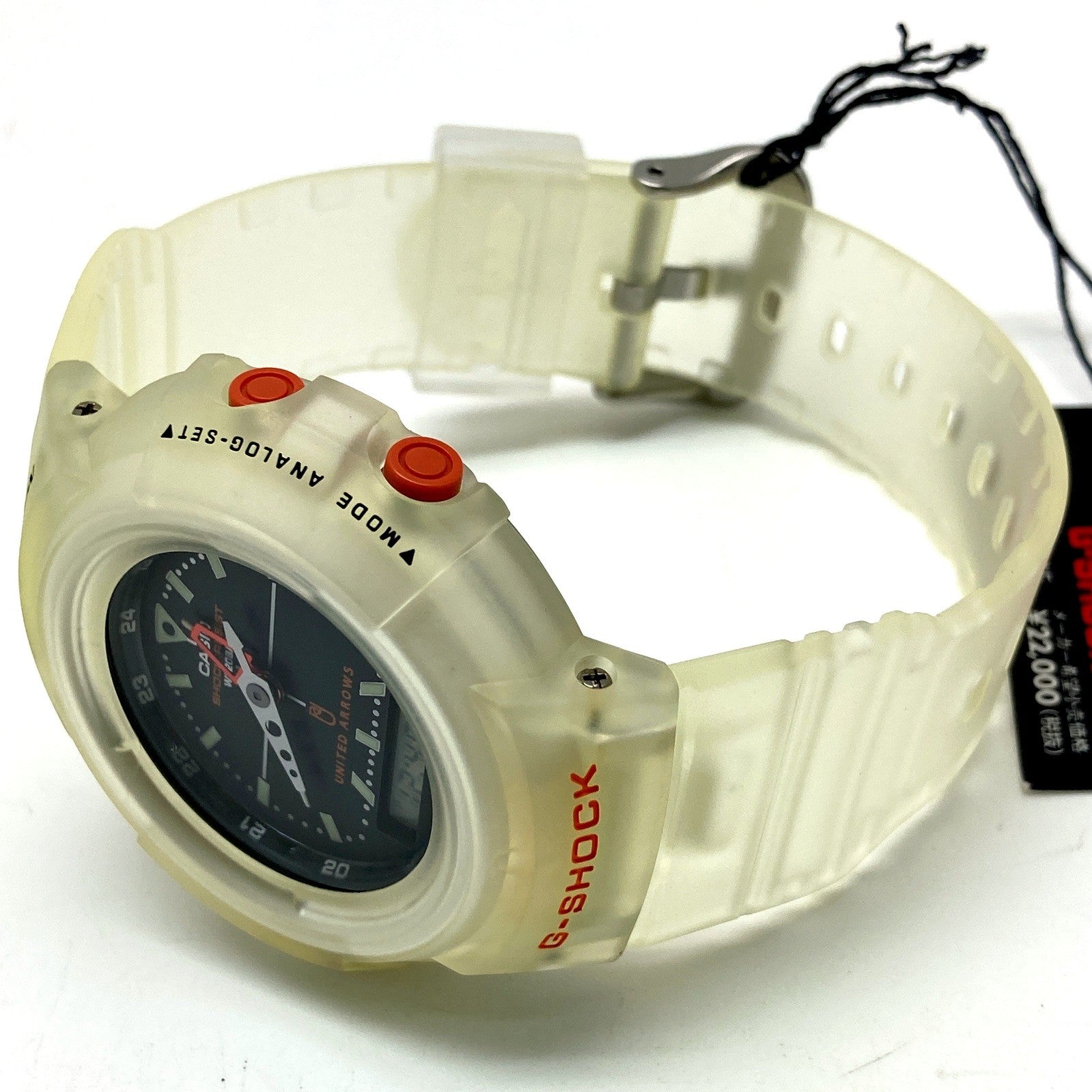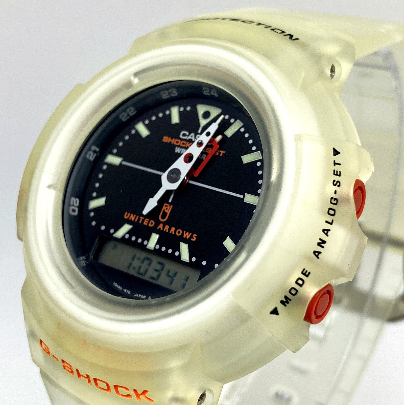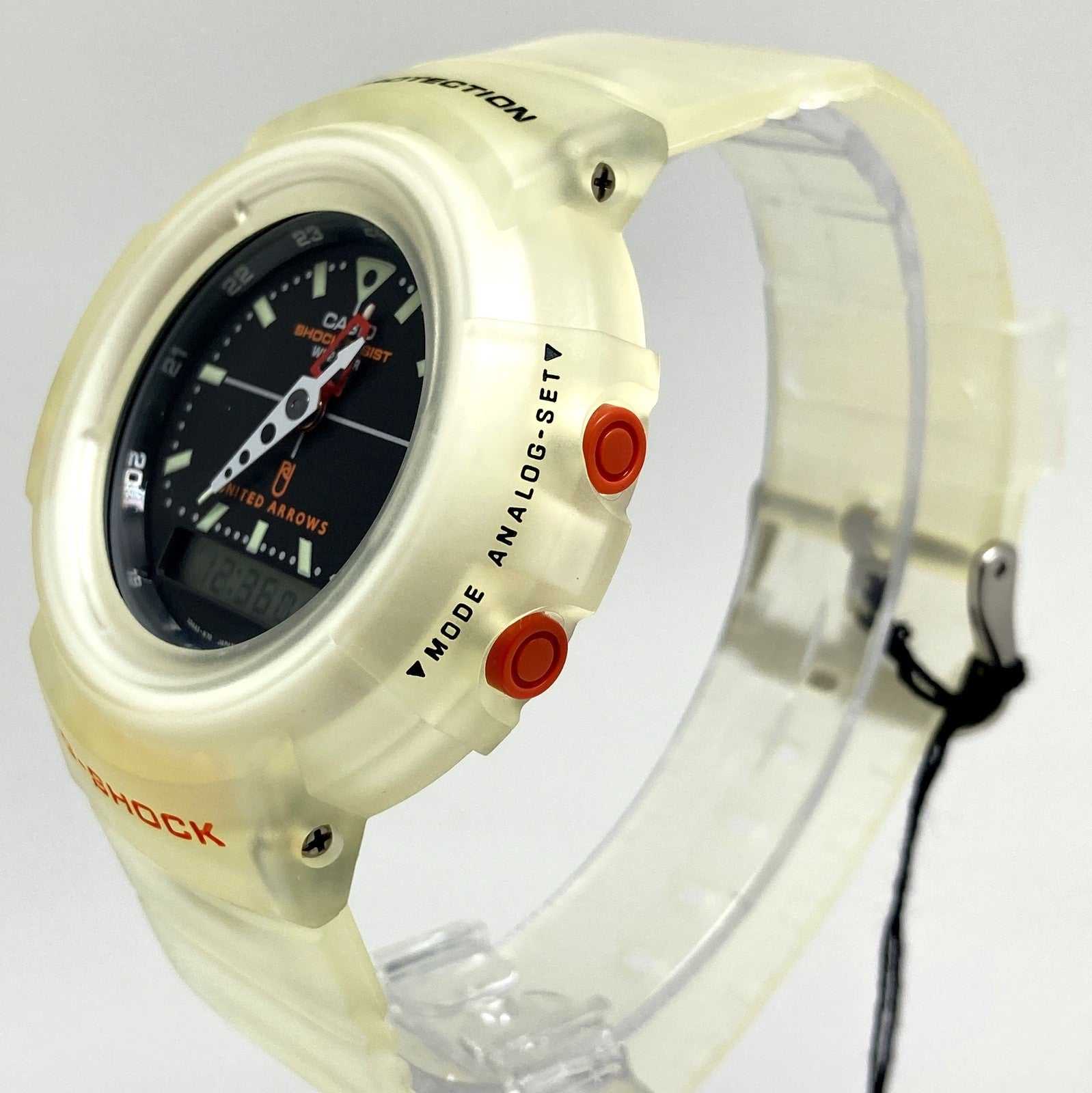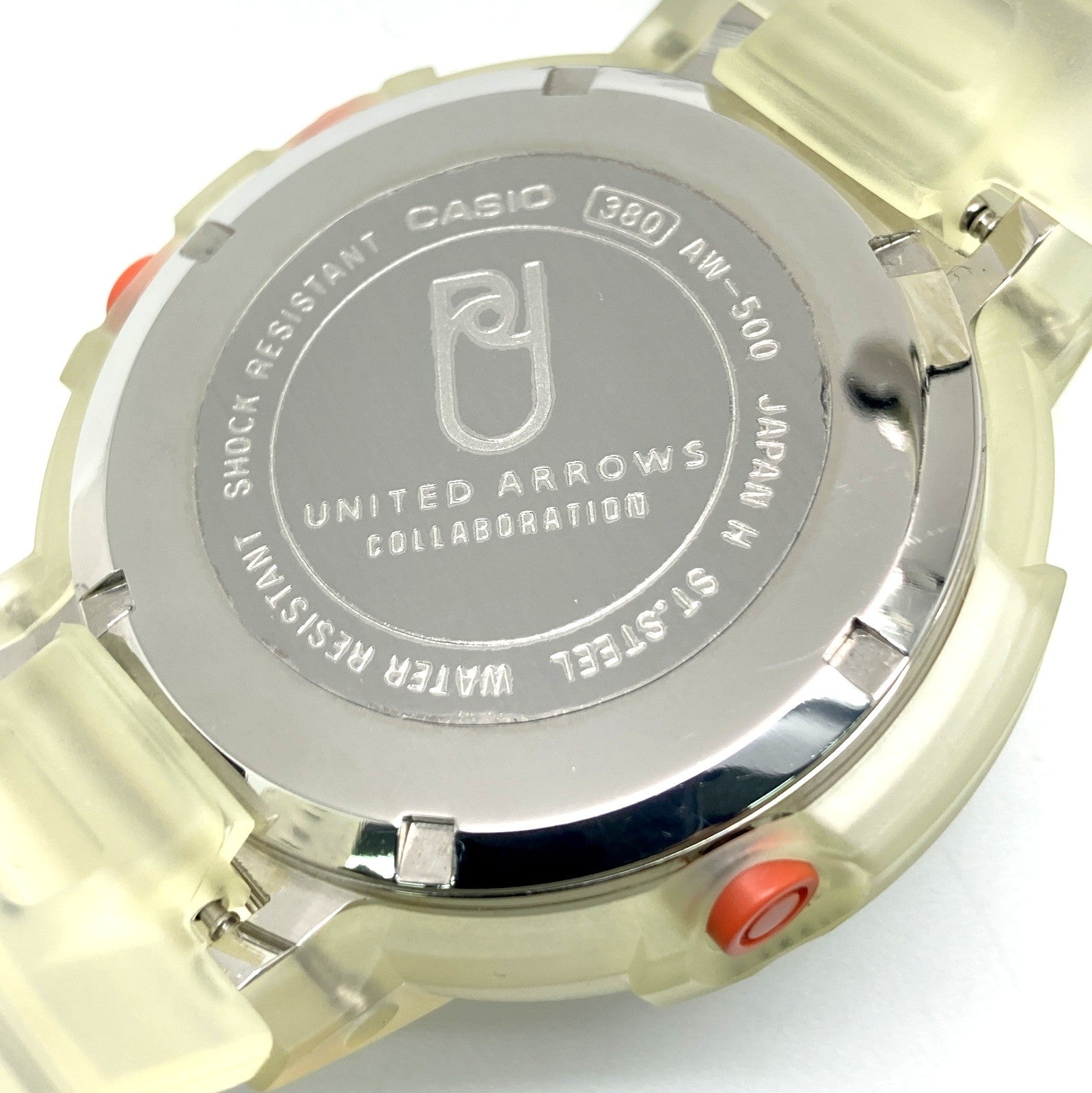| コメント | 1998年2月に発売された、日本のセレクトショップ御三家である「UNITED ARROWS」とのコラボレーションモデル第2弾です。ベースには第1弾と同様にアナログ/デジタルモデルのAW-500を採用。ベゼルとバンドにはホワイトスケルトンを採用し、ロゴやサイドボタンにユナイテッドアローズのブランドカラーであるオレンジが配色されています。裏蓋はスクリューバック仕様となっており、ブランドロゴが刻印されています。 |