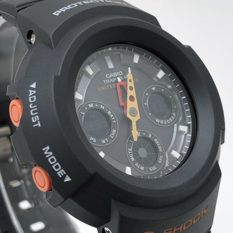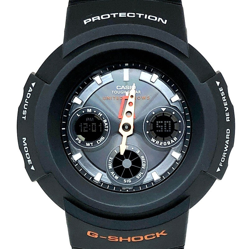 コメント | 2006年6月に発売された、「UNITED ARROWS」の3代目になる別注のコラボレーションモデルです。電波ソーラー機能を搭載したAWG-500J-1Aをベースモデルに、文字盤にロゴを配置し、ボタンはオレンジ色に変更された「UNITED ARROWS」らしい配色です。裏蓋にもロゴが刻印されています。 |