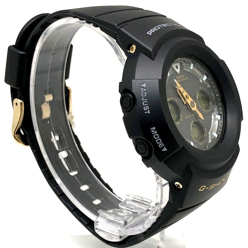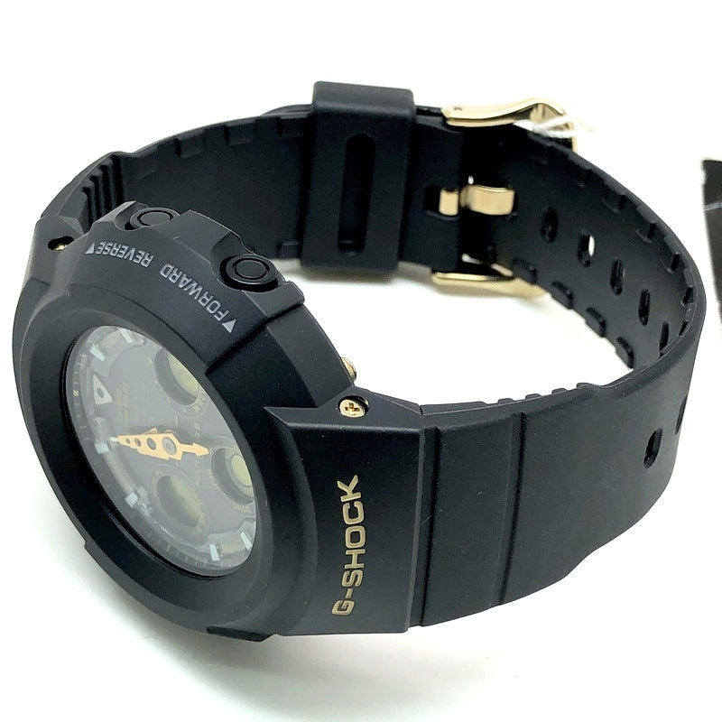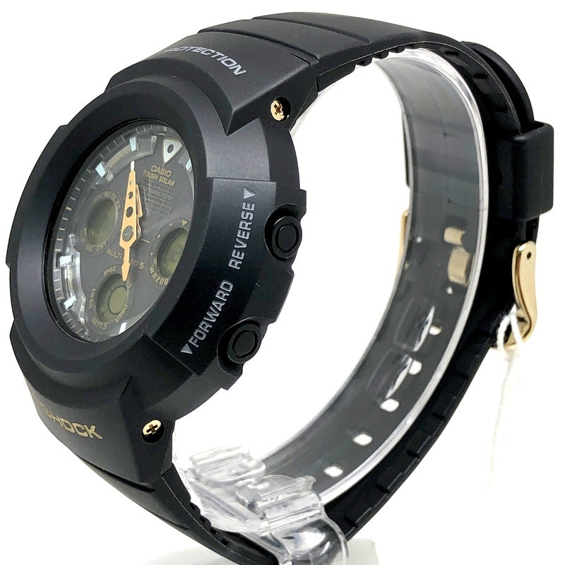 コメント | 2008年5月に25周年を迎えるGショックに先駆けて、2007年5月に発売された「25th ANNIVERSARY Dawn Black(始まりの黒)」。ベースにはタフソーラーとマルチバンド5の電波ソーラーを搭載したアナログ/デジタルモデルAWG-500を採用。ベルトとベゼルはGショックのメインカラーであるブラック、ボタンや尾錠、バックパネルなどのメタルパーツや液晶などにスペシャルカラーのゴールドが採用されています。裏蓋には25周年記念ロゴが刻印されています。 |