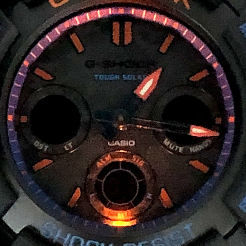 コメント | 2021年2月に発売された、アナログ/デジタルモデル「City Camouflage Series(シティカモフラージュシリーズ)」のAWG-M100SCT-1Aの東南アジア向け海外モデル。ブラックをベースに、ロゴや時分針にはアクセントカラーとしてオレンジやブルーが配色され、ダイヤルにはブラックのカモフラージュ柄がデザインされています。国内モデルのAWG-M100STC-1Aにはマルチバンド6が搭載されていますが、海外モデルには搭載されていません。 |