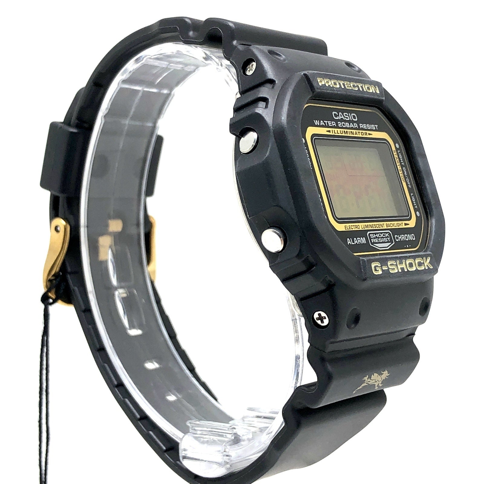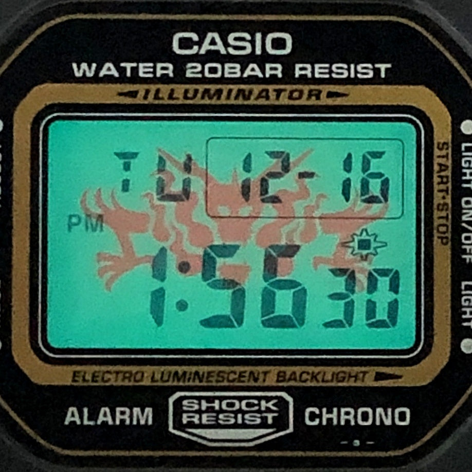 | コメント | 2002年3月に発売された、神秘的なアジアンカルチャーのテイストを表現した「GOLD DEFENDER(ゴールドディフェンダー)」です。ベゼルとバンドはブラックが採用され、文字盤のフレームにはゴールドが配色されています。バンドには古代中国神話の四神「青龍」がデザインされており、ELバックライト発光時にも「青龍」が浮かび上がります。 |