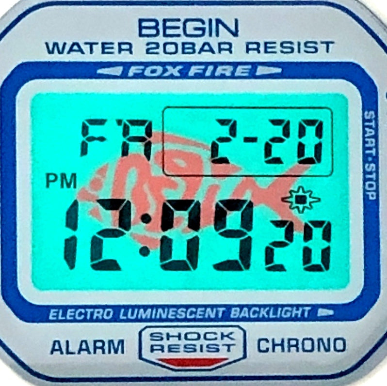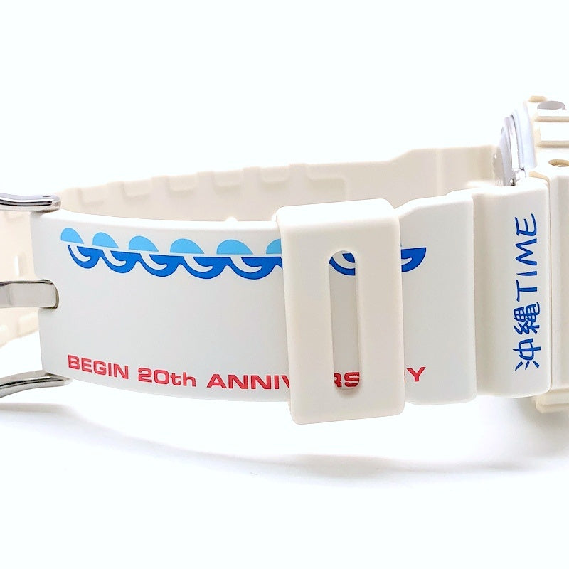 | コメント | 1988年に沖縄県石垣島出身の比嘉栄昇氏・島袋優氏・上地等氏の3人で結成され、1990年にデビューした日本のアコースティック・バンド「BEGIN」のデビュー20周年を記念して2010年発売されたコラボレーションモデル。さらに、この年はBIGINが主催する野外イベント「うたの日」も10周年を迎え、「うたの年ツアー」という大規模なツアーが慣行されたたアニバーサリーイヤーです。ベースにはスクエアデザインが人気のDW-5600が採用され、沖縄をイメージしたデザインに仕上げられています。ベゼルとバンドにはホワイトが採用され、文字盤とロゴにはアクセントカラーとしてブルーが配色されています。バンドには沖縄の島と波のモチーフ、「BEGIN 20th ANNIVERSARY」の文字がプリントされています。裏蓋には20周年記念のシンボルマークが刻印され、ELバックライト発光時には「さかなロゴ」が浮かび上がります。 |
