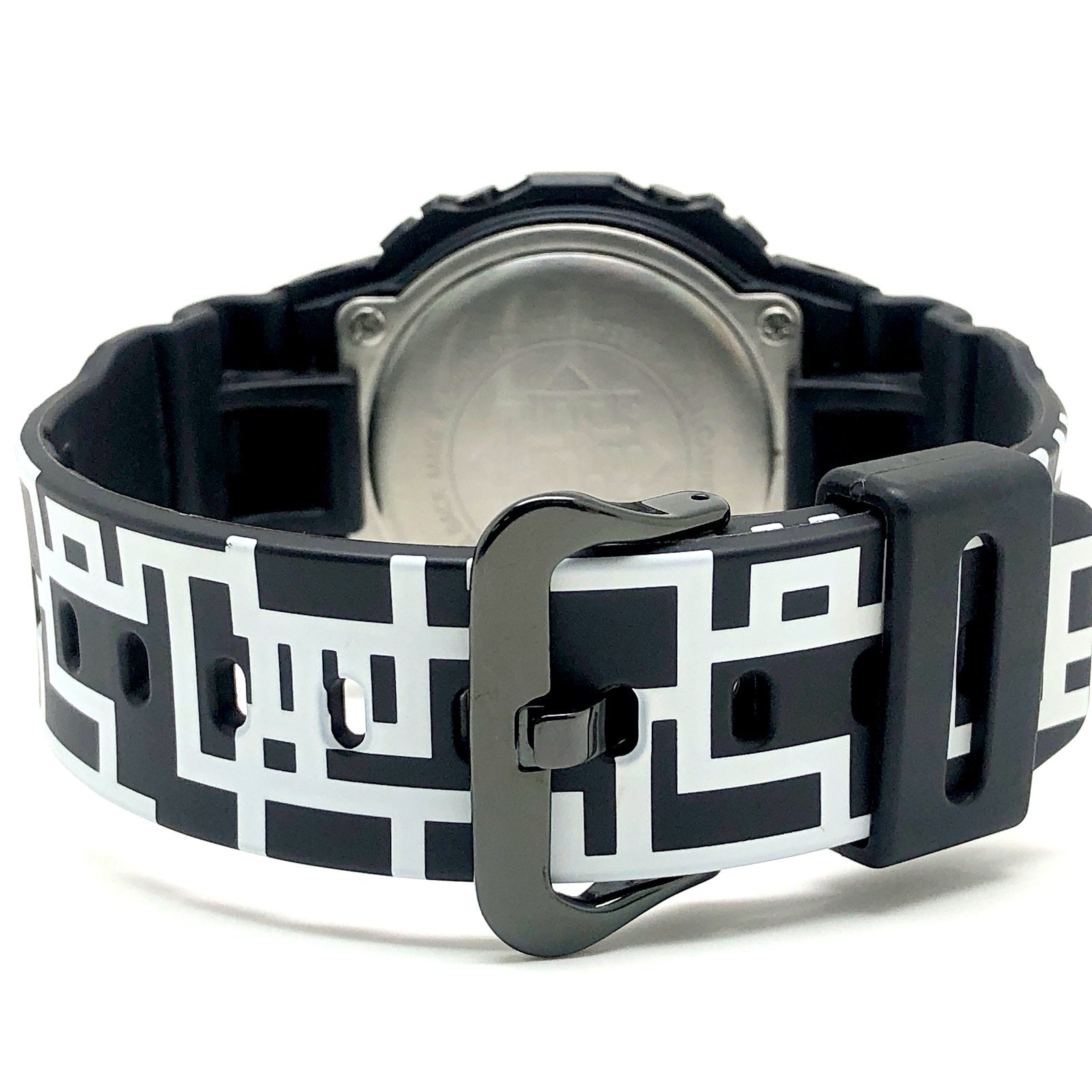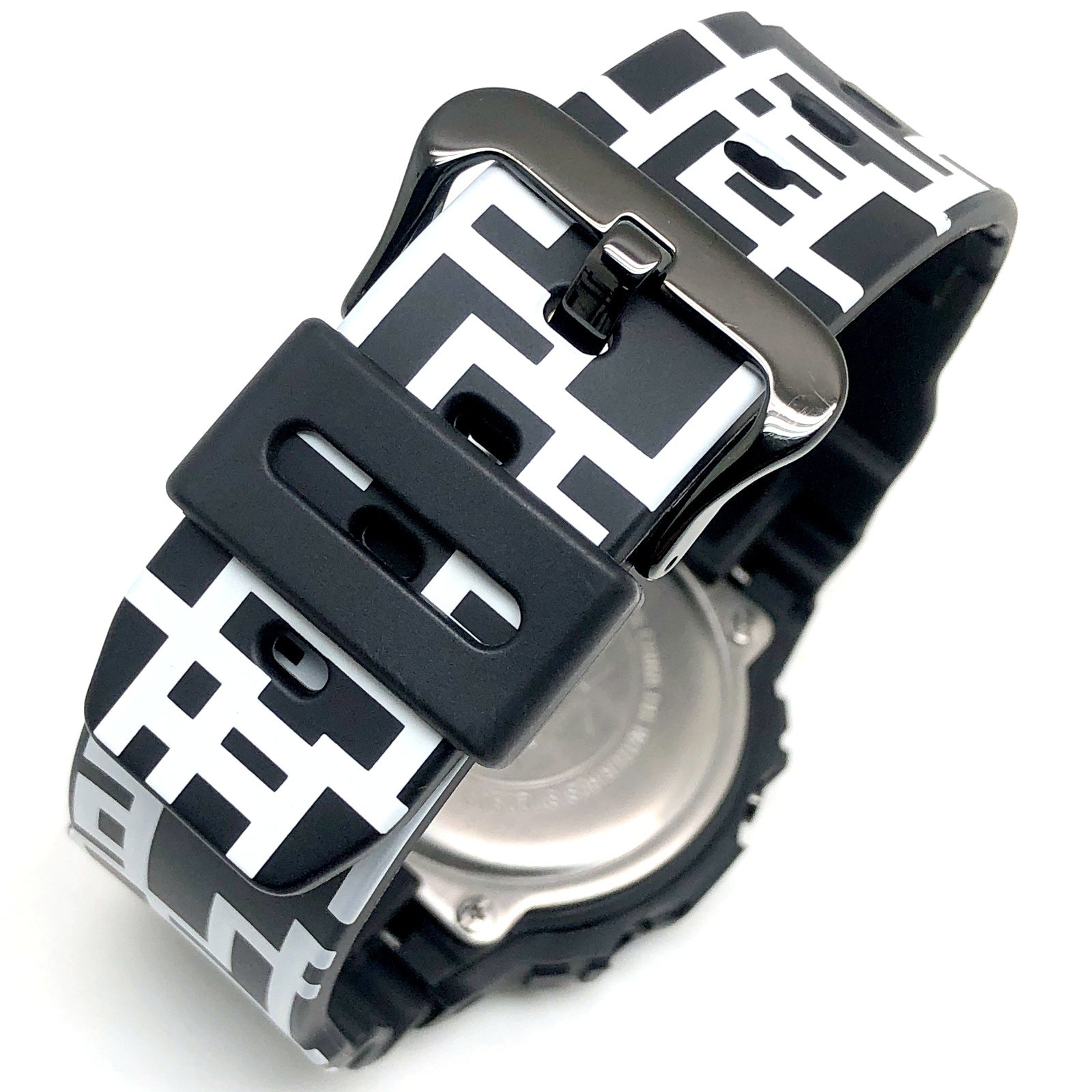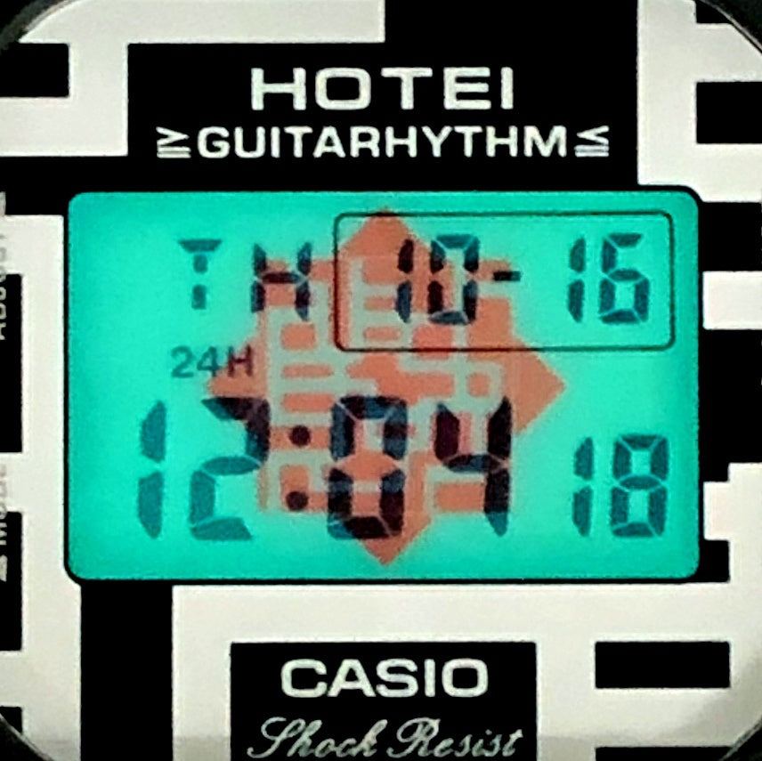 | コメント | 2017年3月に、日本を代表するギタリストである布袋寅泰氏のアーティスト活動35周年を記念して発売されたコラボレーションモデル。ベースにはスクエアデザインが人気のDW-5600が採用され、全面に布袋寅泰氏が使用するギターに施されているギタリズム柄(G柄)がデザインされています。裏蓋にはそのギタリズム柄のマークがが刻印され、ELバックライト発光時にも同様のマークが浮かび上がります。 |
