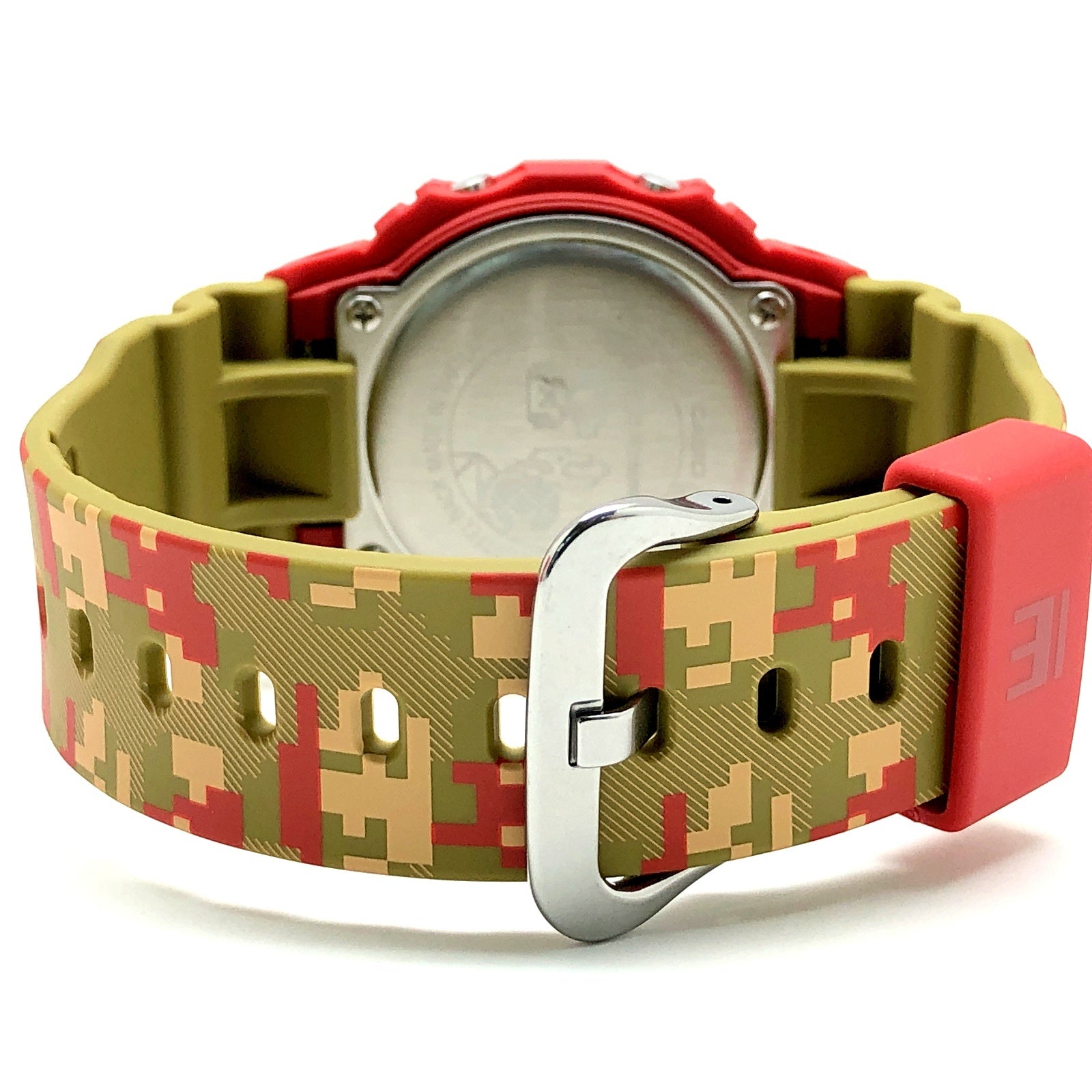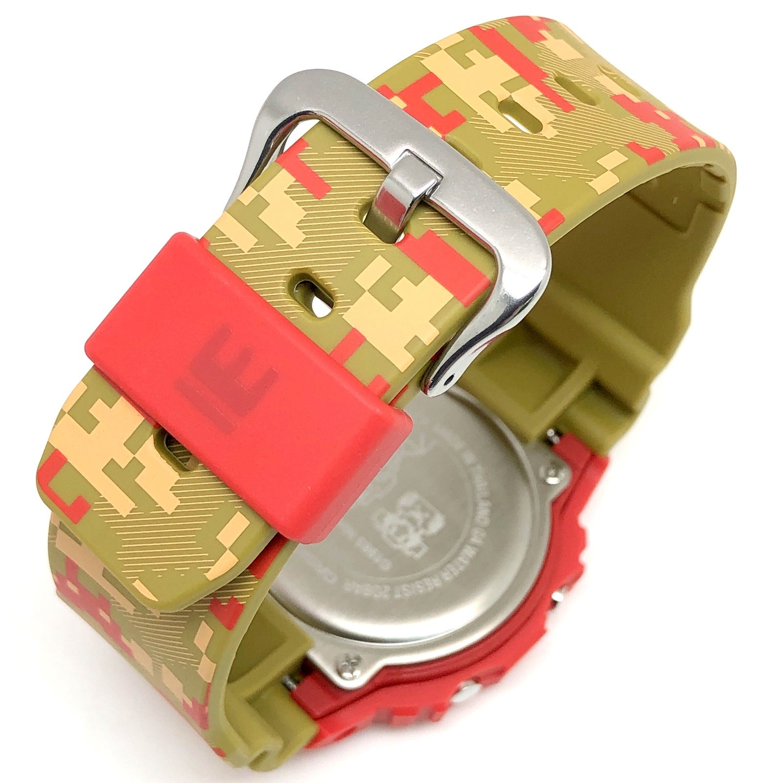 | コメント | 2022年11月に発売された、日本を代表するゲームメーカー任天堂が1985年に発表し、世界的人気となったアクションゲームシリーズ「SUPER MARIO BROTHERS(スーパーマリオブラザーズ)」とのコラボレーションモデル。ベースにはスクエアデザインが人気のDW-5600が採用され、全体でマリオワールドの世界観が表現されています。ベゼルにはマリオをイメージしたレッドを配色し、ロゴにはコインや王冠をイメージしたゴールドが配色されています。バンドには「無限1UP」をイメージした無数のマリオがデザインされています。文字盤には「ミドリこうら」がデザインされ、ELバックライトを発光させると「無限1UP」するマリオが浮かび上がります。裏蓋には残念ながらノコノコにやられてしまうマリオが刻印されています。 |