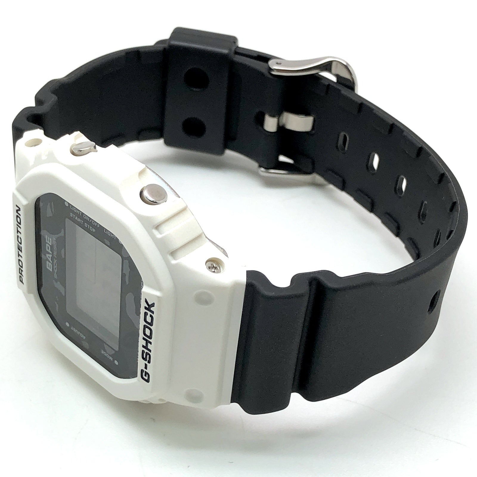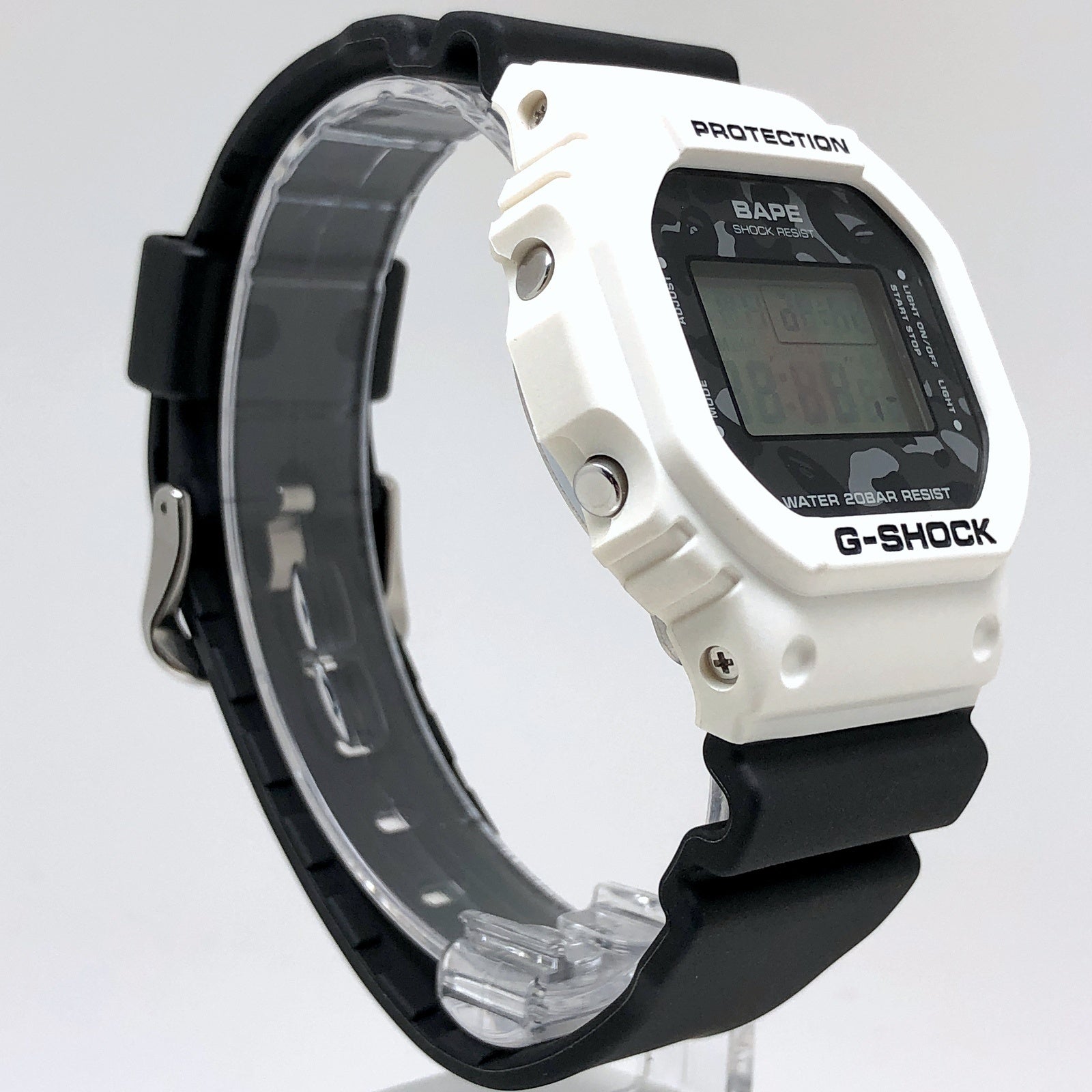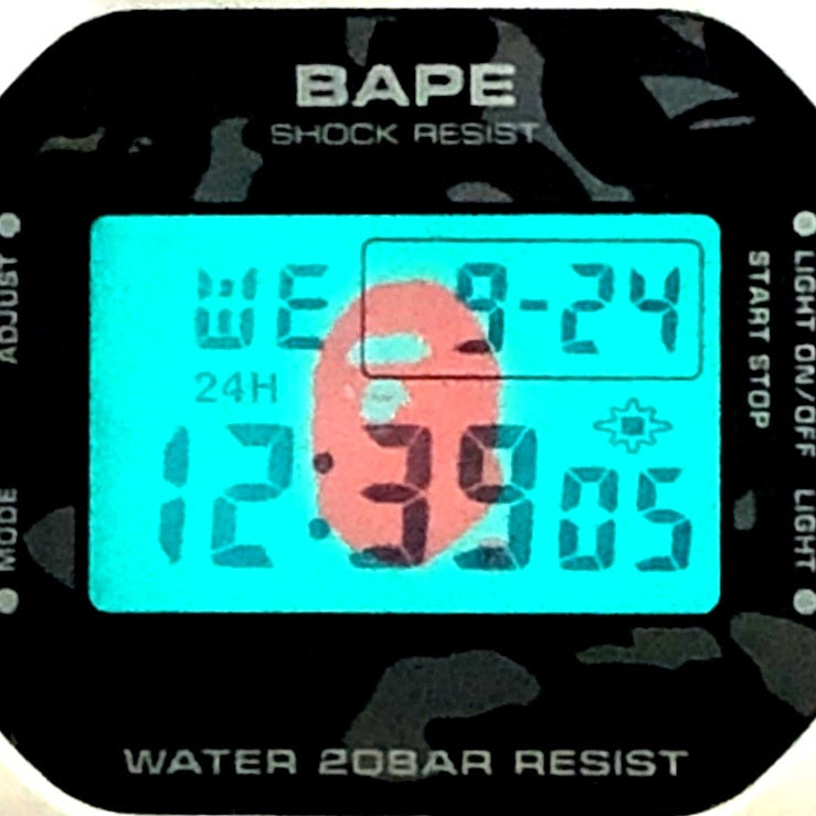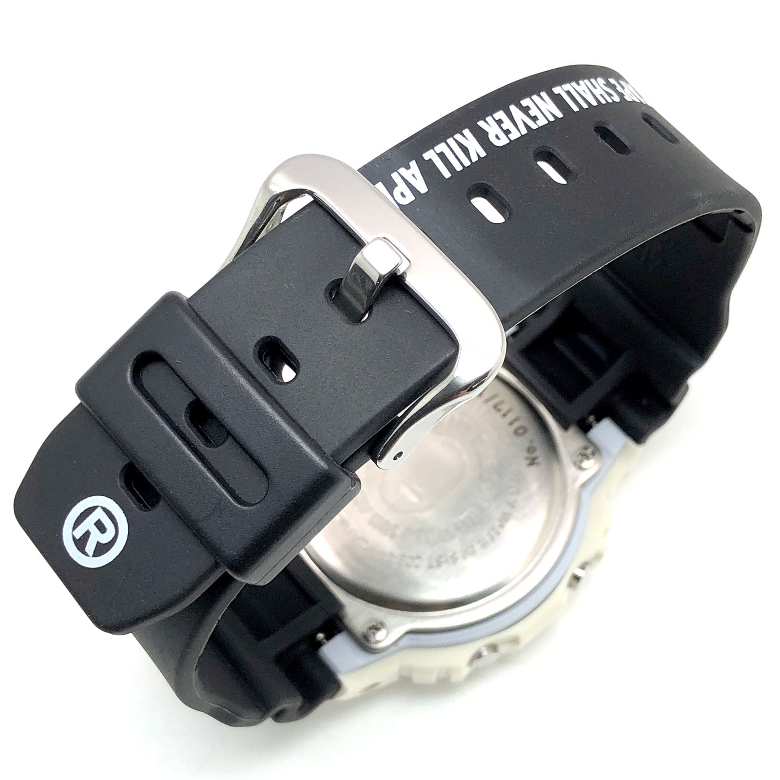 | コメント | 2007年1月に公式オンラインショップ「NIGO'S FAVORITE SHOP(NFS)」にて1000本限定で発売された、日本を代表する世界的デザイナーNIGO(ニゴー)が創業した裏原宿系ストリートウェアブランド「A BATHING APE(アベイシングエイプ)」のコラボレーションモデル。ベースにはスクエアデザインが人気のDW-5600を採用。ベゼルにはホワイト、バンドにはブラックが配色され、バイカラーデザインで仕上げられ、バンドには「APE SHALL NEVER KILL APE」の文字がデザインされています。ダイヤルにはエイプの代名詞と言える「BAPE CAMO」が採用され、裏蓋にはロゴとシリアルナンバーが刻印されています。ELバックライト発光時には「エイプヘッド」が浮かび上がります。 |