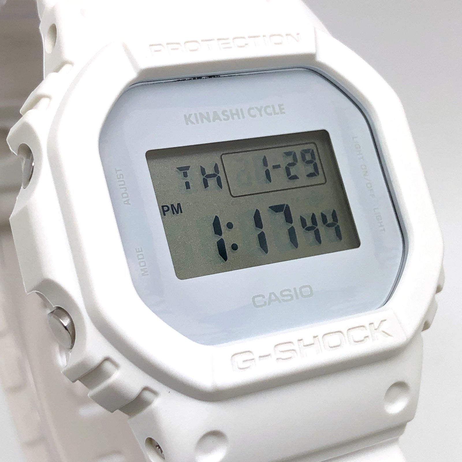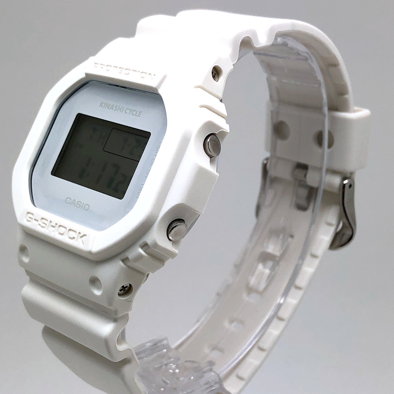 | コメント | 2016年5月に発売された、お笑いコンビ・とんねるずの木梨憲武氏の実家である、東京都世田谷区の老舗自転車店「木梨サイクル」とのコラボレーションモデル4弾。ベースにはスクエアデザインが人気のDW-5600を採用し、ベゼルやバンド、サイドボタンや尾錠、文字盤まで、すべてホワイトでデザインされています。文字盤上部には「KINASHI CYCLE」の文字が配置され、裏蓋には木梨サイクルのロゴが刻印されています。 |