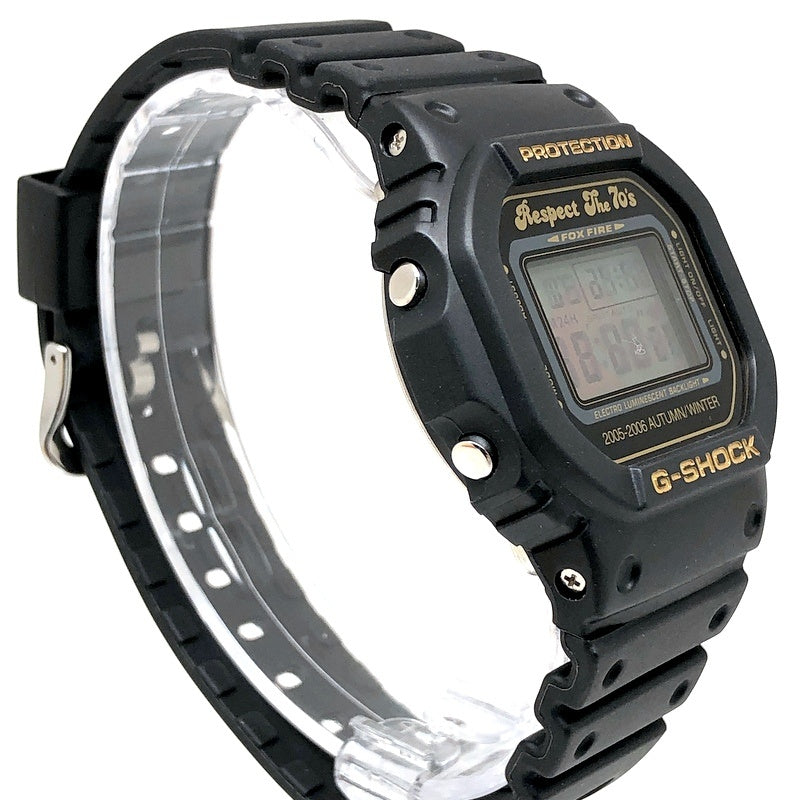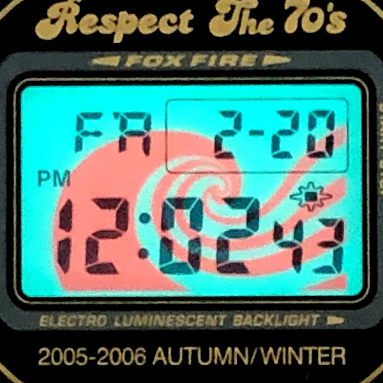 | コメント | スイスに拠点を置く世界最大級の国際たばこメーカー「フィリップモリス」が展開するタバコ銘柄の一つ「LARK」とのコラボレーションモデル。2000年代に行った「LARK FREEDOM」キャンペーン第4弾の懸賞当選品。ベースにはスクエアデザインが人気のDW-5600を採用。ブラックをベースに、ロゴや文字盤にはアクセントカラーとしてゴールドが採用されています。文字盤上部には「Respect The 70’s」と「2005-2006 AUTUMN/WINTER」の文字がデザインされています。裏蓋には波をモチーフにしたキャンペーンロゴが刻印され、ELバックライト発光時にも同様のモチーフが浮かび上がります。 |