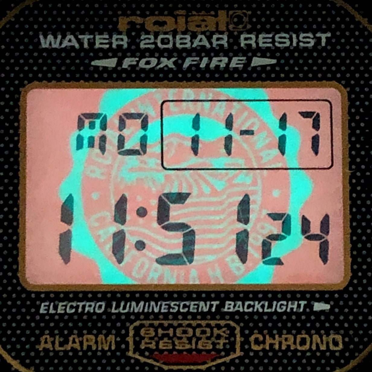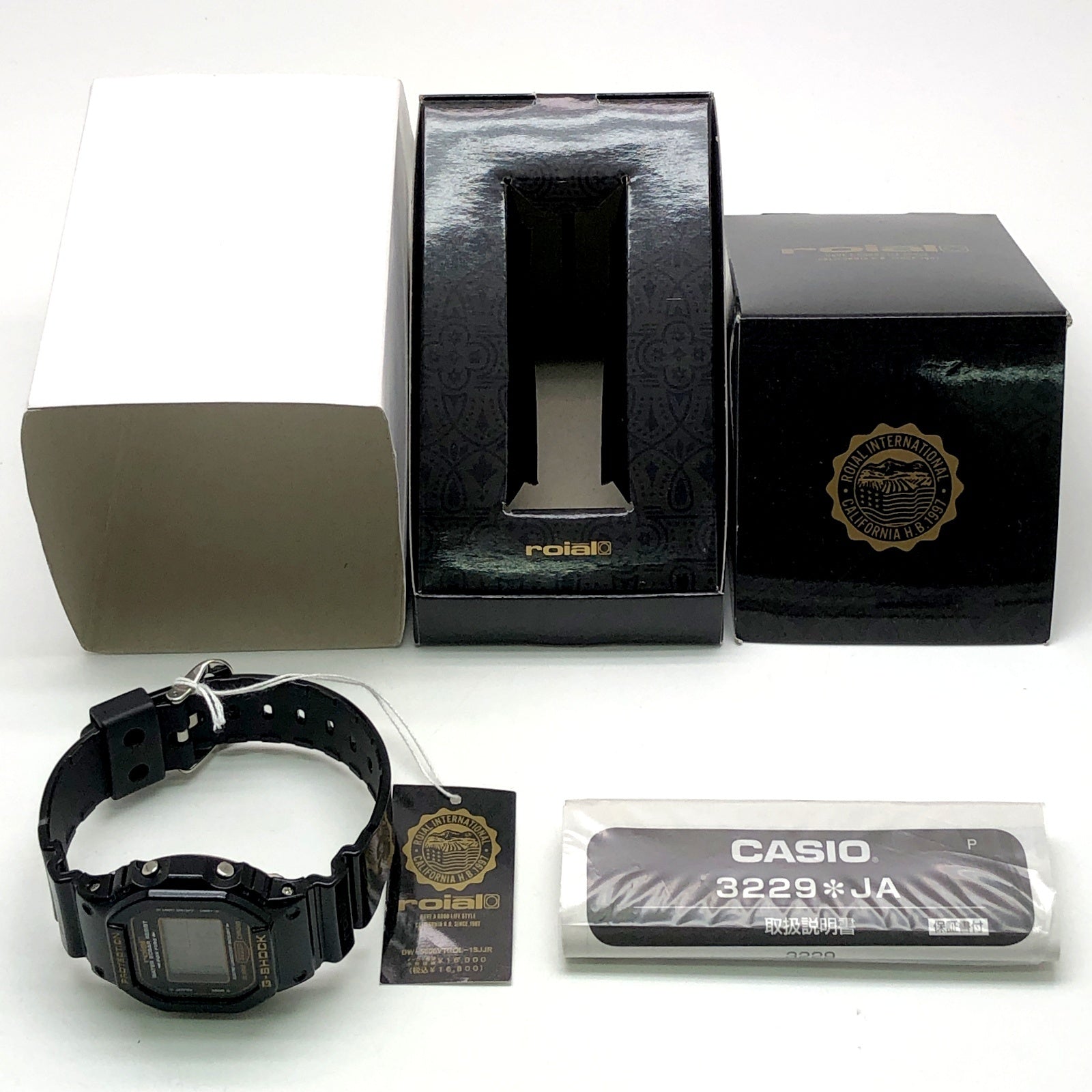 | コメント | 2011年7月に発売された、アメリカのカリフォルニアで1997年に創業されたサーフブランド「roial(ロイアル)」とのコラボレーションモデル。ベースにはスクエアデザインが人気のDW-5600が採用され、ベゼルとバンドには光沢塗装が施されたブラックが採用されています。ロゴや文字盤にはアクセントカラーとしてゴールドが配色されており、ロイアルらしいカジュアルながら高級感のあるデザインに仕上げられています。裏蓋にはエンブレムが刻印され、EL発光時にも同様のエンブレムが浮かび上がります。 |