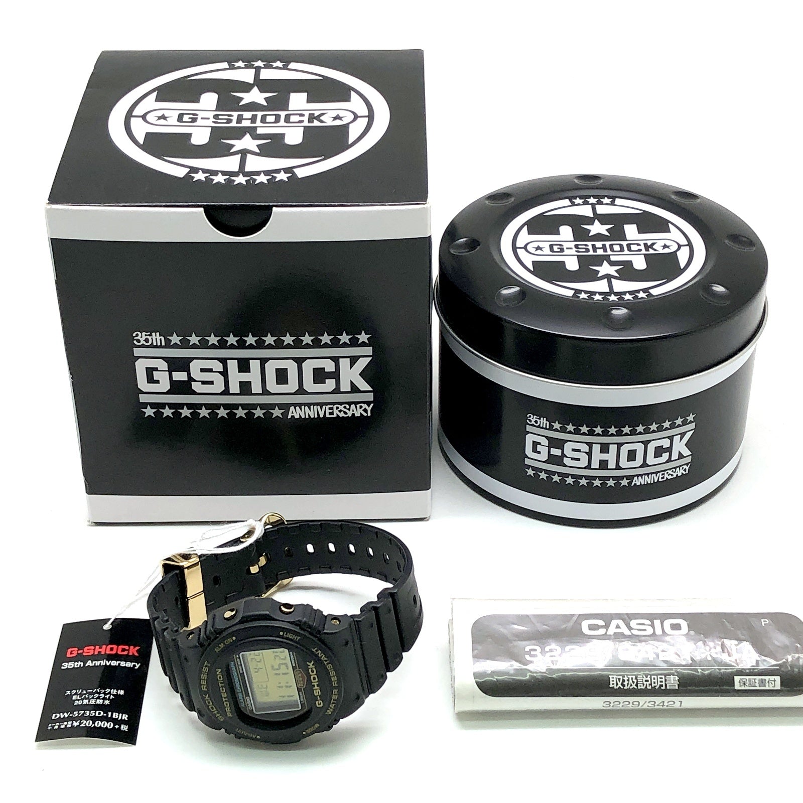 | コメント | 2018年4月にG-SHOCK誕生35周年を記念して発売されたゴールドをアクセントにした限定モデル。ベースにはG-SHOCKファンから「スティング」の愛称で呼ばれているDW-5700を採用。ベゼルとバンドにはG-SHOCKのブランドカラーであるブラックを配色し、文字盤やロゴ色、サイドボタンには、初代G-SHOCKの色違いである「DW-5000C-1B」のゴールドカラーを再現。遊環には35周年を意味するスターマークと「35th anniversary」の文字がデザインされています。裏蓋はスクリューバック仕様となっており、35周年記念ロゴが刻印されています。 |