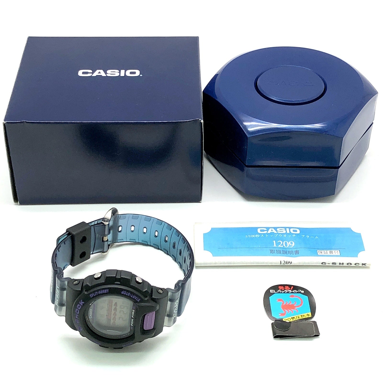 | コメント | 1994年11月に発売された、冬季限定FOXFIRE(フォックスファイア)のパープル(紫)バージョン。ベゼルはブラックで、バンドはパープルスケルトンのカモフラージュ仕様。ベゼルのロゴとフロントボタンにパープルが採用されています。ELバックライト発光時には「サソリ」が浮かび上がります。 |