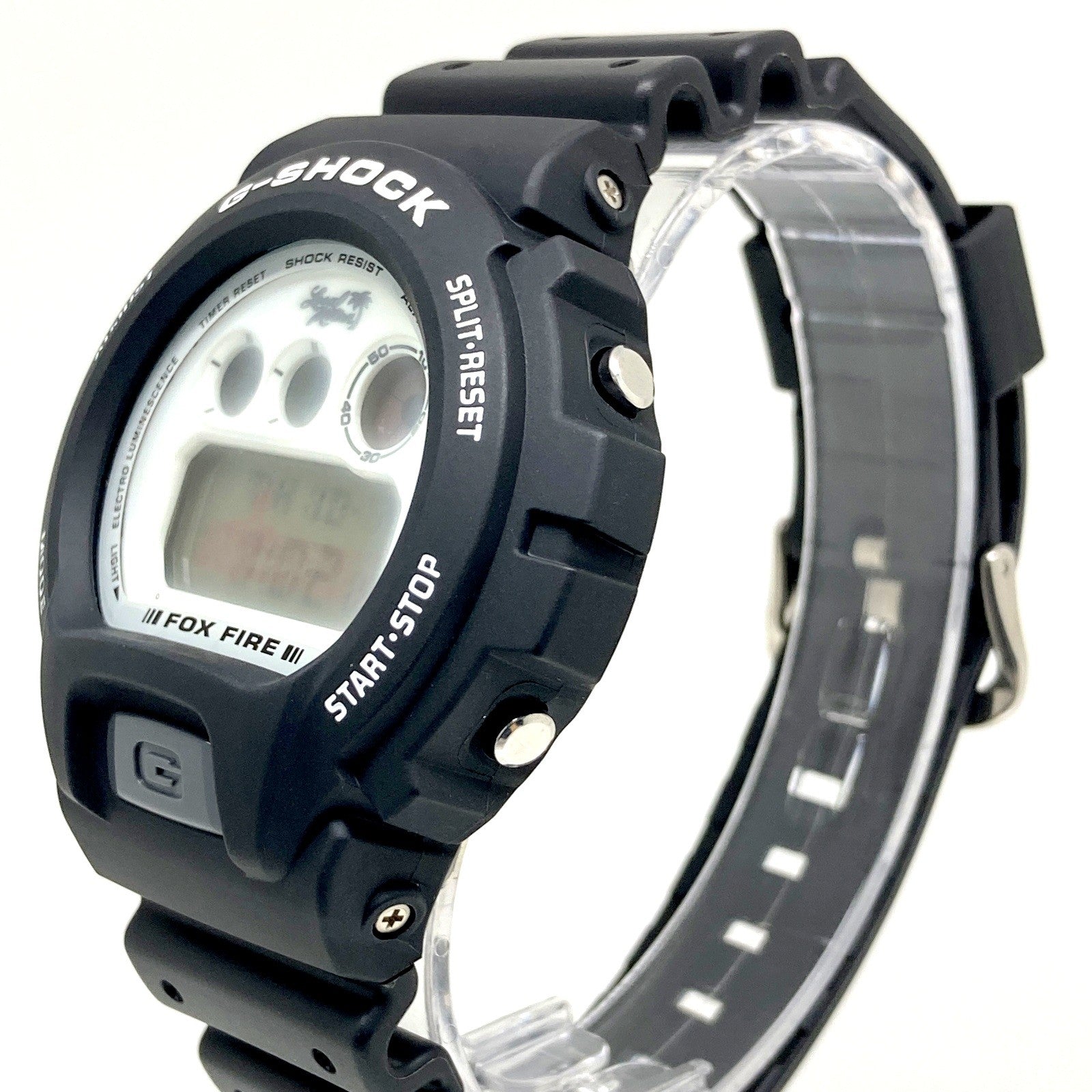 コメント | 1998年12月に発売された、1977年にハワイでロブ・バーンズ氏によって設立されたサーフブランド「Local Motion(ローカルモーション)」とのコラボレーションモデル第2弾。ベースにはコラボモデルの定番で3つ目デザインが人気のDW-6900を採用。ブラックをベースに、文字盤にはホワイトが配色され、上部にはブランドロゴがデザインされています。裏蓋にはロゴに使用されているクロスマークが刻印され、ELバックライト発光時には「Local Motion」のロゴが浮かび上がります。 |