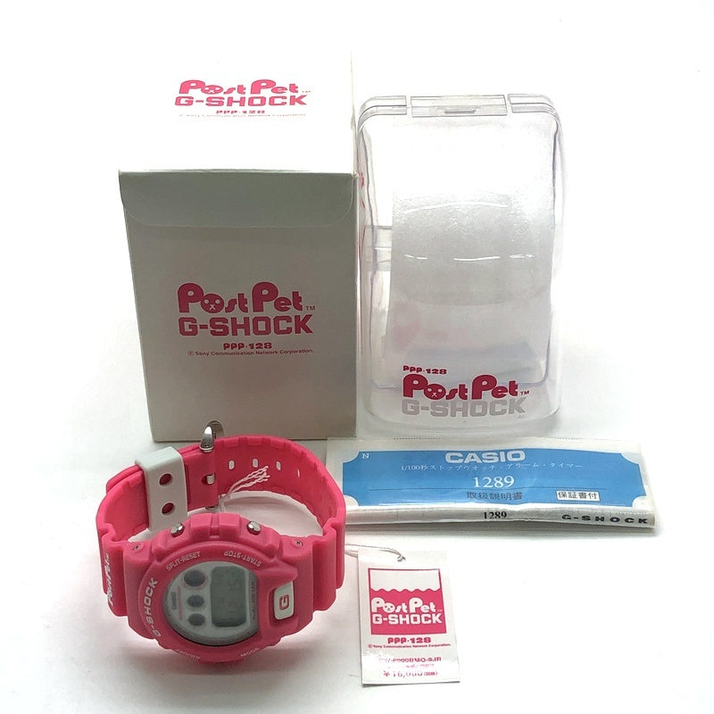 | コメント | 2000年11月に発売された、1997年にソニーが提供開始した電子メールソフト「Post Pet(ポストペット)」とのコラボレーションモデル。ベースには3つ目デザインが人気の定番モデルDW-6900を採用。メインキャラクターであるテディベアのモモのカラーリングでデザインされており、ベゼルとバンドにはピンクが採用され、文字盤にはホワイトが配色されています。裏蓋にはモモのキャラクターとロゴが刻印され、ELバックライト発光時にはモモのシルエットが浮かび上がります。 |