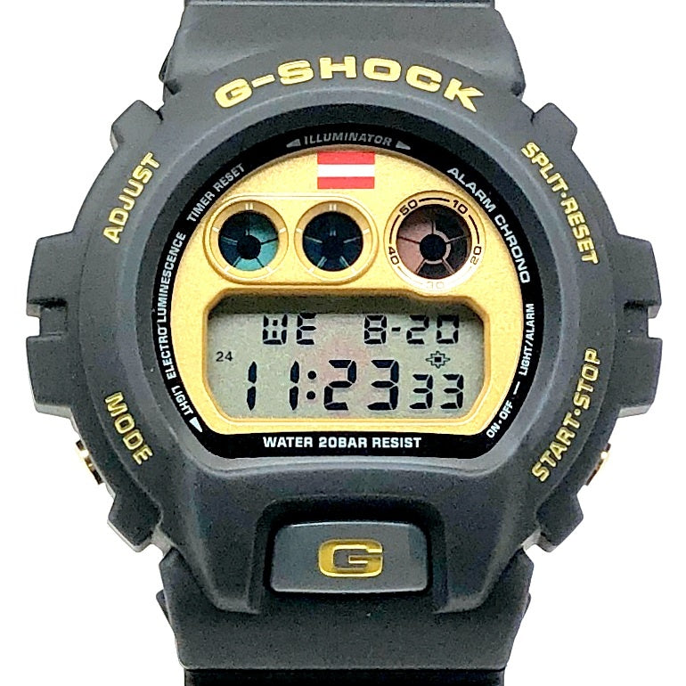 コメント | 2007年11月に、G-SHOCK誕生25周年を記念して1500本限定で発売された、1860年代の日本の幕末において、薩長同盟で活躍した土佐藩士「坂本龍馬」」とのコラボレーションモデル。ベースには3つ目デザインが特徴でコラボモデルの定番DW-6900FSを採用。ベゼルとバンドにはスタンダードなブラックが配色され、文字盤やサイドボタン、ロゴなど随所にゴールドが配色されています。ダイヤルには坂本龍馬が中心となり結成した組織(商社)である「海援隊」の旗(二曳)がデザインされ、バンドには2丁の拳銃や肖像画と、坂本龍馬の有名な句「世の人は我を何とも言えば言え 我なす事は 我のみぞ知る」がプリントされています。裏蓋にはG-SHOCK25周年記念ロゴが刻印され、ELバックライト発光時には、桔梗の花をモチーフにした坂本家の「家紋」が浮かび上がります。坂本龍馬の誕生日であり命日の11月15日に発売。 |