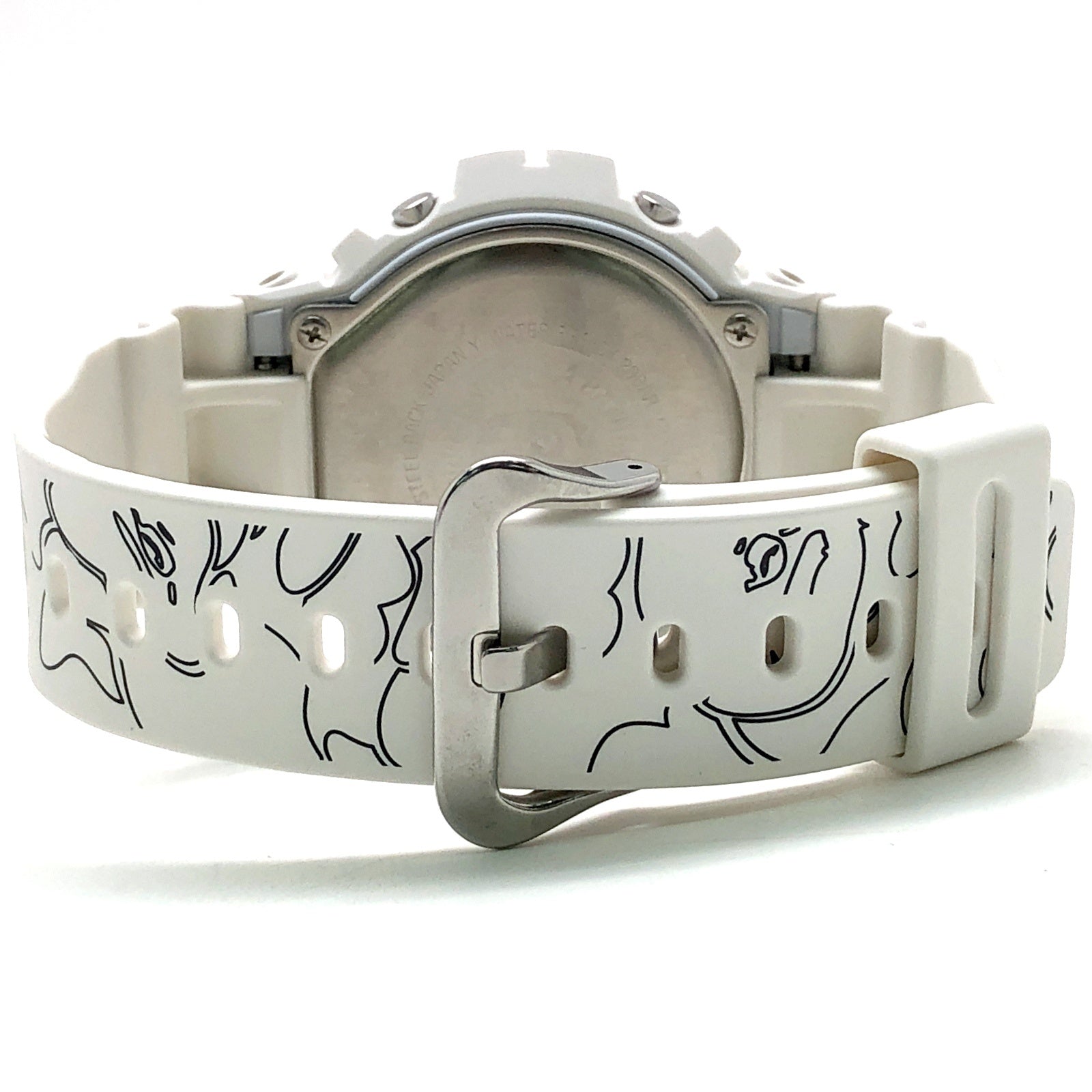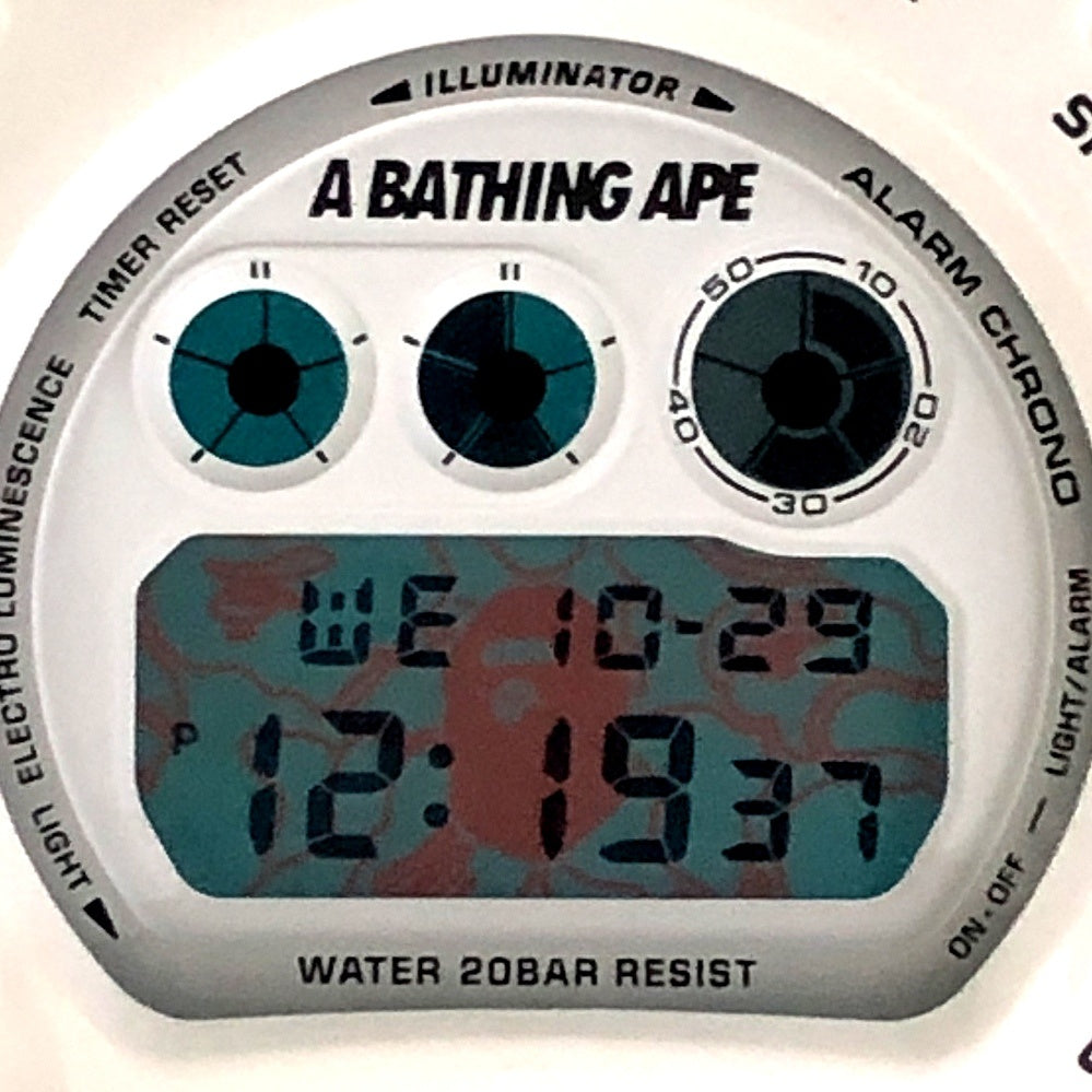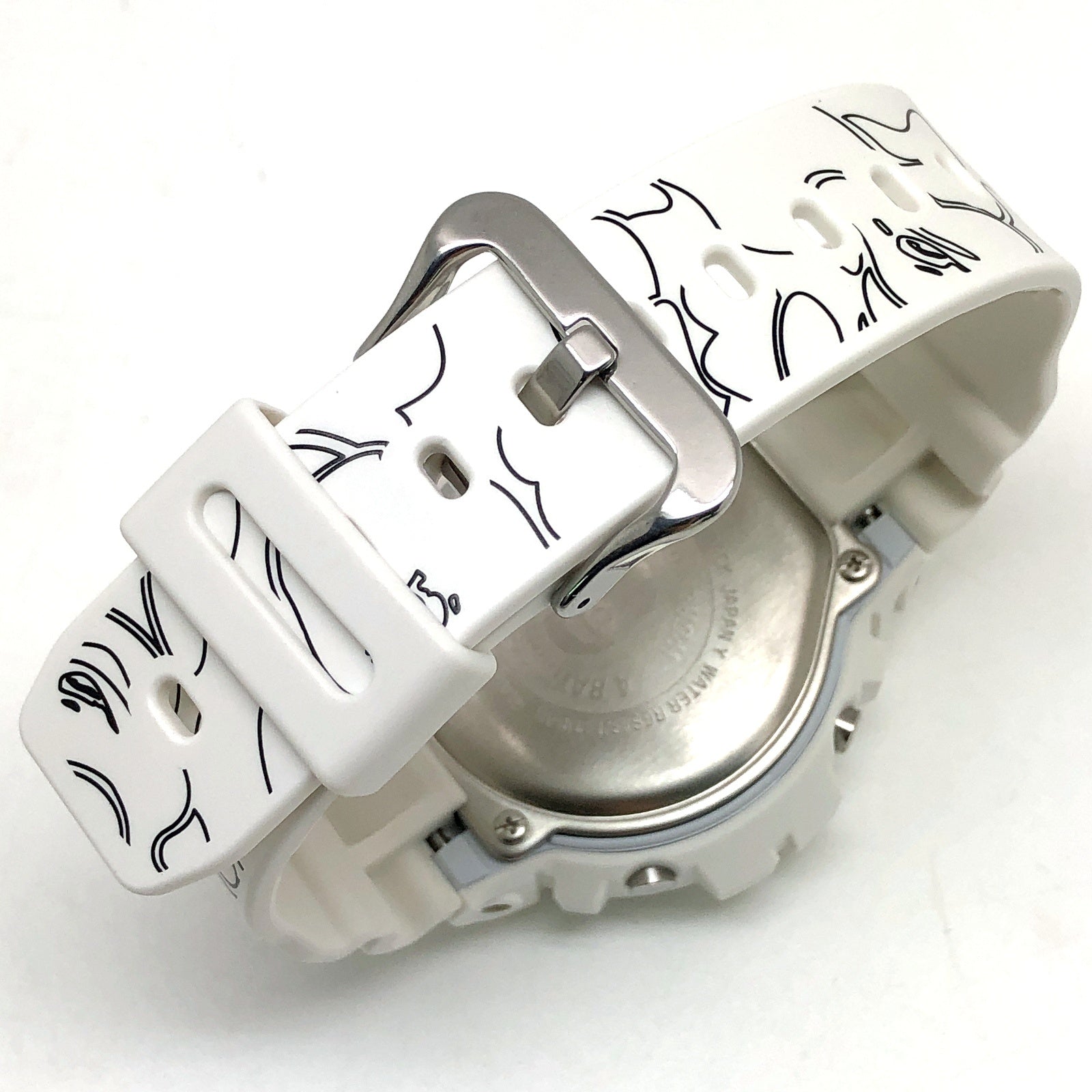 | コメント | 2017年3月に発売された、日本を代表する世界的デザイナーNIGO(ニゴー)が創業した裏原宿系ストリートウェアブランド「A BATHING APE(アベイシングエイプ)」のコラボレーションモデル。ベースにはコラボモデルの定番DW-6900を採用。ベゼルとバンドはマットな質感のホワイトで仕上げられ、ダイヤルとフロントボタンにもホワイトが採用されています。バンドには「A BATHING APE」の文字とベイプカモがデザインされ、文字盤上部にはロゴが配置されています。裏蓋にはロゴが刻印され、ELバックライト発光時には「エイプヘッド」が浮かび上がります。 |