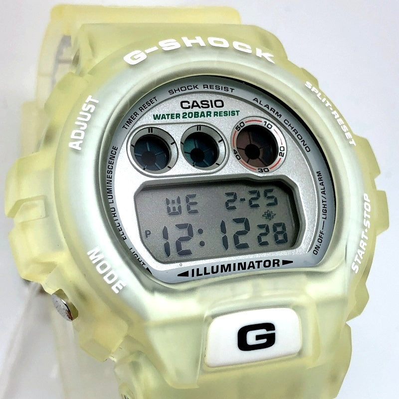 | コメント | 2007年5月にG-SHOCKの25周年を記念して発売された、第5回イルカクジラ会議のオフィシャルモデルであるDW-6900K-8BTの復刻版。1996年に発売されたDW-6900K-8BTは、G-SHOCKで初めてホワイトスケルトンが採用されたモデルで、文字盤や裏蓋のデザイン、ELバックライト発光時のブリーチングするクジラまで忠実に再現されています。 |