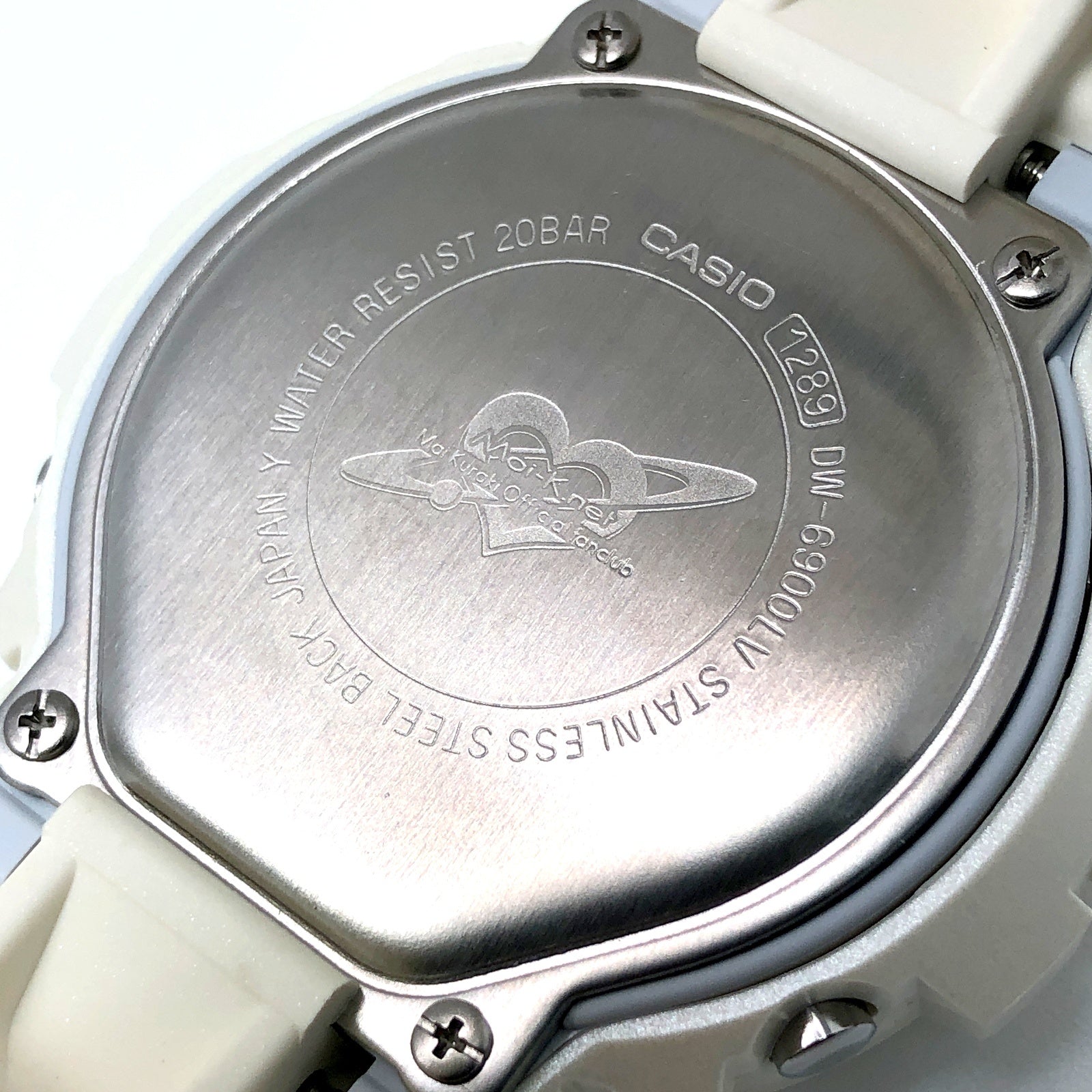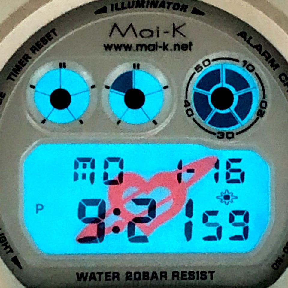 コメント | 2005年3月に、日本のシンガーソングライター「倉木麻衣」のオフィシャルファンクラブ「Mai-k.net」の5周年を記念して、ファンクラブ限定で発売されたコラボレーションモデル。ベースにはコラボモデルの定番3つ目モデルDW-6900を採用。ベゼルとバンドにはパールホワイトが採用され、ダイヤルにはシルバーが配色されています。文字盤上部には「Mai-k.net」の文字がデザインされており、バンド先端には当時使用されていたロゴがプリントされています。裏蓋にも同様のロゴが刻印され、ELバックライト発光時にも同様のロゴが浮かび上がります。 |