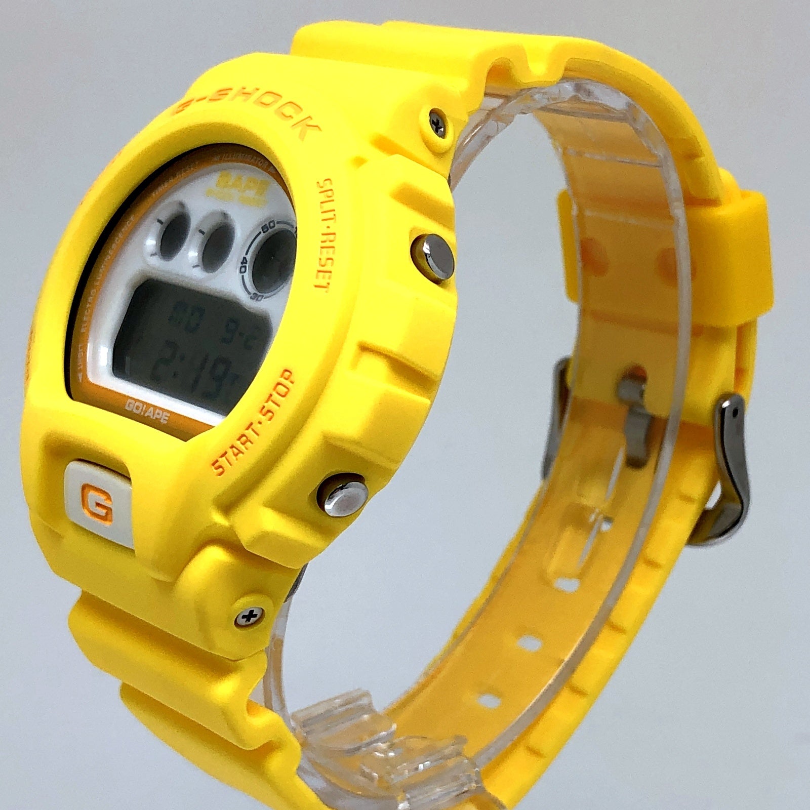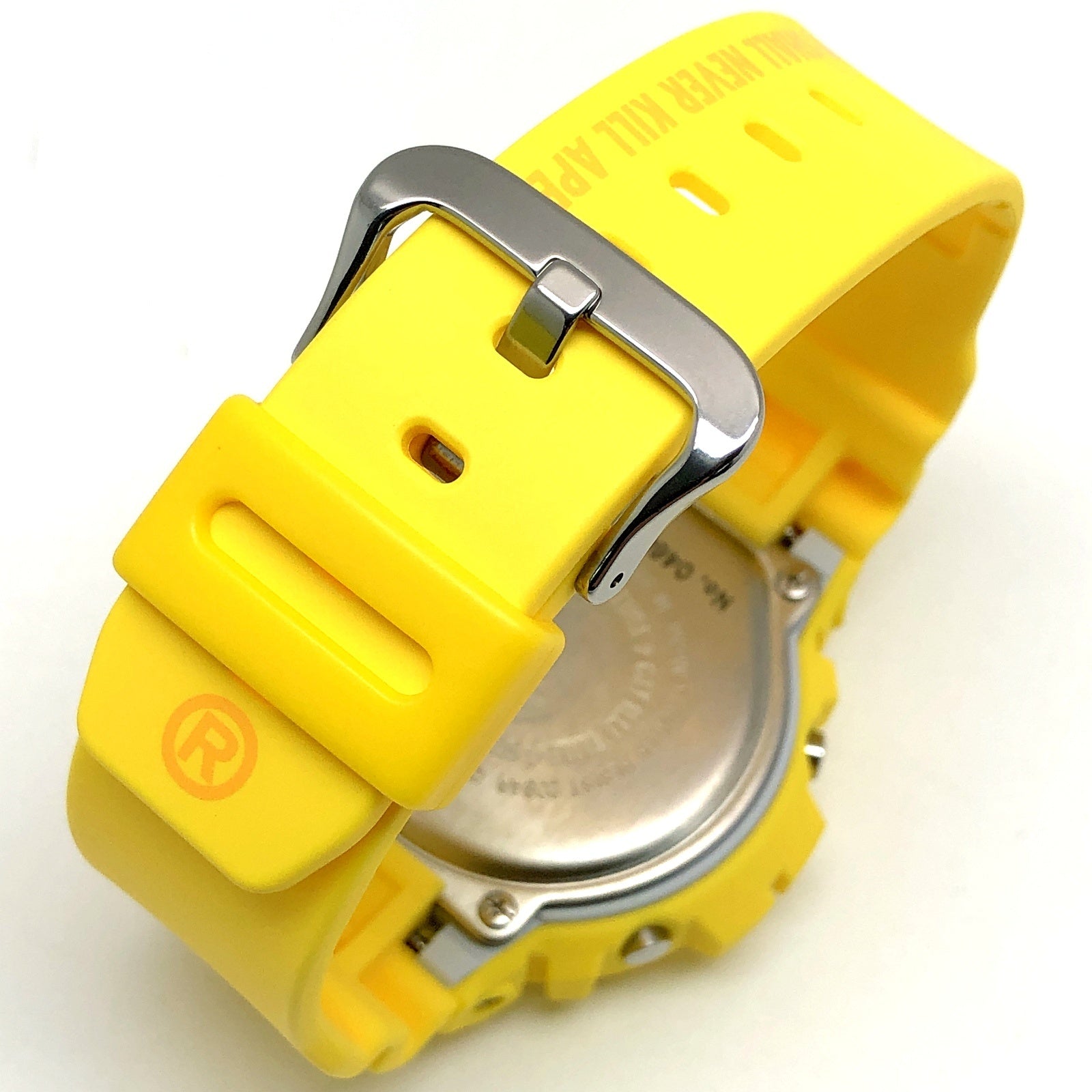 コメント | 2007年3月に1000本限定で発売された、日本を代表する世界的デザイナーNIGO(ニゴー)が創業した裏原宿系ストリートウェアブランド「A BATHING APE(アベイシングエイプ)」のコラボレーションモデル。ベースにはコラボモデルの定番DW-6900を採用。ベゼルとバンドはイエローで仕上げられ、ベゼルのロゴもイエローを配色。バンドには「APE SHALL NEVER KILL APE」の文字がデザインされています。ダイヤルとフロントボタンはホワイトが採用され、文字盤上部にはブランドの略語である「BAPE(ベイプ)」の文字がプリントされ、裏蓋にはロゴとシリアルナンバーが刻印されています。ELバックライト発光時には「エイプヘッド」が浮かび上がります。 |