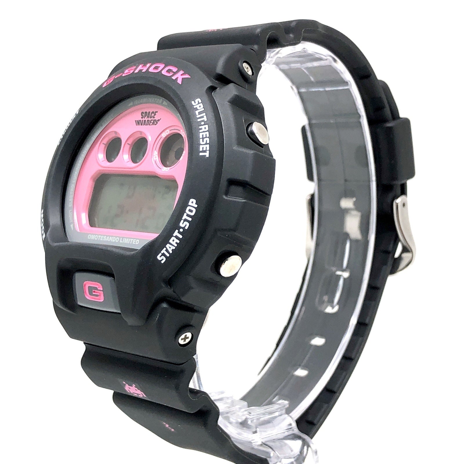 | コメント | 2006年12月に表参道の期間限定イベントに合わせて限定1000本で発売された、1978年にタイトーが開発し、世界的ブームを巻き起こした大ヒットアーケードゲーム「スペースインベーダー」のコラボレーションモデル第2弾「SPACE INVADERS OMOTESANDO LIMITED」。ベースにはコラボモデルの定番DW-6900が採用され、ベルトとベゼルはスタンダードなブラックを採用し、アクセントカラーにロゴやダイヤルにピンクが配色されています。ベルトには「SPACE INVADERS」の文字とゲーム画面がデザインされています。裏蓋にはキャラクター「カニ」とロゴが刻印され、バックライト発光時にも「カニ」が浮かび上がります。 |