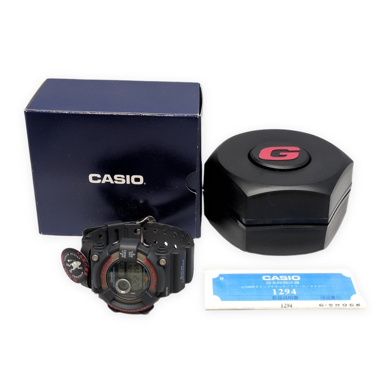 | コメント | 1995年6月に発売された、2代目FROGMAN(フロッグマン)のファーストモデル。ケースには軽量で錆びに強いチタン素材を採用し、ELバックライトが搭載されました。ベゼルとバンドにはダークグレーが採用され、ロゴにはG-SHOCKのブランドカラーであるレッドが配色されています。裏蓋には潜水蛙が刻印されています。 |