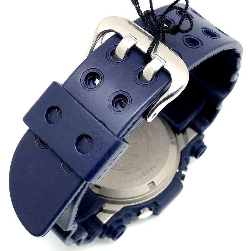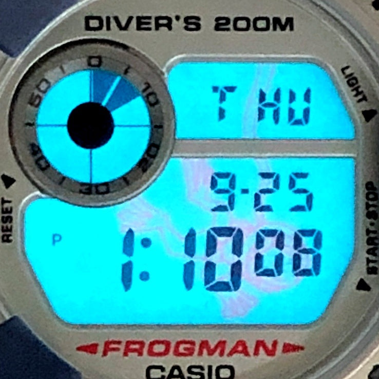 コメント | 1999年12月に発売された、海と陸をテーマにした「MEN IN NAVY & KAHKI(メンインネイビー&カーキ)」のFROGMANです。ベゼルとバンドは深い海を表現したネイビーブルーを、ロゴにはアクセントカラーにイエローが配色されています。裏蓋には潜水蛙が刻印され、ELバックライト発光時には潜水ヘルメットを装着したカエルが浮かび上がります。 |