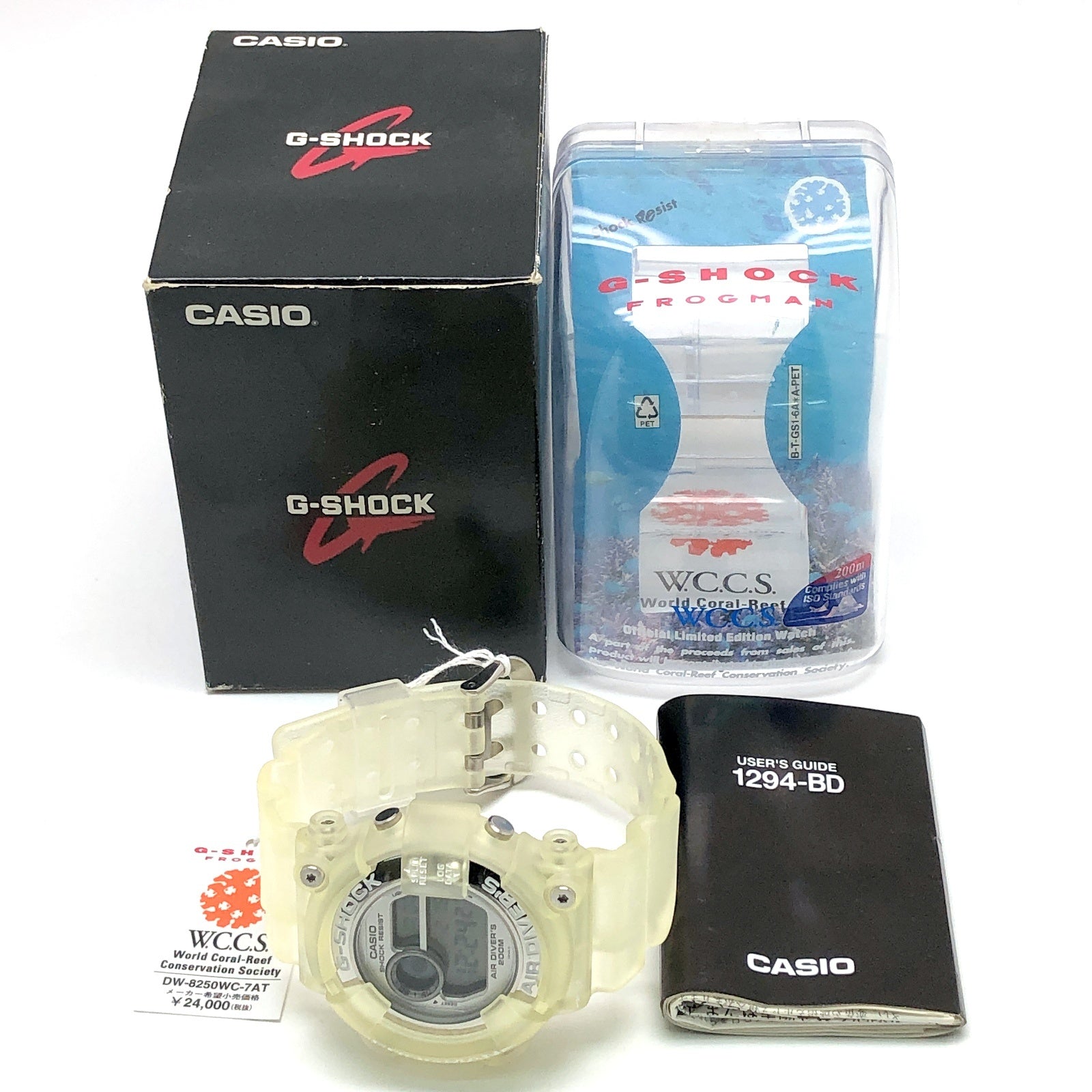 | コメント | 1997年5月に発売された初代WCCSフロッグマン。G-SHOCKは1994年に設立された世界サンゴ礁保護協会(WCCS)を1997年からオフィシャルサポートを開始。FROGMANは同時に2カラーが発売され、DW-8250WC-7ATはホワイトロゴ(白文字)、ベゼルとバンドにはホワイトスケルトン樹脂が採用され、ケースには磨きをかけてミラー調に仕上げられたステンレススチールが採用されています。裏蓋はスクリューバック仕様で、WCCSのシンボルマークが刻印されています。ELバックライト発光時にはマンタが浮かび上がります。モデルネームはペクティニアビガー。 |