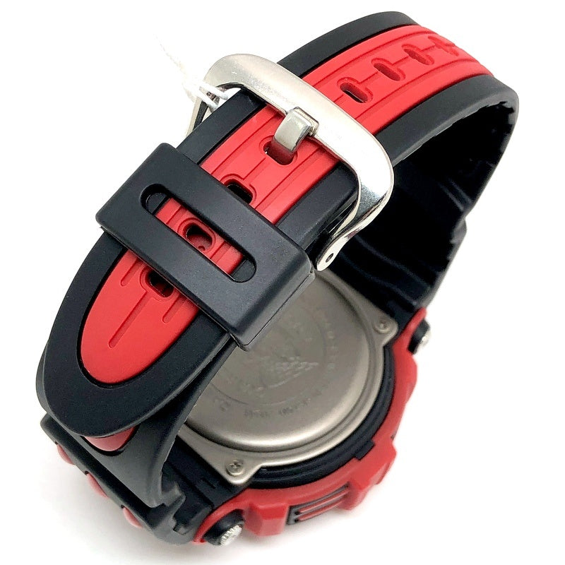 | コメント | 1998年7月に発売された、アメリカ合衆国・日本・カナダ・イギリス・ブラジル・南アフリカ共和国などの世界14カ国で街の平和と安全を守るボランティア自警団体「Guardian Angels(ガーディアンエンジェルス)」のオフィシャルコラボレーションモデル。ベースには世界で初めて強負荷(多量の電力消費)のかかる時計に、光を当てると充電されるソーラーパネル(タフソーラー)が搭載されたRAYSMANのDW-9300を採用。ガーディアンエンジェルスのカラーであるレッドを基調にデザインされており、ベゼルリングには彼らの信念である「We Dare to Care」と「Safety Patrol」の文字が刻まれています。裏蓋にはシンボルマークが刻印され、ELバックライト発光時にも同様のマークが浮かび上がります。 |