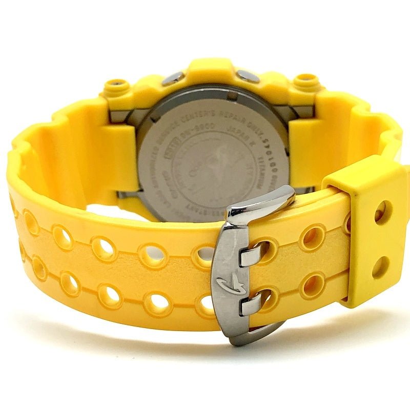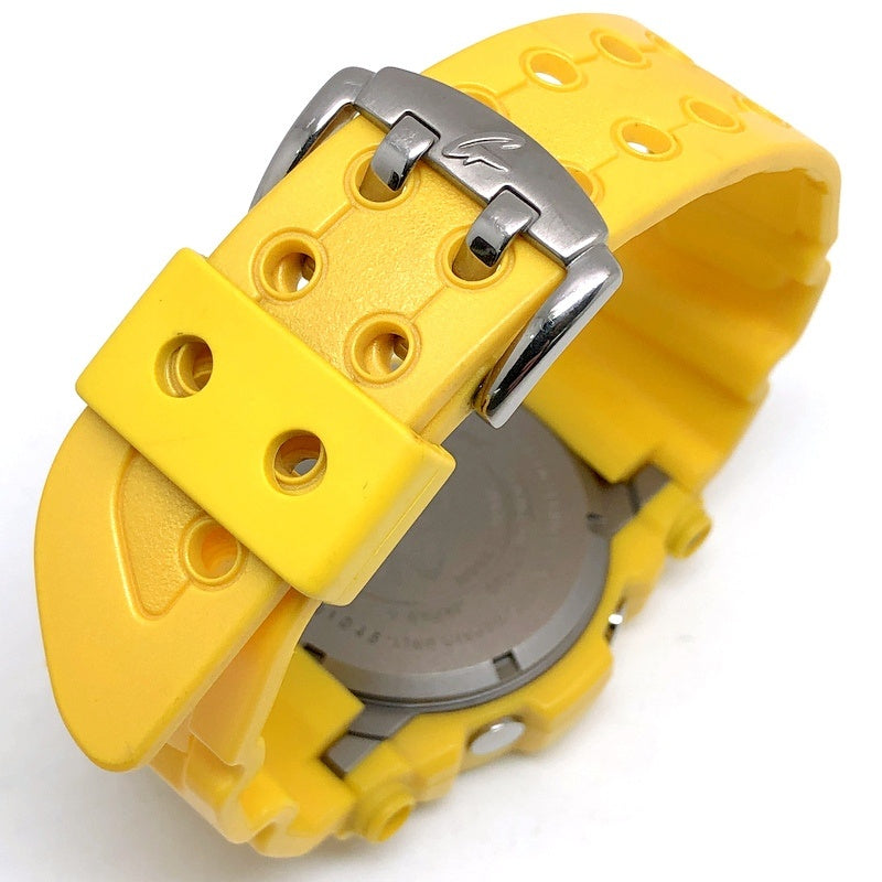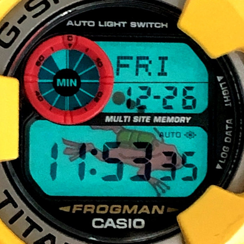 | コメント | 2001年3月に発売された3代目フロッグマン。全身にパール調のイエローメタリック塗装が施されています。MIN表示の枠の赤色がアクセントカラーとなり存在感のあるGショックです。裏蓋には潜水蛙が刻印され、バックライト発光時にも潜水蛙が浮かび上がります。 |