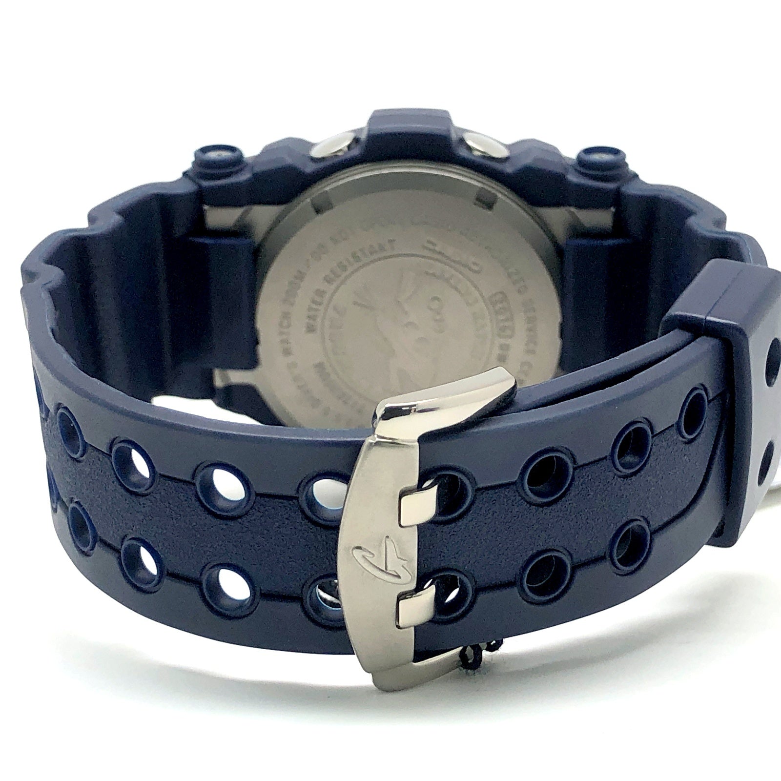 | コメント | 1999年12月に発売された、海と陸をテーマにした「MEN IN NAVY & KAHKI(メンインネイビーアンドカーキ)」です。ベースには小型化された3代目フロッグマンDW-9900が採用され、ベゼルとバンドは深い海を表現したネイビーブルーを、ロゴにはアクセントカラーにイエローが配色されています。裏蓋には潜水蛙が刻印され、ELバックライト発光時にはシュノーケリングを楽しむ蛙が浮かび上がります。 |