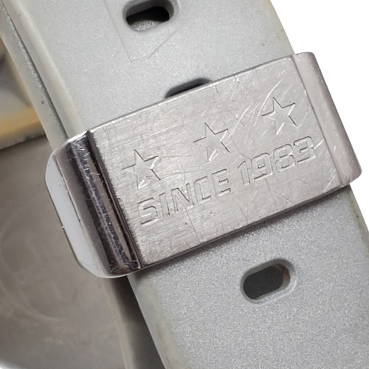 状態詳細 | G-SHOCK 30周年を記念して発売されたDW6930BS-8JRモデルです。特徴的な3つ目デザインはそのままに、30周年記念モデルならではの特別なカラーリングが施されています。デジタル表示で時刻を確認しやすく、ストップウォッチやアラームなど、日常使いに便利な機能も搭載。全体的に使用感があり、ベルトに汚れヤケによる変色、スレ傷が見られますが、まだまだご使用いただけるお品です。 |
