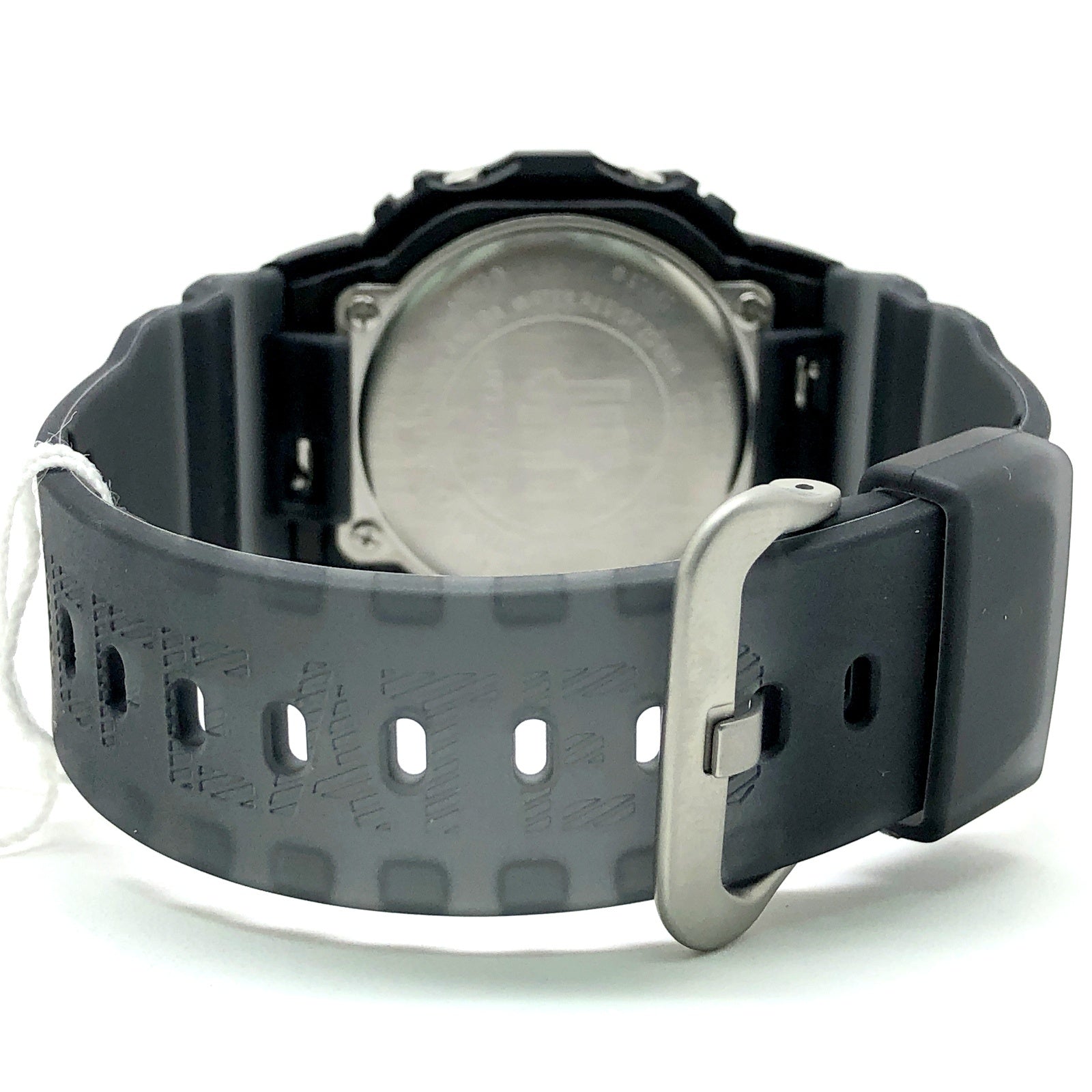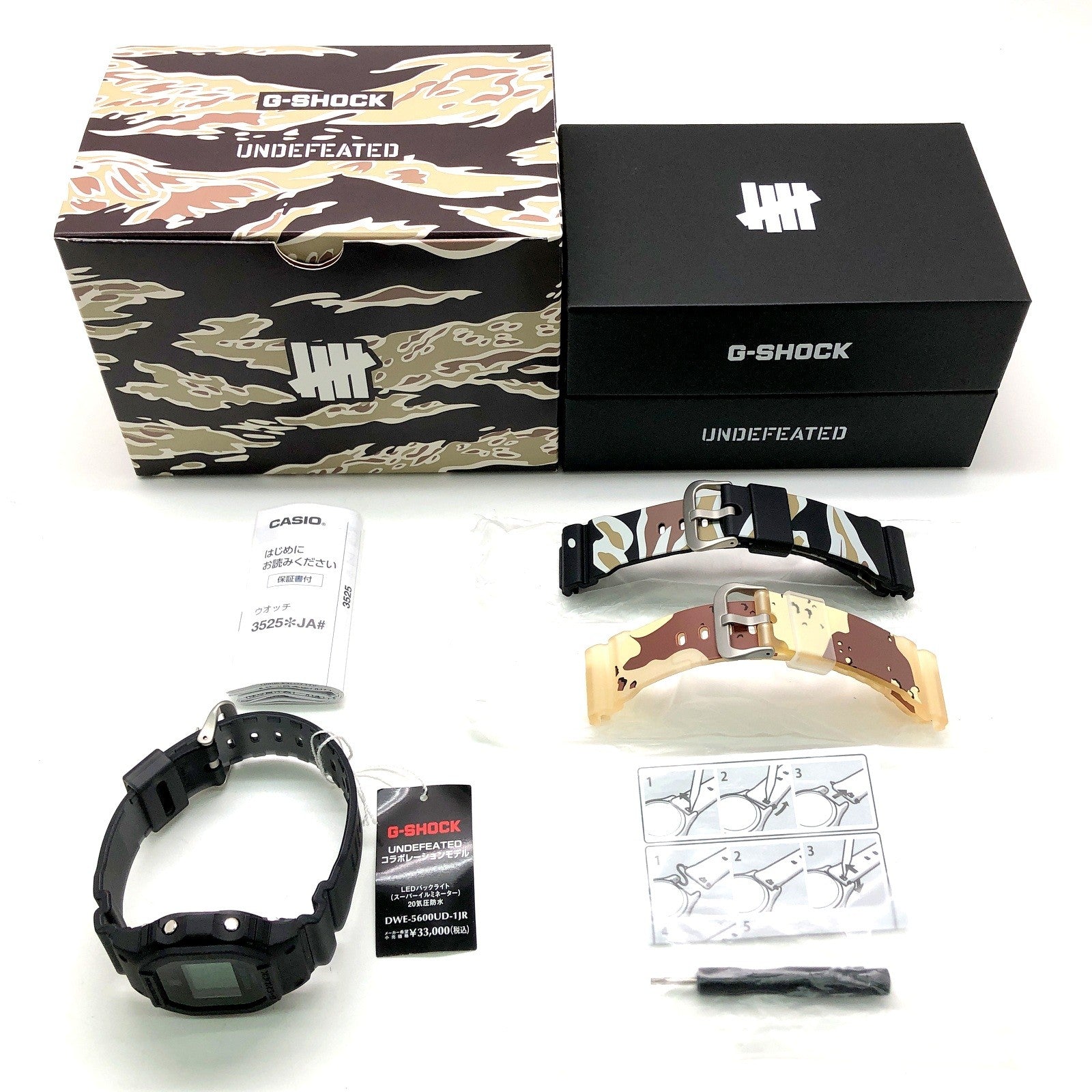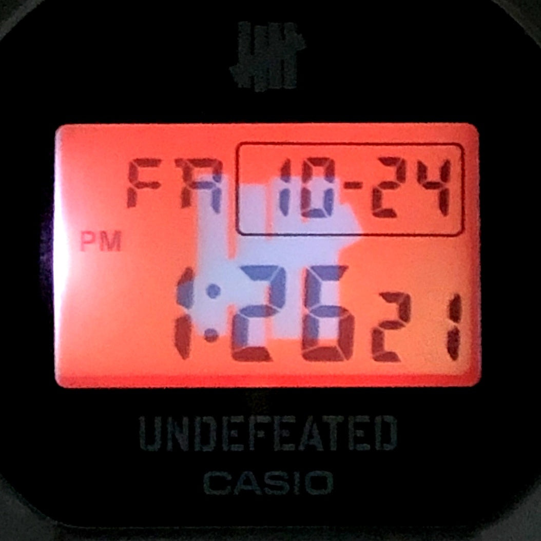 | コメント | 2025年5月に発売された、アメリカ・ロサンゼルスで創業したオリジナルブランドとスニーカーを取り扱うショップ「UNDEFEATED(アンディフィーテッド)」とのコラボレーションモデル。ベースにはスクエアデザインが人気の5600シリーズで、バンドの付け替えが可能なDWE-5600を採用。ベゼルにはブラックが採用され、液晶にはグリーン液晶が採用されています。バンドにはロゴがデザインされたメインのハーフスケルトンバンドに加え、タイガーカモパターンとストームカモパターンの2種類の迷彩柄バンドが付属し、スタイルによって付け替えが可能です。裏蓋にはファイブストライクスロゴが刻印され、LEDバックライト発光時にも同様のロゴが浮かび上がります。 |