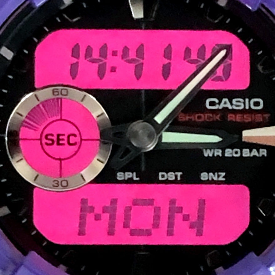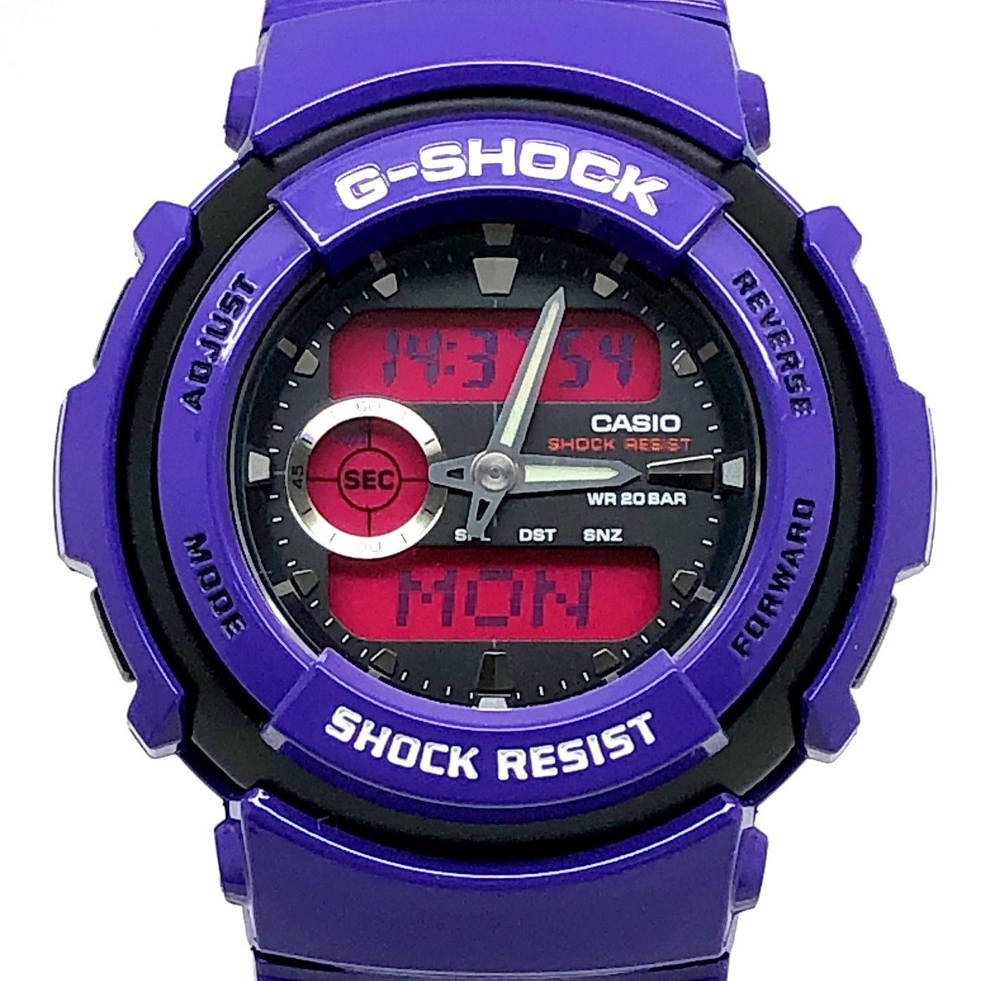 | コメント | 2009年5月に発売された、個性的なカラーリングが人気の「Crazy Colors (クレイジーカラーズ)」。ベースにはメタルベゼルが採用されたアナログ/デジタルモデルG-SPIKEのG-300を採用。ベゼルとバンドには光沢塗装が施されたパープル、アルミ製のメタルベゼルにはブラック、液晶にはピンクが配色されています。 |