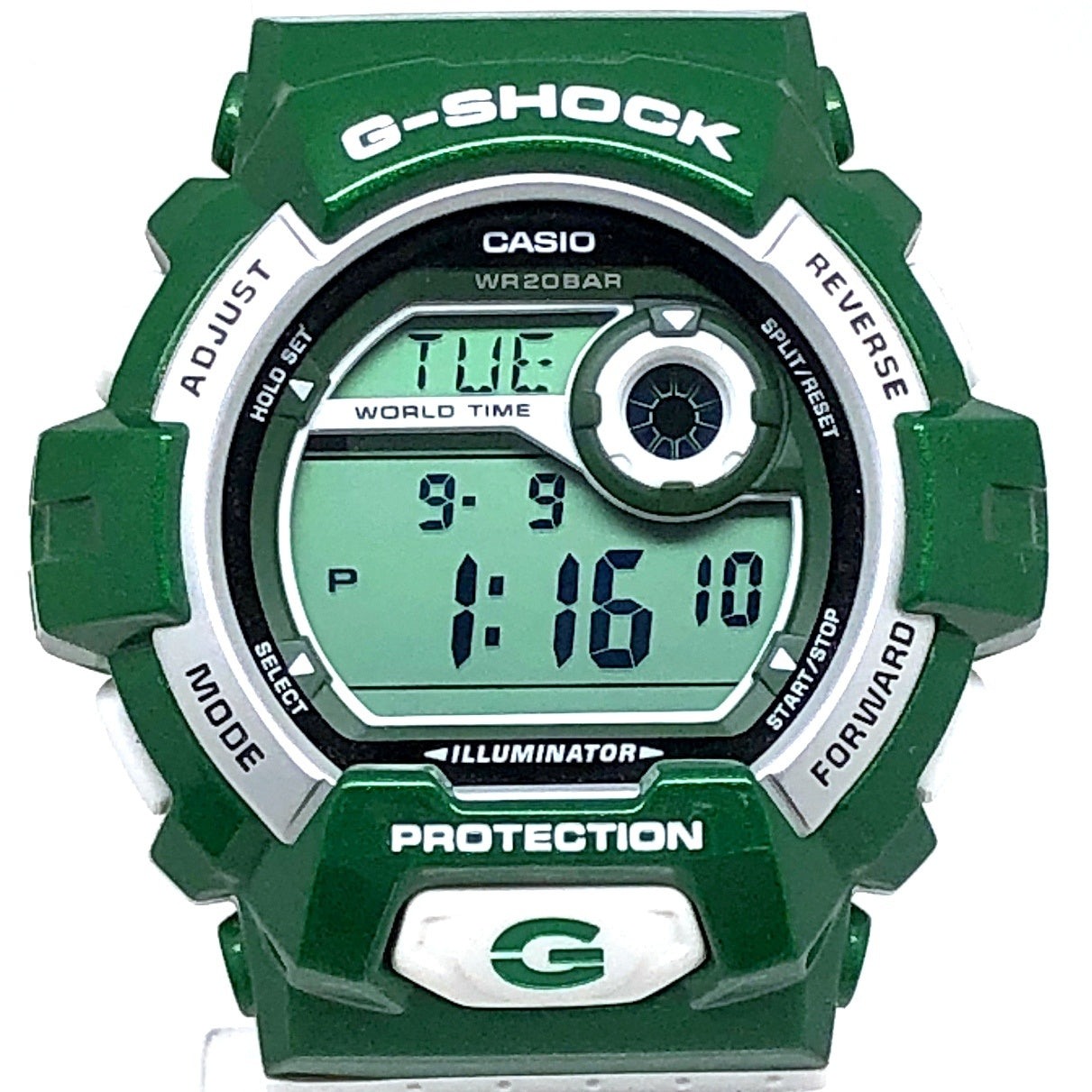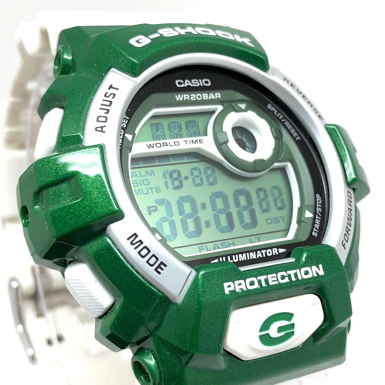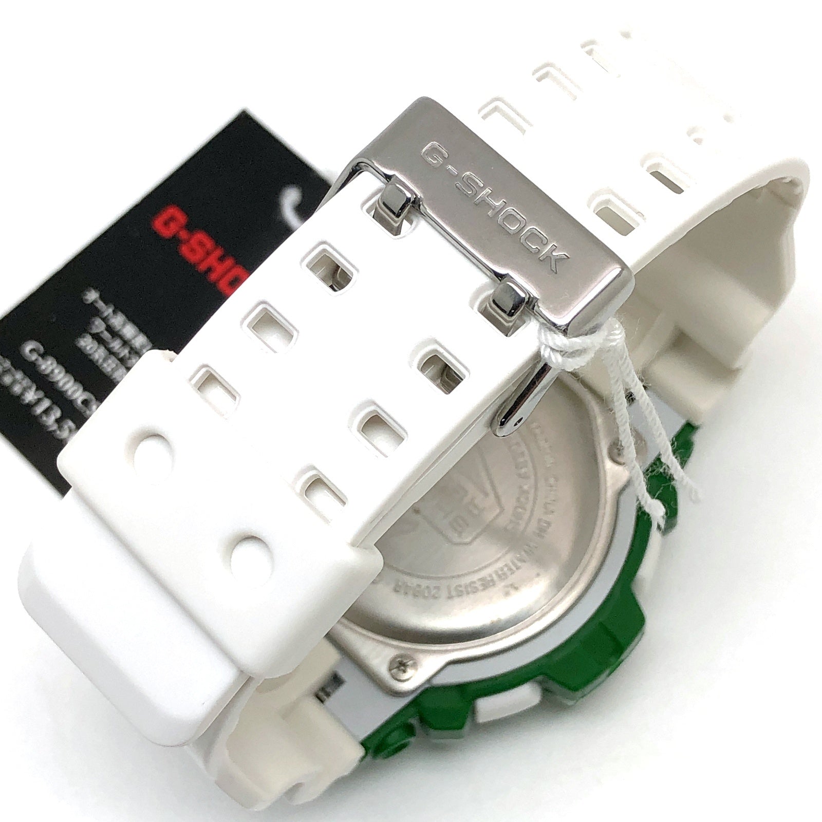 コメント | 2014年7月に発売された「Crazy Colors(クレイジーカラーズ)」。ベースにはアルミのベゼルリングが採用されたビッグケースのデジタルモデルG-8900を採用。ベゼルにはメタリック塗装が施されたグリーンを、バンドには光沢塗装が施されたホワイトが配色され、液晶にもグリーンが採用されています。強烈な個性を放つカラーリングが魅力的なG-SHOCKです。 |