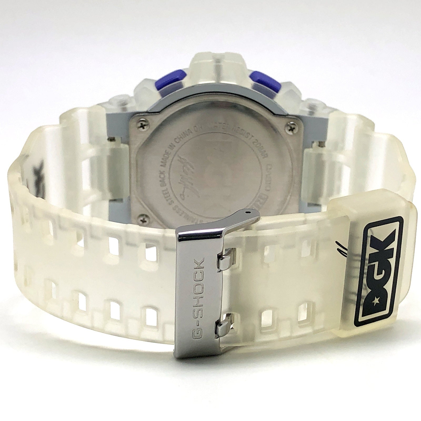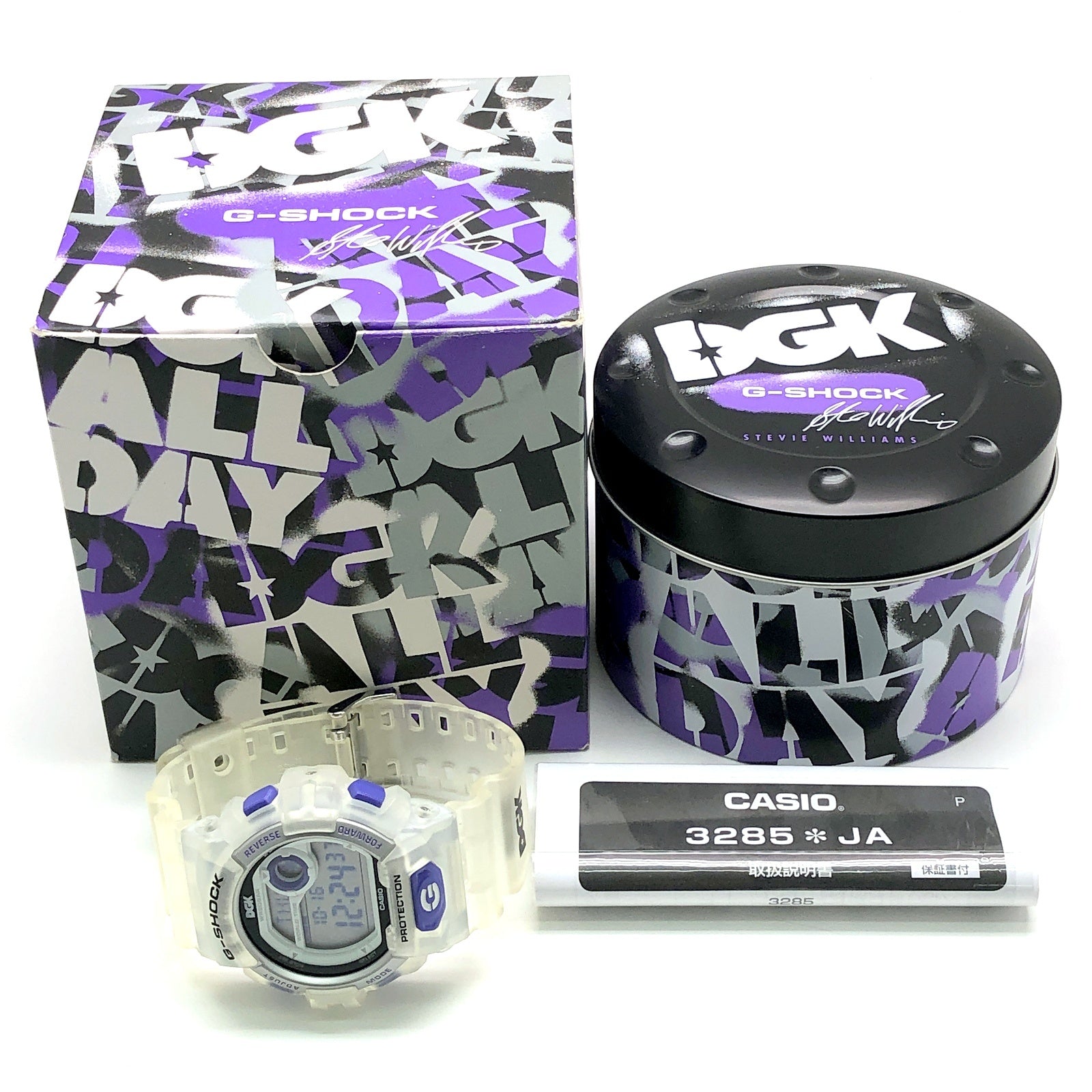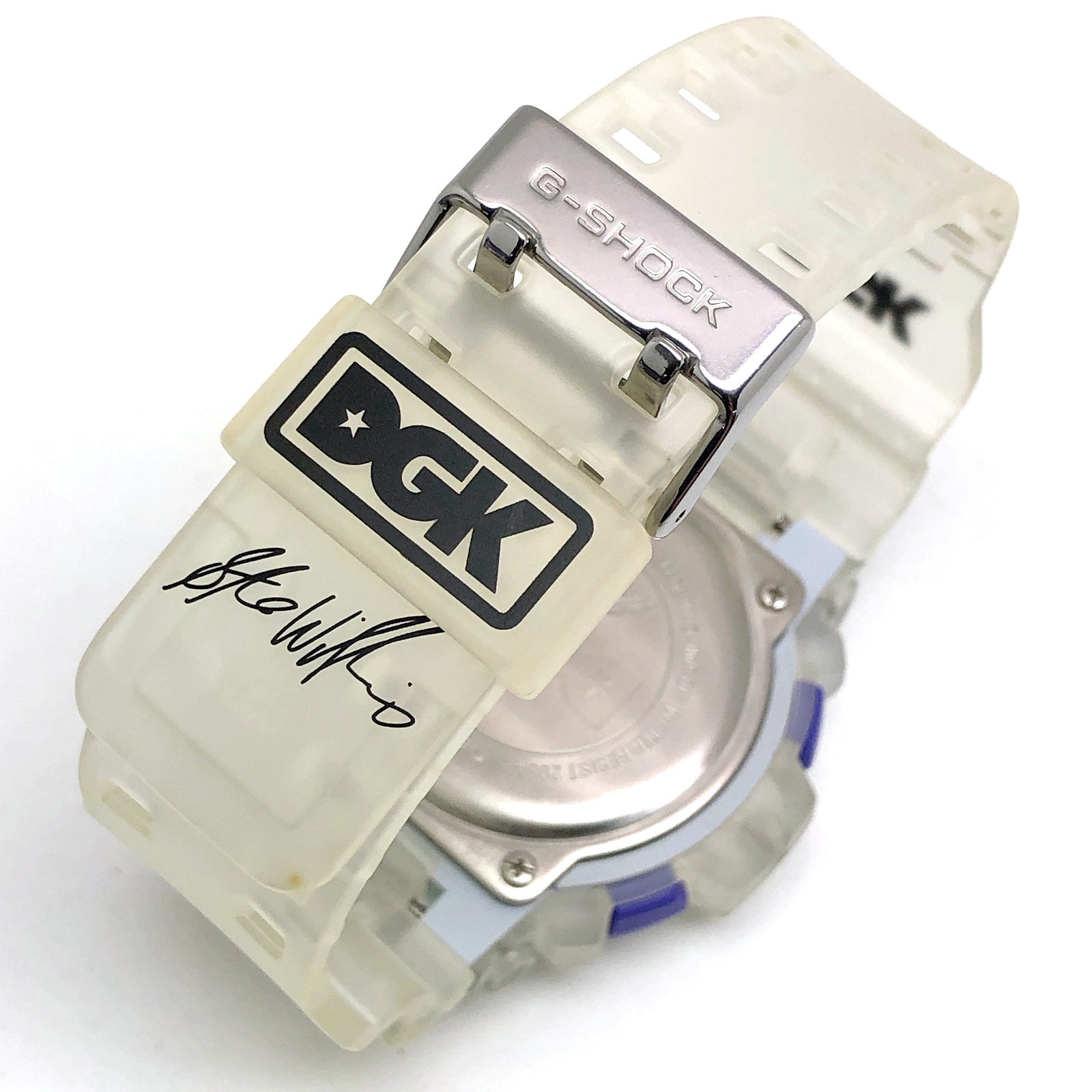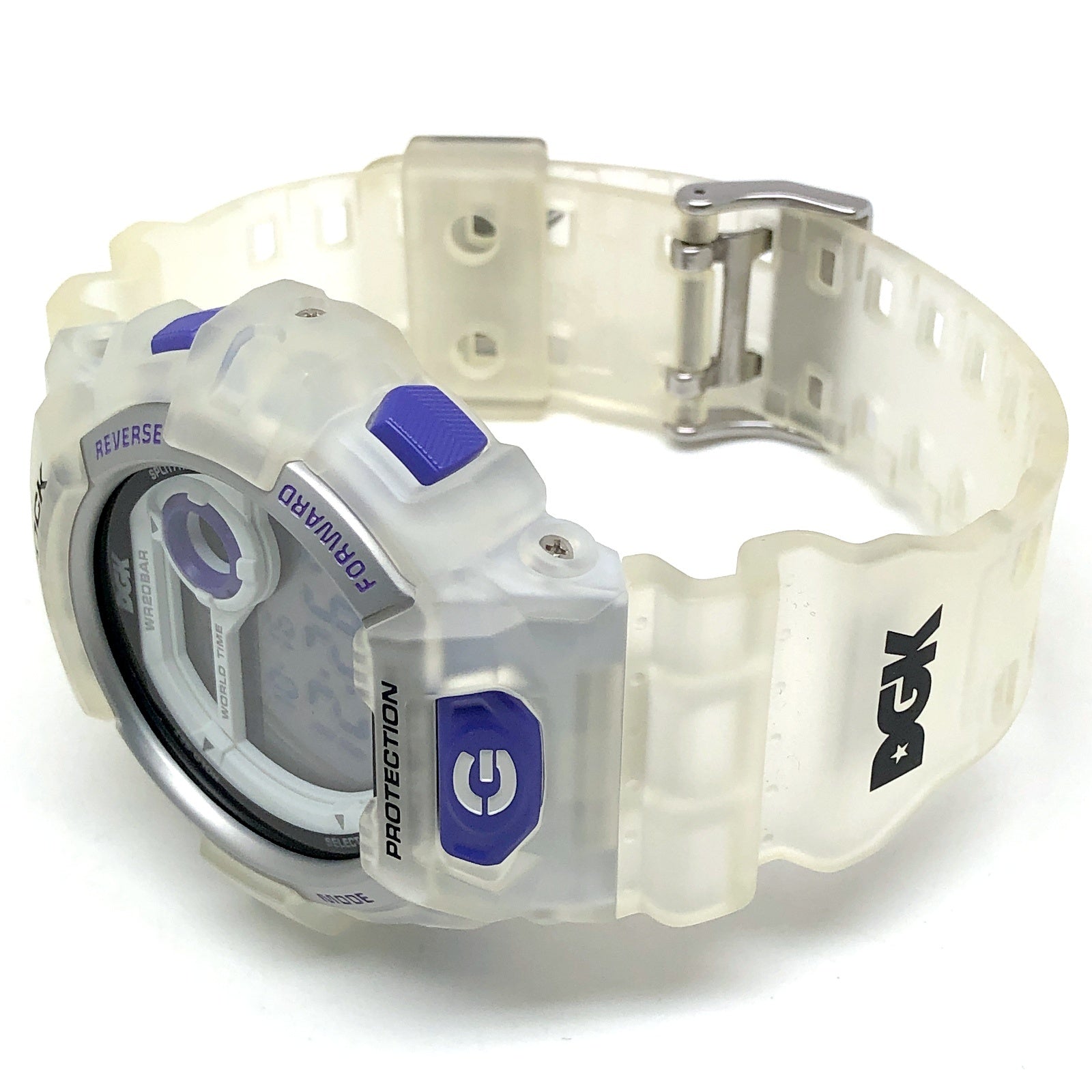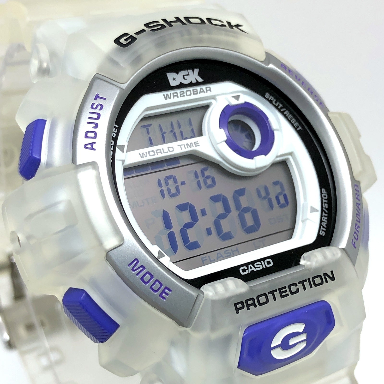 | コメント | 2012年12月にGショック誕生30周年を記念して発売された、プロスケートボーダーの「Steive Williams(スティービーウィリアムズ)」が展開するアパレルブランド「DGK(ディージーケー)」とのスペシャルコラボレーションモデル。ベースにはビッグケースの人気モデルG-8900を採用。ベゼルとバンドにはマットなホワイトスケルトンを採用し、文字盤やボタンには、「DGK」のブランドカラーであるパープルが配色されています。バンドにはブランドのロゴとサインがプリントされ、裏蓋にも同様のロゴとサインが刻印されています。LEDバックライト発光時にもロゴが浮かび上がります。 |