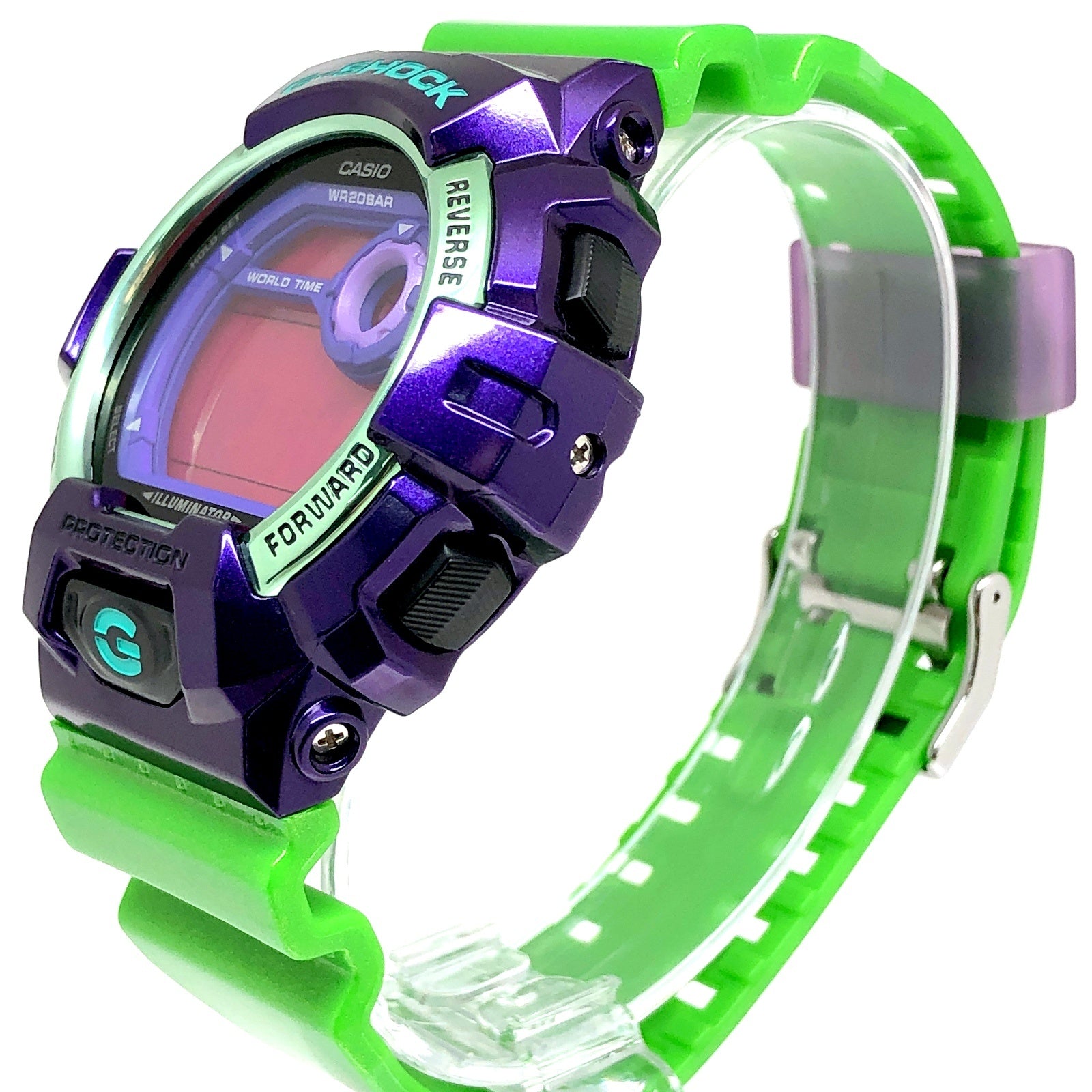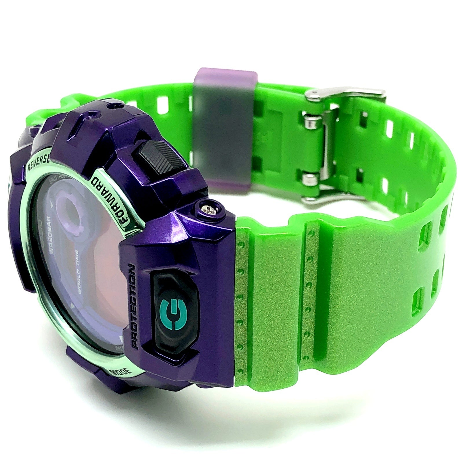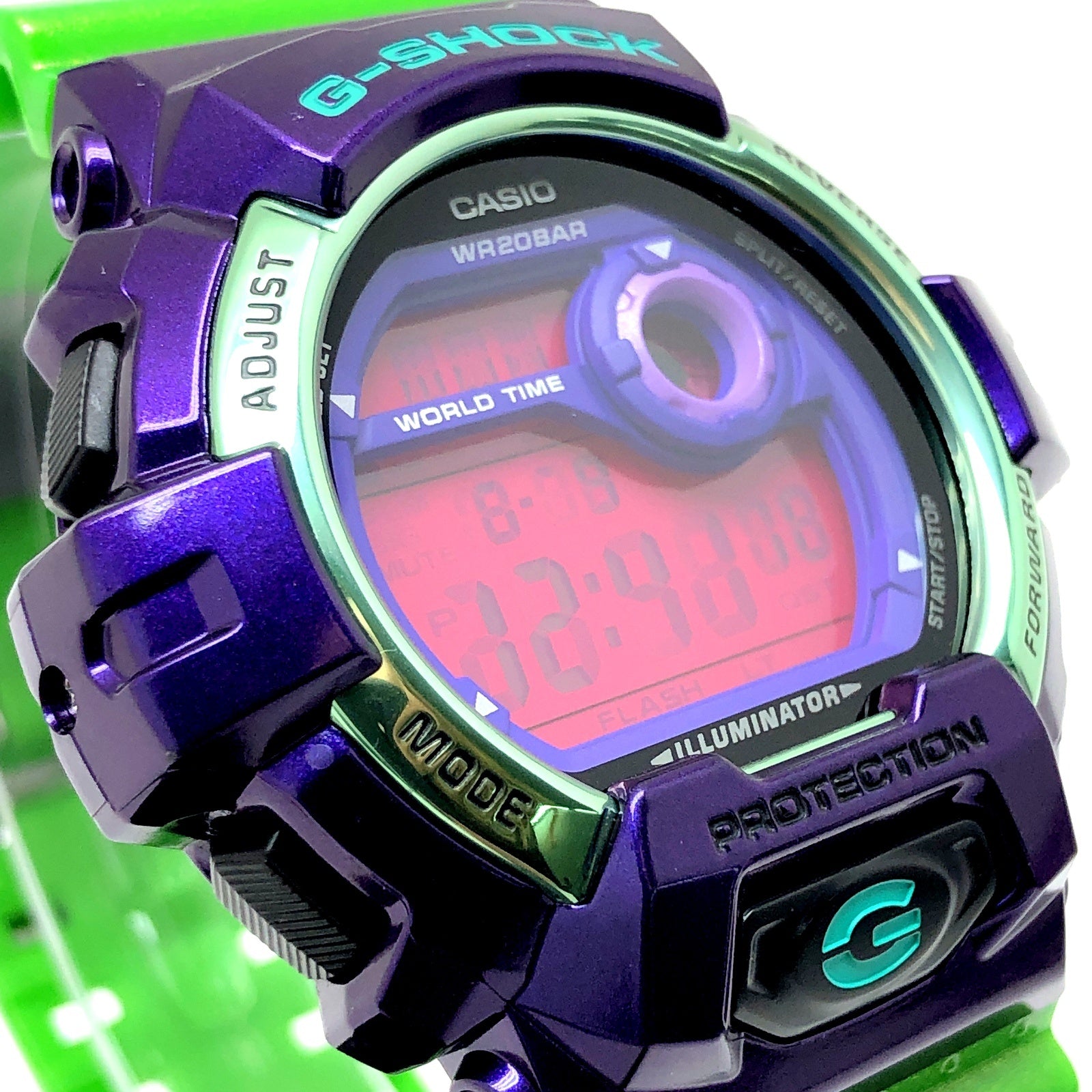 コメント | 2013年7月に発売された「Crazy Colors(クレイジーカラーズ)」。ベースにはアルミのベゼルリングが採用されたビッグケースのデジタルモデルG-8900を採用。ベゼルにはメタリック塗装が」施されたパープルを、バンドには同じくメタリック塗装が施されたグリーンが配色され、液晶にはピンク反転液晶が採用されています。強烈な個性を放つカラーリングのG-SHOCKです。 |