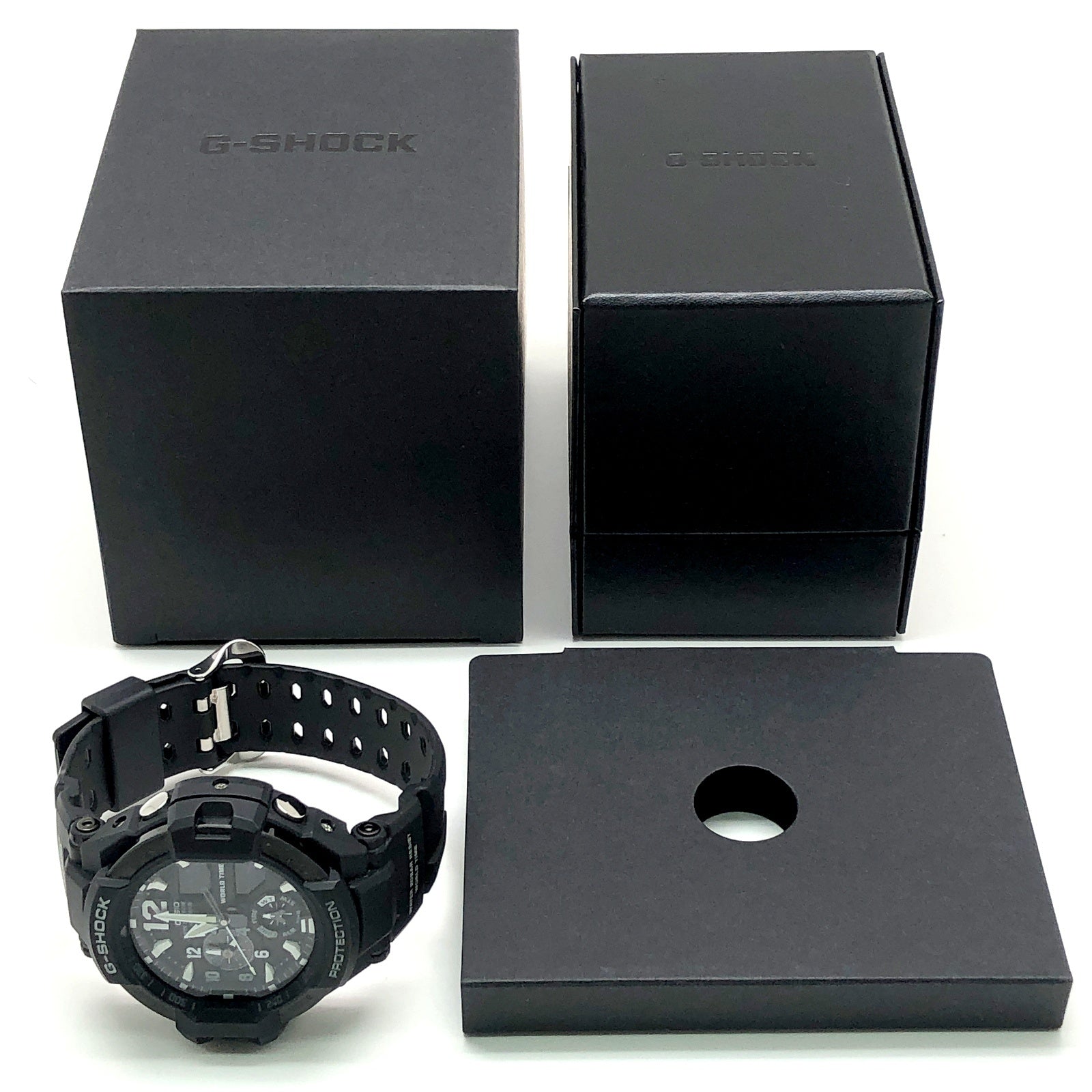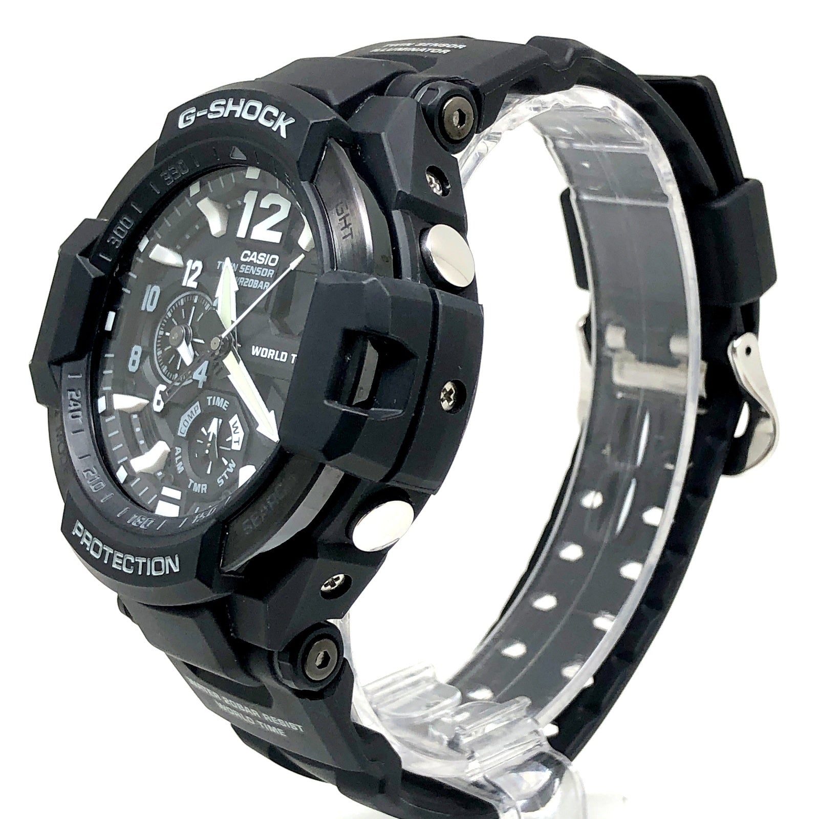 | コメント | 2015年4月に発売された、世界で活躍するパイロットのためのG-SHOCKである「GRAVITYMASTER(グラビティマスター)」の、方位と温度が計測できるツインセンサーとワールドタイムを搭載したモデルです。ベゼルはバンドにはスタンダードなブラックを配色し、インダイヤルの文字などにアクセントカラーとしてホワイトが配色されています。バックライトには高輝度LEDライトが搭載され、実用性の高いG-SHOCKです。 |