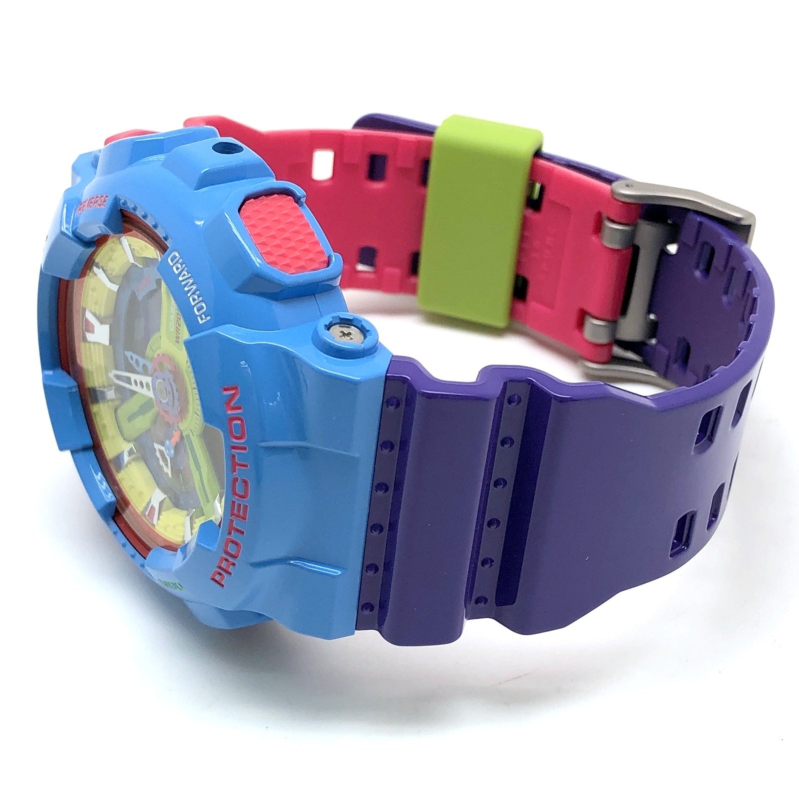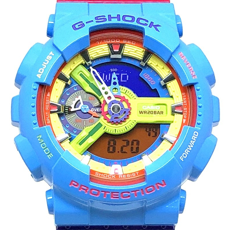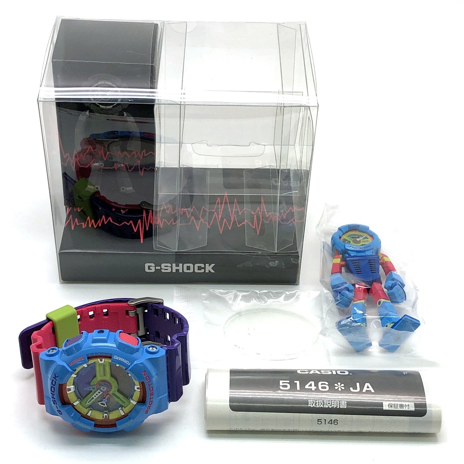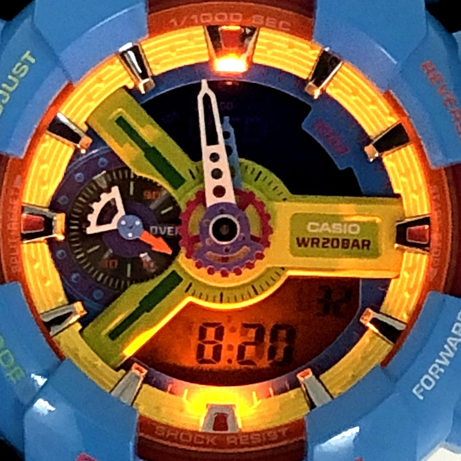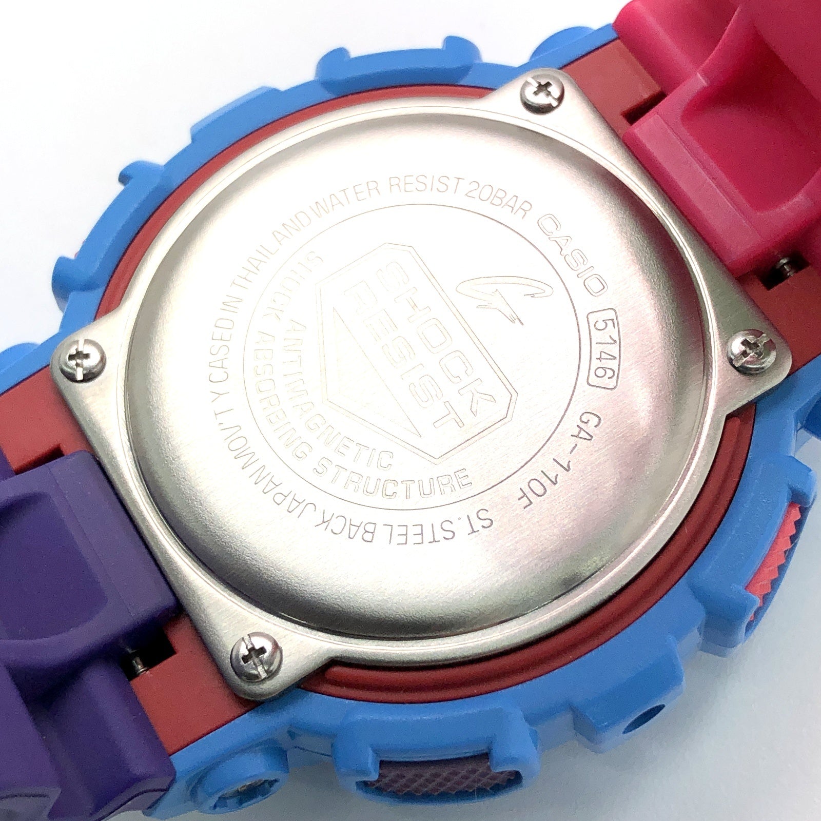 コメント | 日本のキャラクターデザイナーである中野シロウ氏が代表を務めるデザインチーム「play set products」が書き下ろしたG-SHOCK MAN(ジーショックマン)のフィギュアとG-SHOCKがセットになった「MAN BOX(マンボックス)」。2009年~2011年にかけてG-SHOCKが3モデル、BABY-Gが1モデルの合計4モデルが発売。GA-110F-2は2010年3月に発売され、ベースには様々なパーツを複雑に組み合わせたビックケースのアナログ/デジタルモデルGA-110を採用。光沢塗装が施されたベゼルにはライトブルー、バンドにはピンクとパープルが配色され、文字盤にも様々なカラーが配色されたマルチカラーダイヤルが採用されています。 |