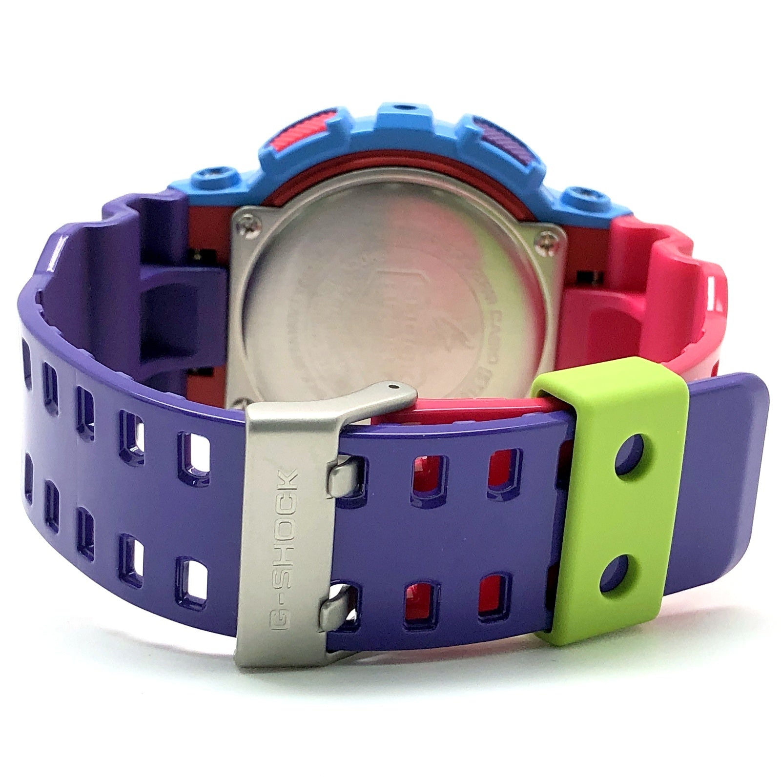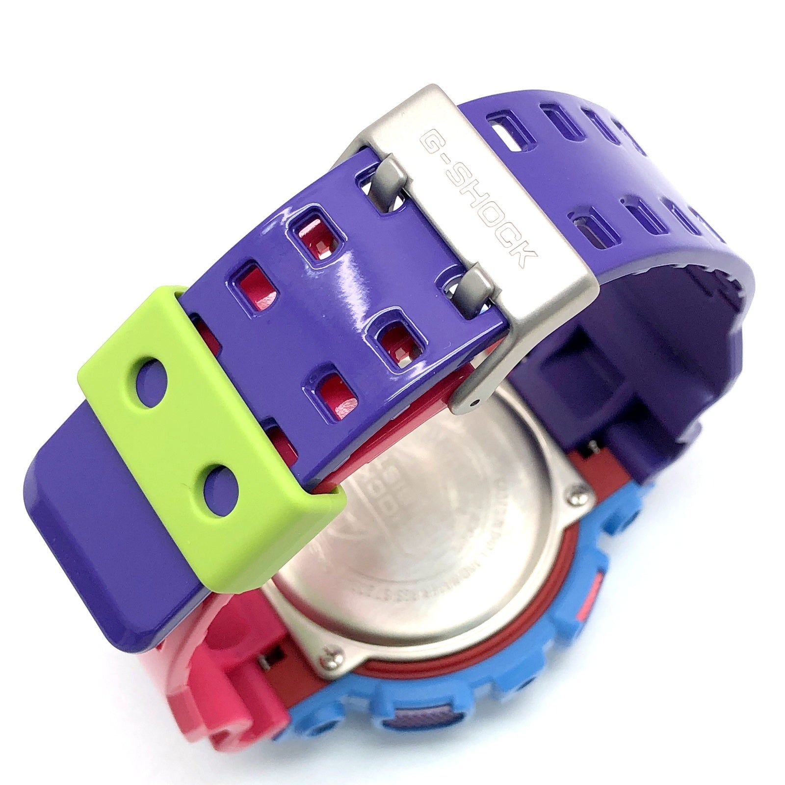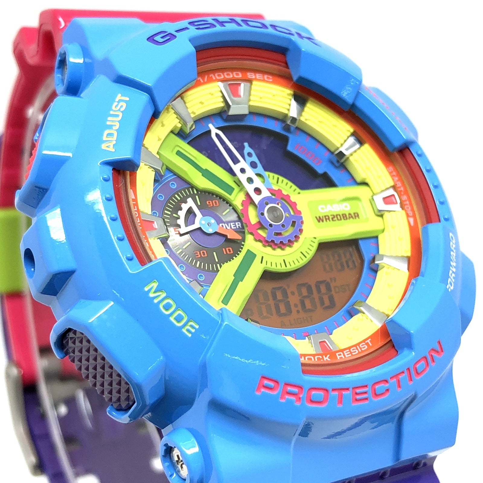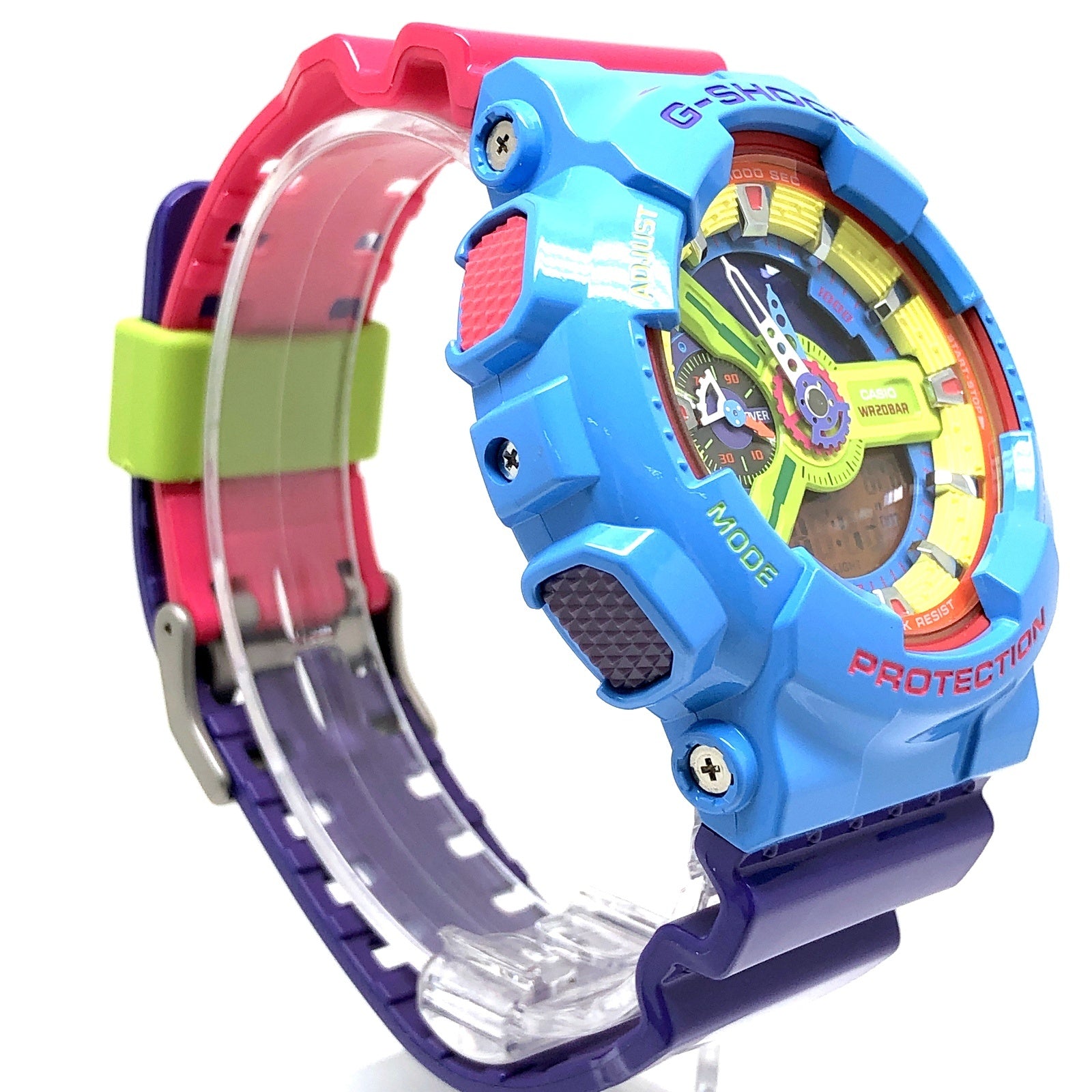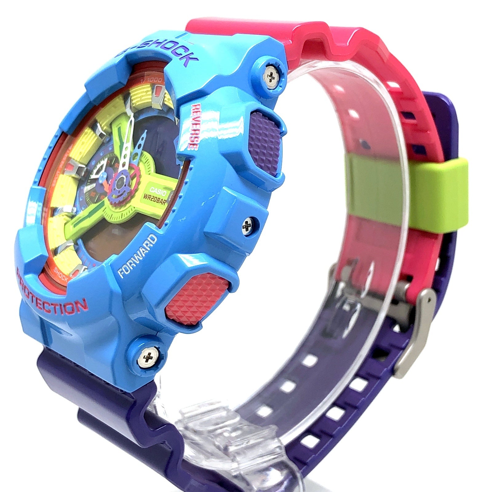 コメント | 日本のキャラクターデザイナーである中野シロウ氏が代表を務めるデザインチーム「play set products」が書き下ろしたG-SHOCK MAN(ジーショックマン)のフィギュアとG-SHOCKがセットになった「MAN BOX(マンボックス)」。2009年~2011年にかけてG-SHOCKが3モデル、BABY-Gが1モデルの合計4モデルが発売。GA-110F-2は2010年3月に発売され、ベースには様々なパーツを複雑に組み合わせたビックケースのアナログ/デジタルモデルGA-110を採用。光沢塗装が施されたベゼルにはライトブルー、バンドにはピンクとパープルが配色され、文字盤にも様々なカラーが配色されたマルチカラーダイヤルが採用されています。 |