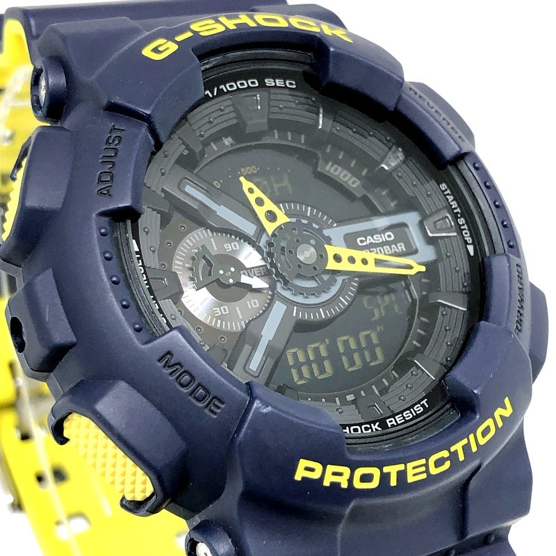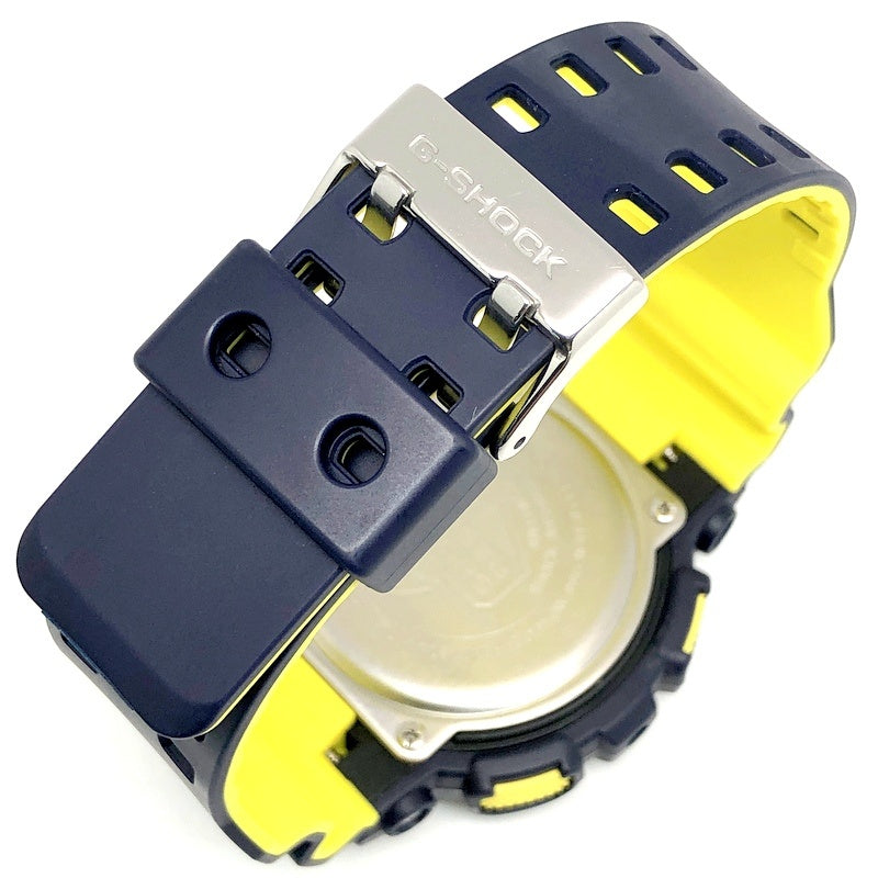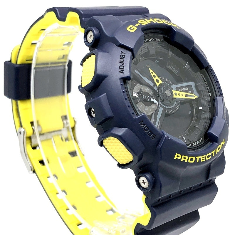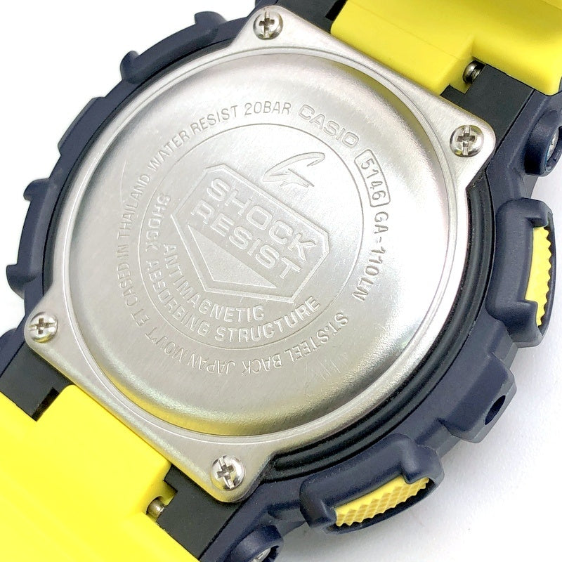 | コメント | 2017年2月に発売された、ハイテクスニーカーやファッション小物に用いられるカラーリングをイメージしたモデル「Layered Neon Color」です。ベースにはビッグケースのアナログ/デジタルモデルのGA-110が採用。ベゼルにはネイビーが採用され、ロゴや時分針、サイドボタンや2色成形バンドに裏面にはイエローが配色されています。 |