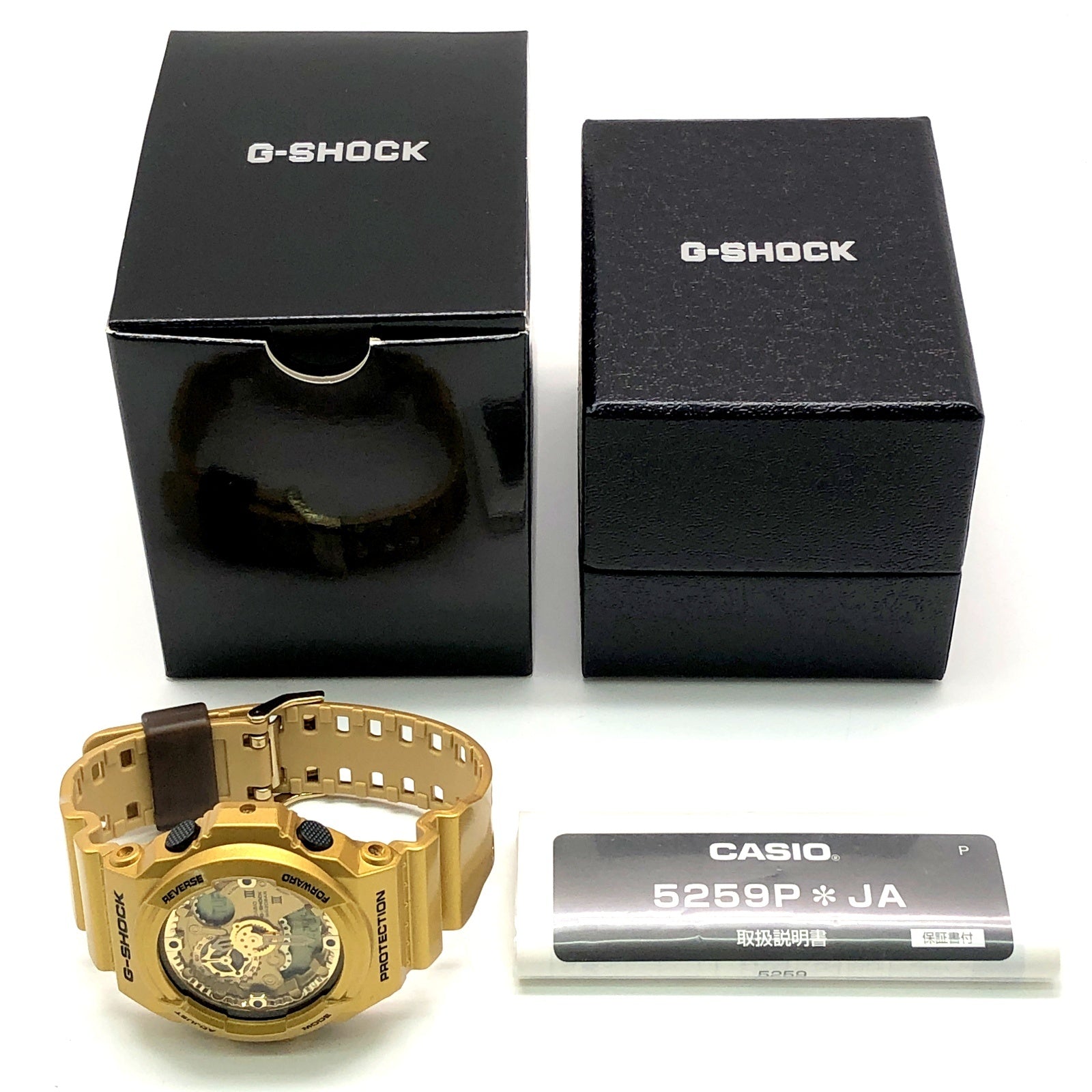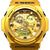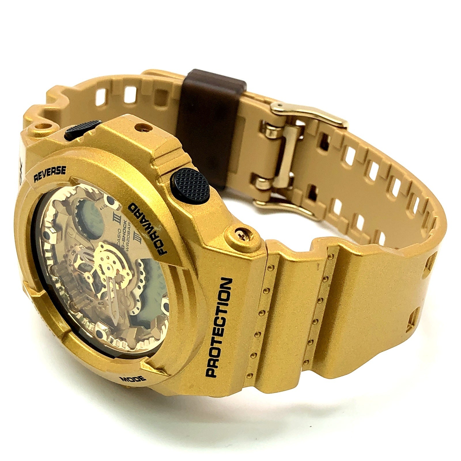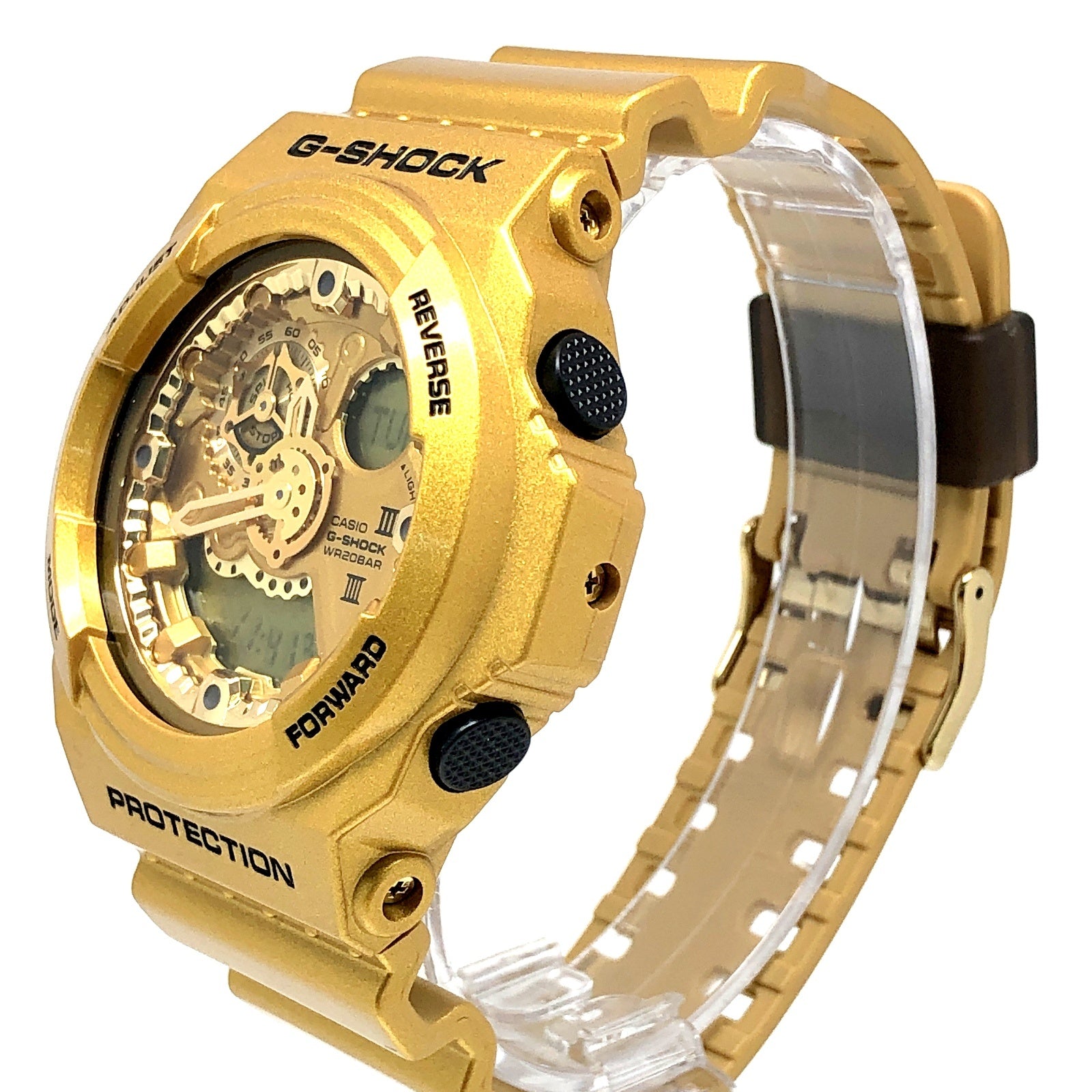 | コメント | 2014年8月に発売された、強烈な個性を放つカラーテーマモデル「Crazy Gold(クレイジーゴールド)」です。ベースには歯車をモチーフにした立体的な文字盤が採用されたビッグケースのアナログ/デジタルモデルGA-300を採用。ベゼルとベルトには、ソリッド感のある鮮やかなダークゴールドが採用され、文字盤やメタルパーツ、液晶に至るまでゴールドカラーで仕上げられています。 |