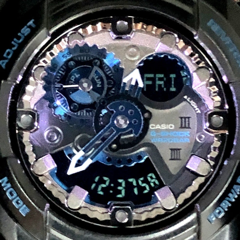 コメント | 2013年1月に、Gショック誕生30周年を記念して発売された限定モデル第2弾「Initial Blue(イニシャルブルー)」。ベースにはビッグケースのアナログ/デジタルモデルに高輝度LEDライトが搭載されたGA-300が採用され、ブラックを基調に、夜明け前の壮厳な空の色をイメージしたブルーが随所に配色されています。遊環には30周年を意味する3つのスターマークがデザインされ、裏蓋には30周年記念ロゴが刻印されています。 |