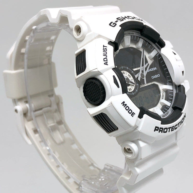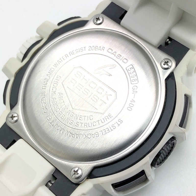 | コメント | 2014年8月に発売された、ビッグケースが人気のアナログ/デジタルモデルに大型のロータリースイッチが搭載されたGA-400のハイパーカラーズ。ベゼルとバンドには光沢塗装が施されたホワイトが採用され、文字盤周りやサイドボタンにはブラックが配色されています。2つの液晶画面には異なるカラーが採用されています。 |