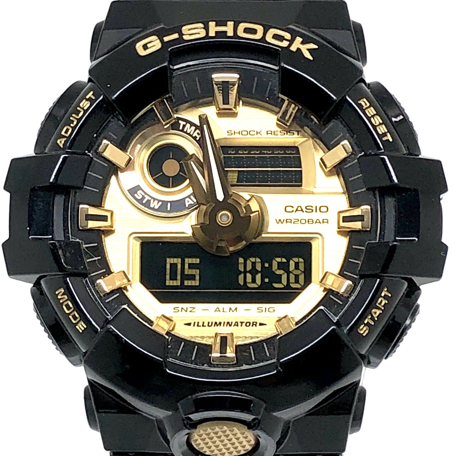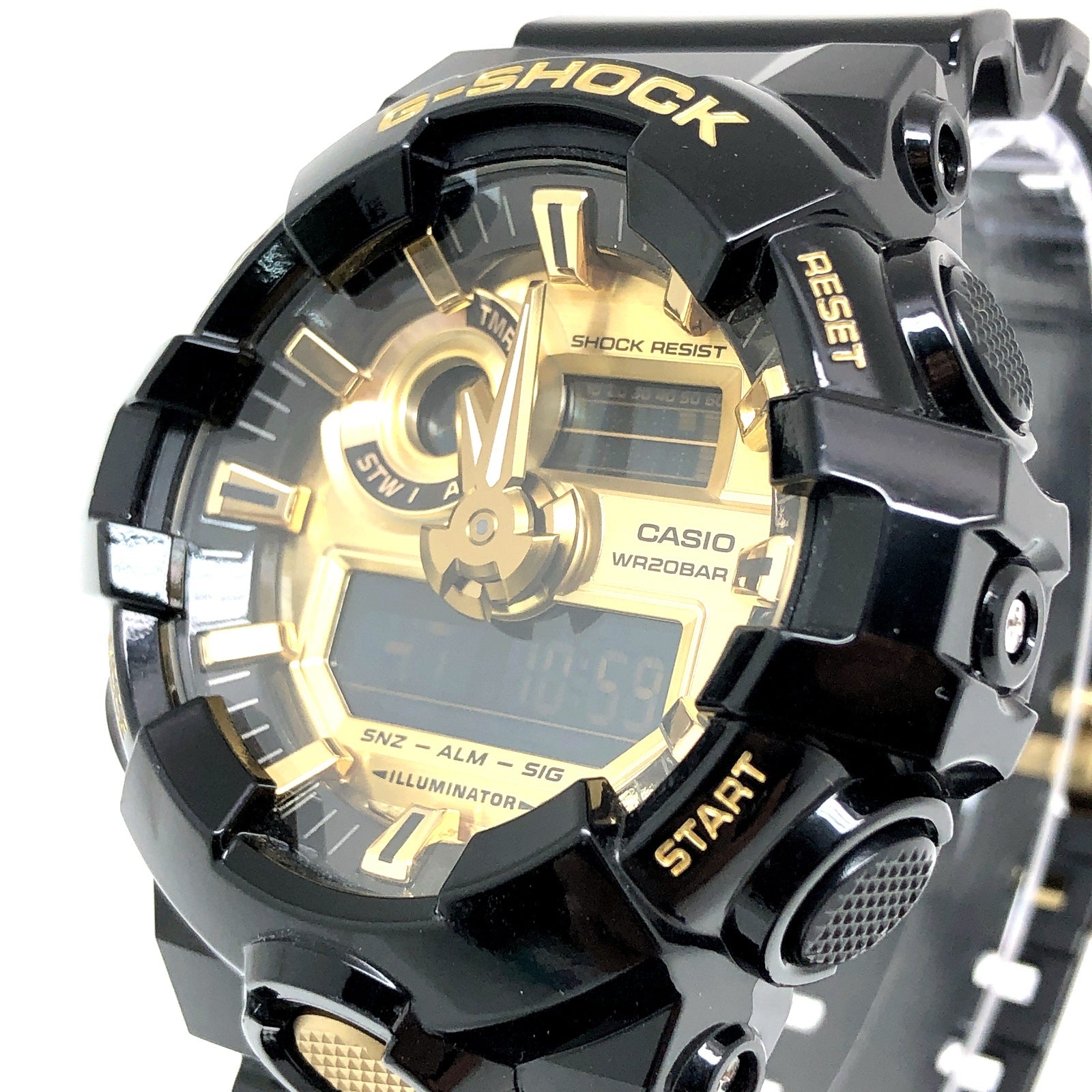 コメント | 2017年2月に発売された、ブレイクダンスを中心としたヒップホップ文化のアイコンであるB-BOYが身に着けるアクセサリーやファッションアイテムをイメージした「Garish Color(ガリッシュカラー)」シリーズ。ベースにはビッグケースが人気のデジタル/アナログモデルGA-700を採用。ベゼルやバンドには光沢塗装が施されたブラックを配色し、ダイヤルやロゴ、尾錠にはゴールドが採用されています。 |