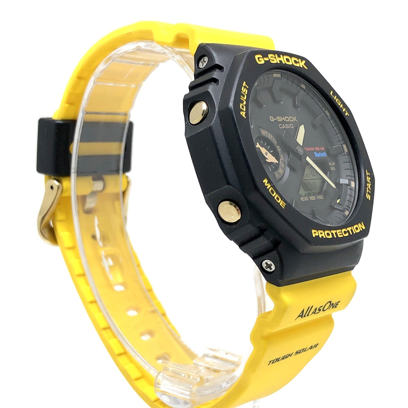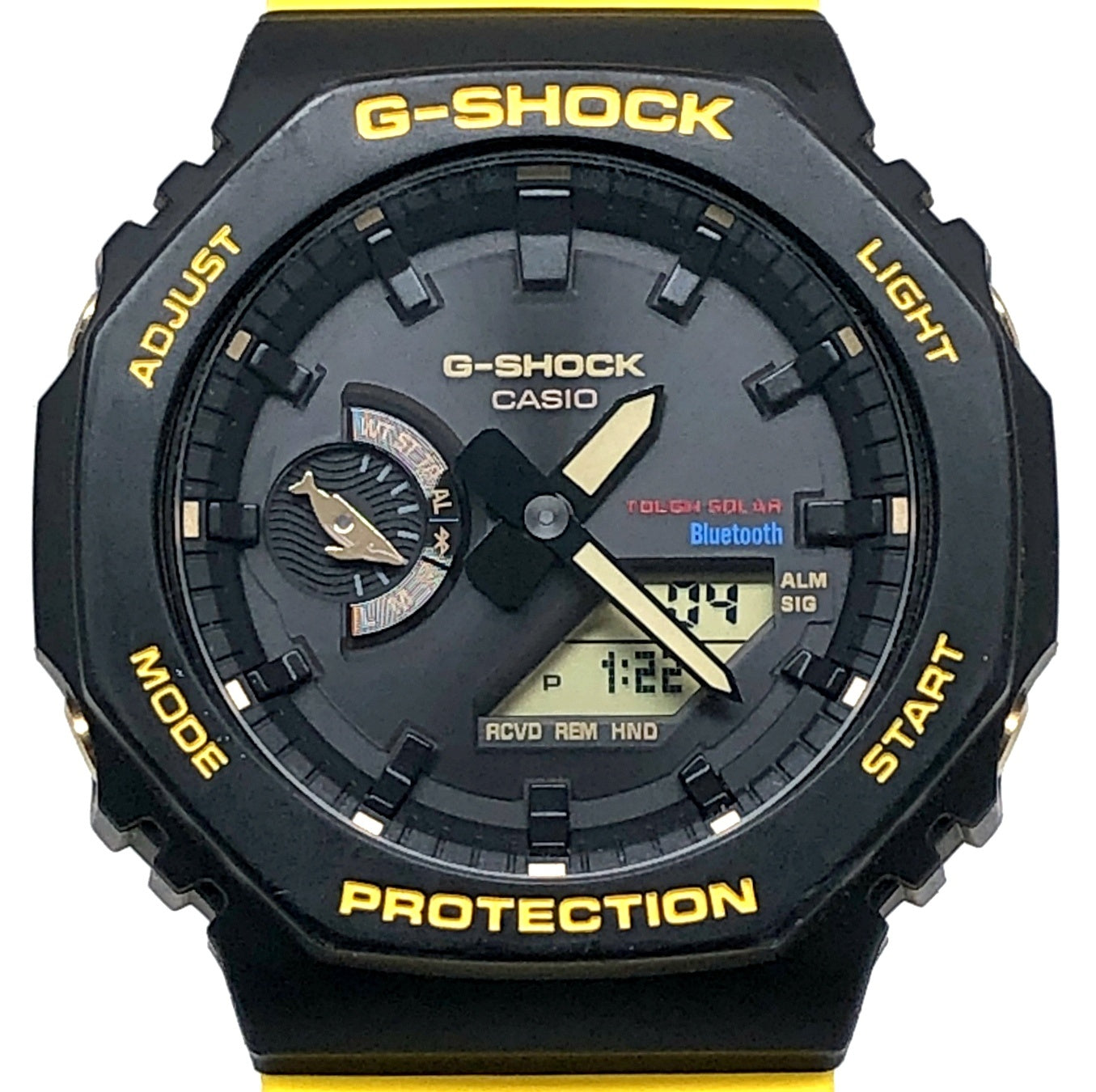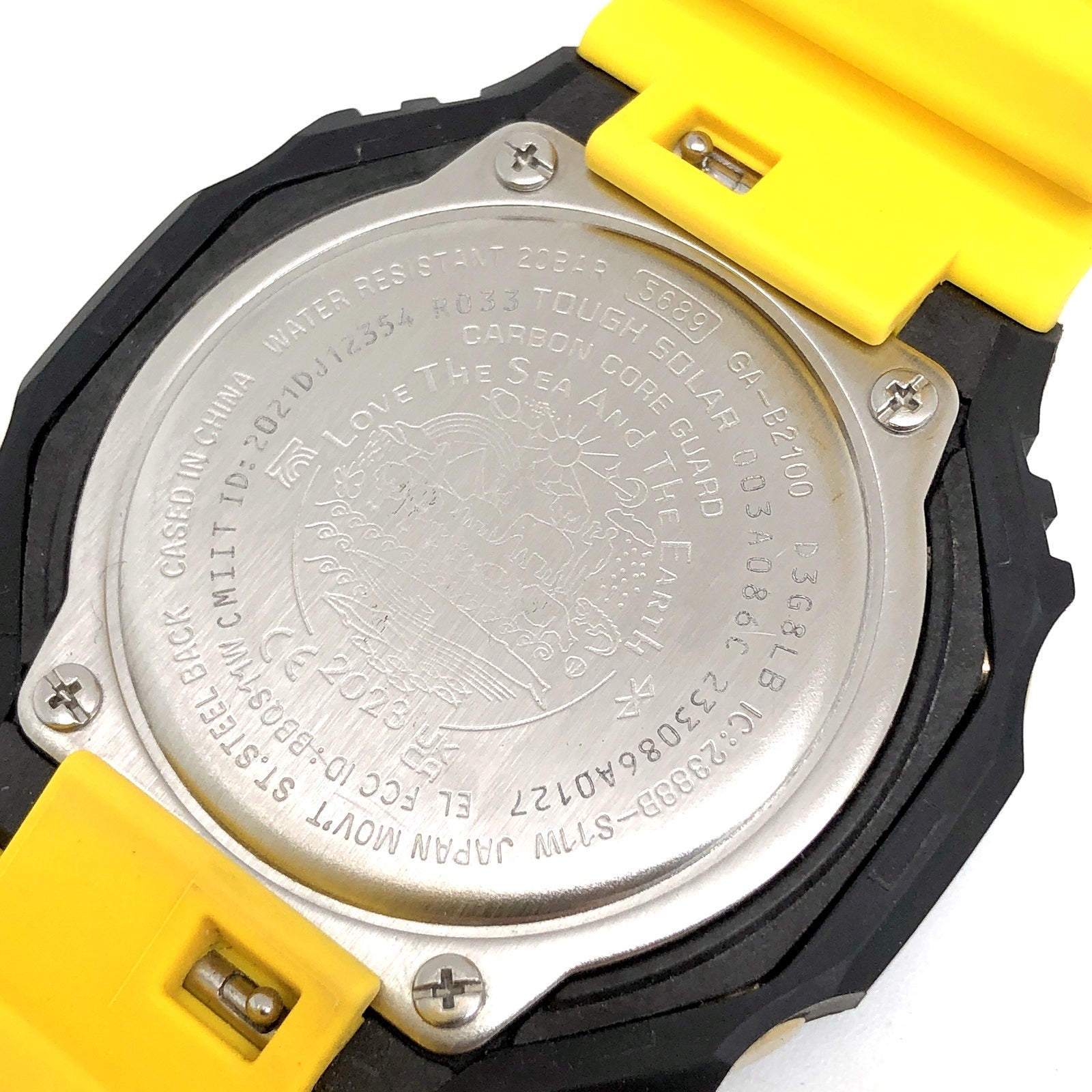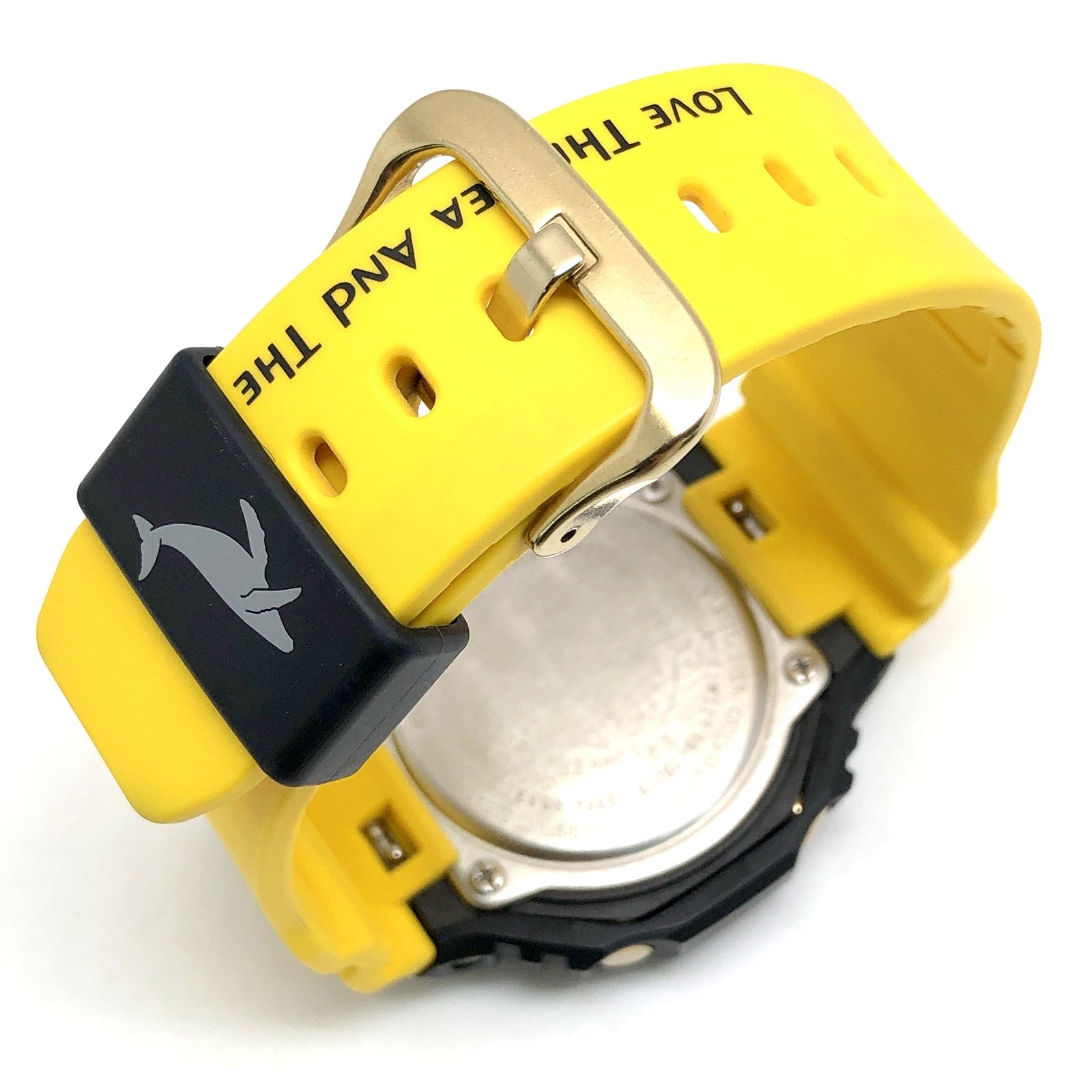 | コメント | 2023年6月に発売されたアイサーチジャパンとのコラボレーションモデルです。初代イルクジモデルDW-6100DWのブラックとイエローのカラーを復刻。ベースモデルはモバイルリンクとタフソーラーが搭載されたオクタゴンケースのアナデジモデルGA-B2100を採用。バンドにはイルクジのテーマである「Love The Sea And Earth」の文字とICERCのロゴ、遊環にはクジラがプリントされています。裏蓋には「Love The Sea And Earth」のシンボルマークが刻印されています。 |