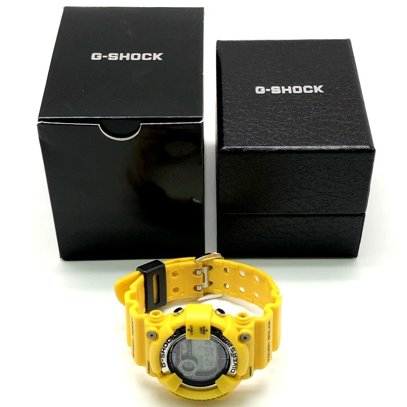 コメント | 2010年10月にDW-8200の流れを汲んで発売されたFROGMAN。2代目FROGMANのケースデザインはそのままに、8200シリーズで初めてタフソーラーとタイドグラフを搭載したスペシャルモデルです。カラーは初代モデルの限定カラーであるイエローが採用され、裏蓋には潜水蛙が刻印されています。ELバックライト発光時にも潜水蛙が浮かび上がります。 |