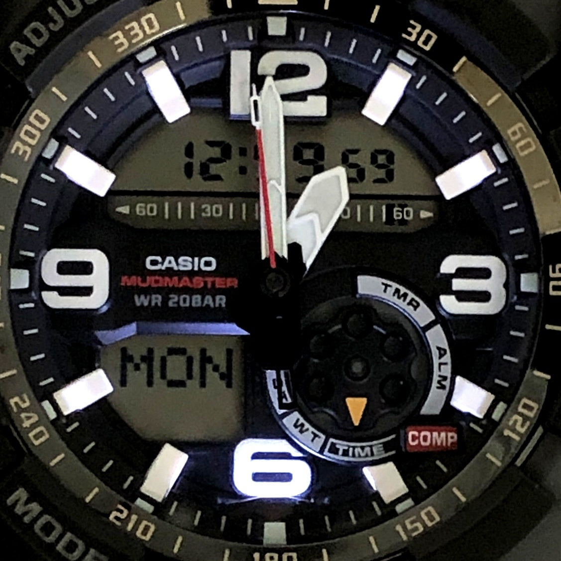 コメント | 2016年4月に発売された、瓦礫や土砂が山積する陸上での使用を想定した「MUD MASTER(マッドマスター)」に、方位と温度が計測できるツインセンサーが搭載されたモデル。デザイン面では視認性の高い大型インデックスが採用され、ベゼルやバンドはブラックで統一され、ミリタリーテイストなデザインに仕上げられています。 |