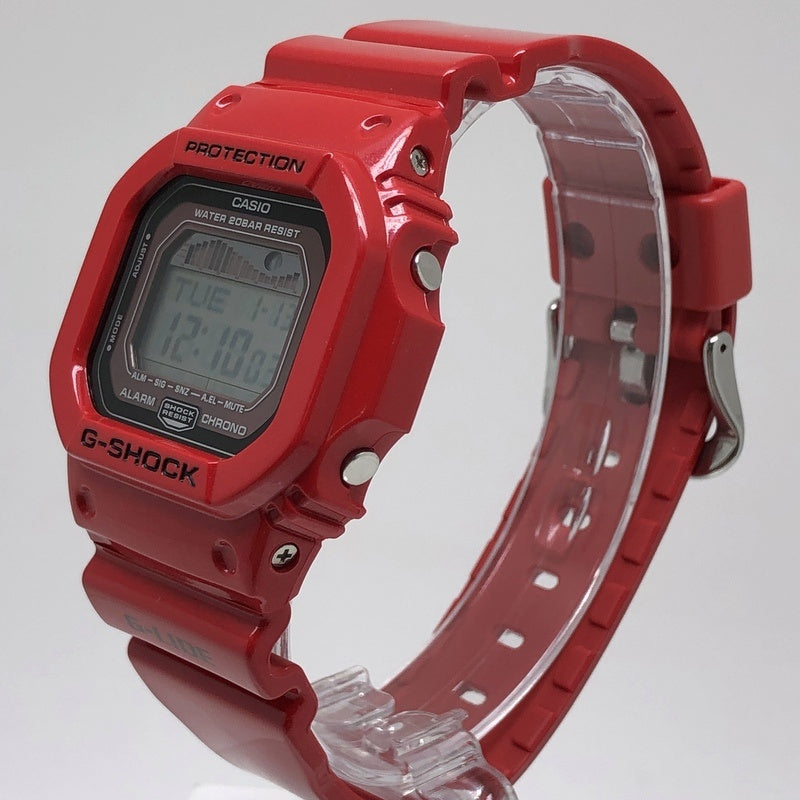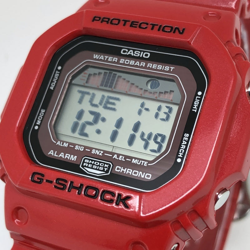 | コメント | 2008年5月に発売された、サーファーの必須機能であるタイドグラフとムーンデータが搭載されたG-LIDEの夏モデル。ベースにはスクエアデザインが人気の5600シリーズが採用され、ベゼルとバンドには光沢塗装が施されたレッドが配色されています。バンドにはサーフボードに見られるピンストライプのラインがデザインされており、ミラー仕上げのタイドグラフと、メタル文字盤が採用されています。 |