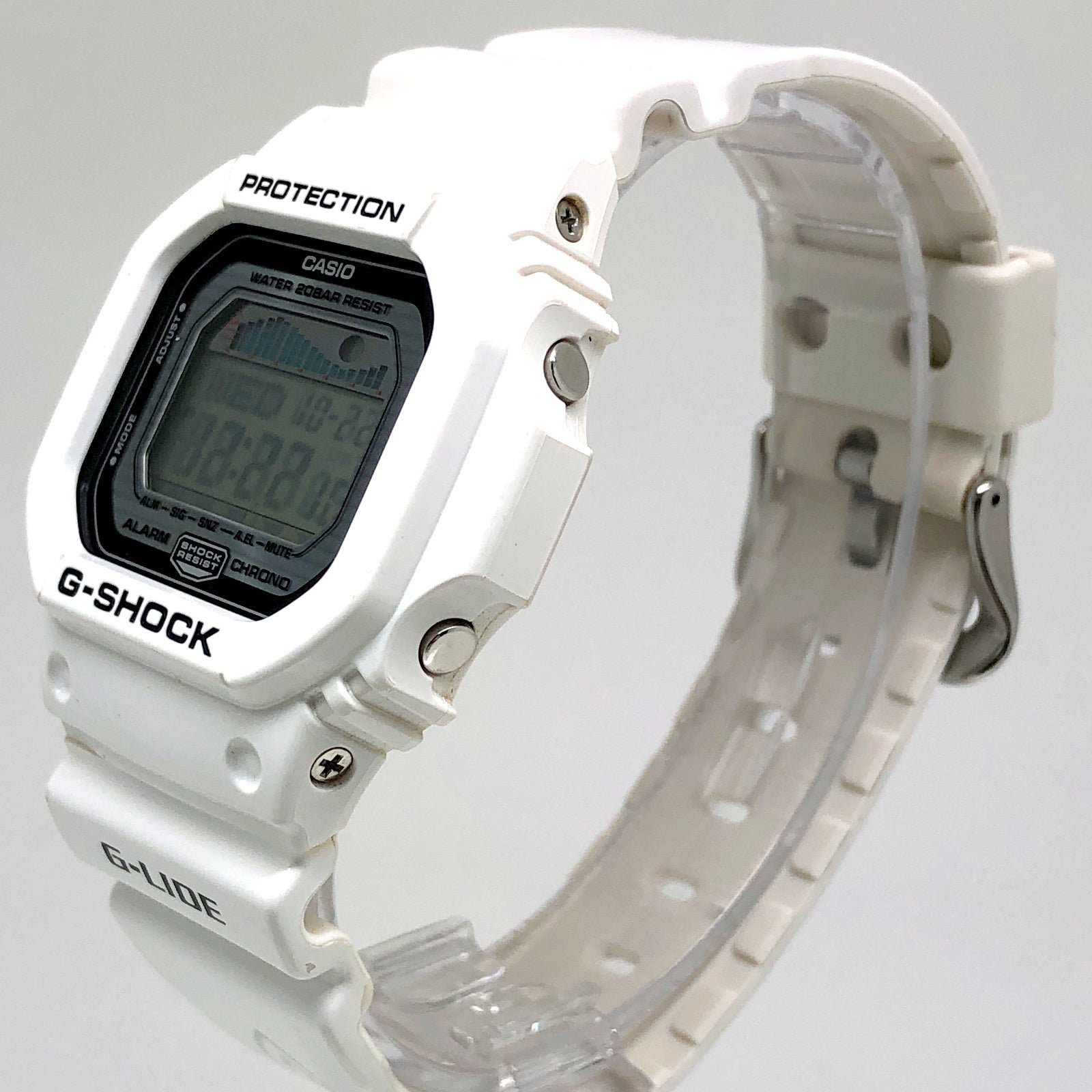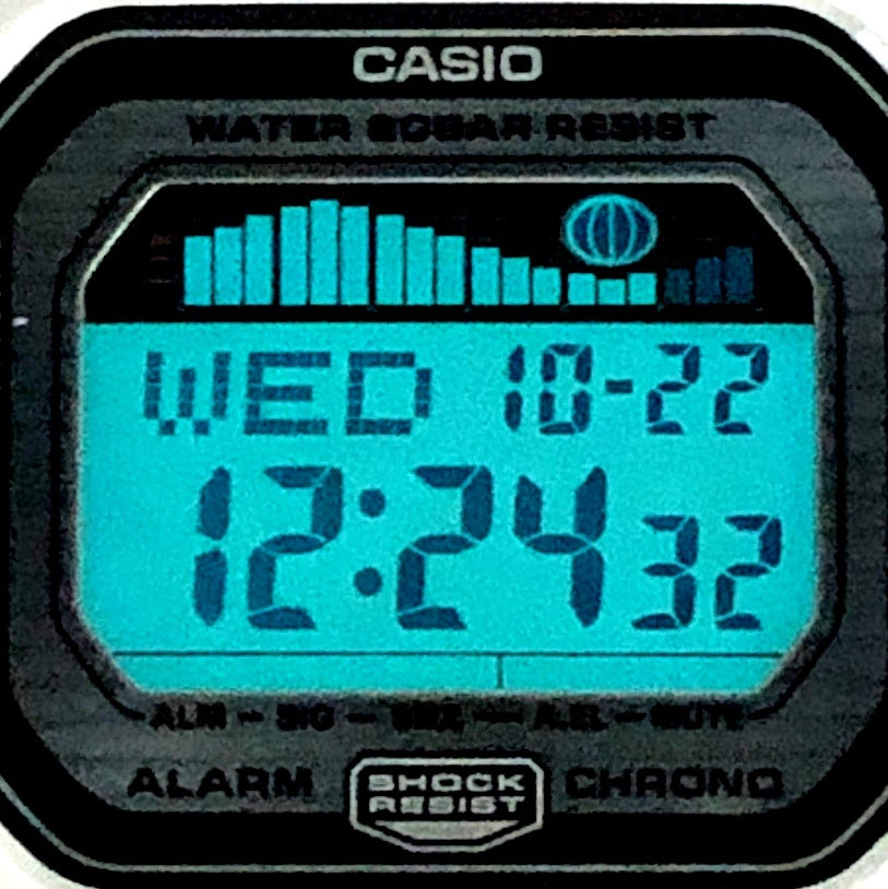 | コメント | 2014年4月に発売された、世界のトップアスリートから支持を受けるG-SHOCKのスポーツライン「G-LIDE(ジーライド)」のカラーモデル。ベースにはスクエアデザインが人気の5600シリーズにサーファーの必須機能であるタイドグラフとムーンデータが搭載されたGLX-5600を採用。ベゼルとバンドには光沢塗装が施されたホワイトが配色され、メタリック調の文字盤が採用されています。バンドにはサーフボードに見られるピンストライプのデザインがプリントされています。 |