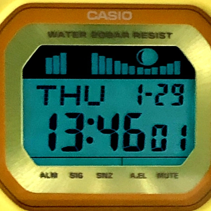 | コメント | 2022年5月に発売された、サーファーの必須機能であるタイドグラフとムーンデータが搭載されたG-LIDEの夏モデル。ベースにはスクエアデザインが人気の5600シリーズが採用され、ベゼルとバンドには光ビビットカラーのイエローが配色されています。ミラー仕上げのタイドグラフと、シルバーのメタル文字盤が採用され、夏らしいデザインに仕上げられています。 |