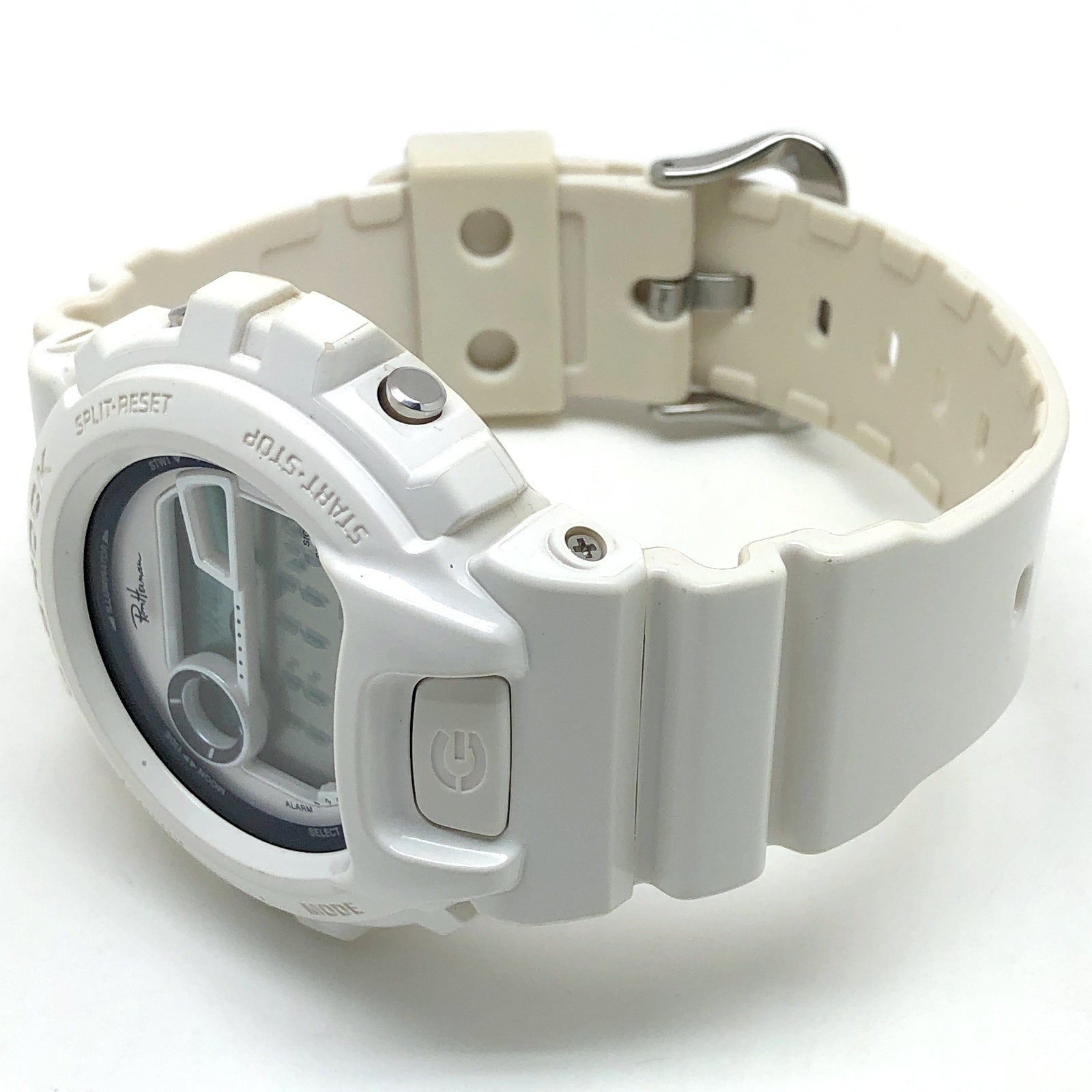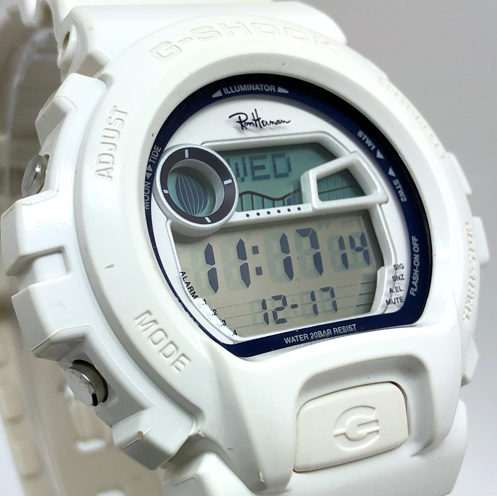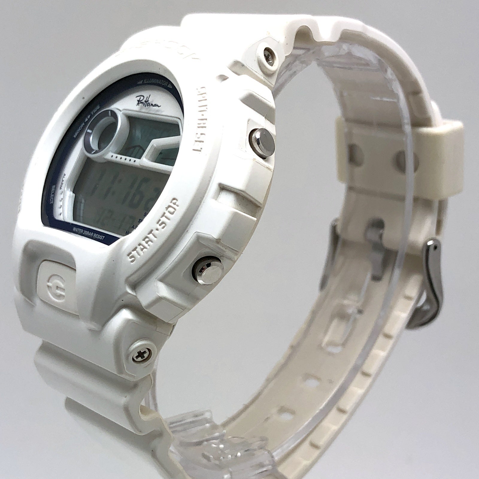 | コメント | 2018年4月に、アメリカ・カリフォルニア発のスペシャリティストア「Ron Herman(ロンハーマン)」の、日本国内2店舗開店5周年を記念して発売されたコラボレーションモデル。ベースにはタイドグラフとムーンデータが搭載されたスポーツモデルG-LIDEのGLX-6900を採用。ベゼルとバンドには光沢塗装が施されたホワイトが採用され、文字盤にはホワイト、ディスプレイリングにはネイビーブルーが配色されています。文字盤上部にはロンハーマンのブランドロゴがデザインされ、裏蓋にもブランドロゴが刻印されています。 |