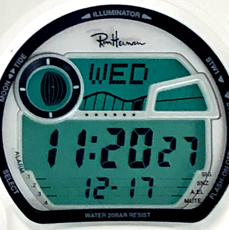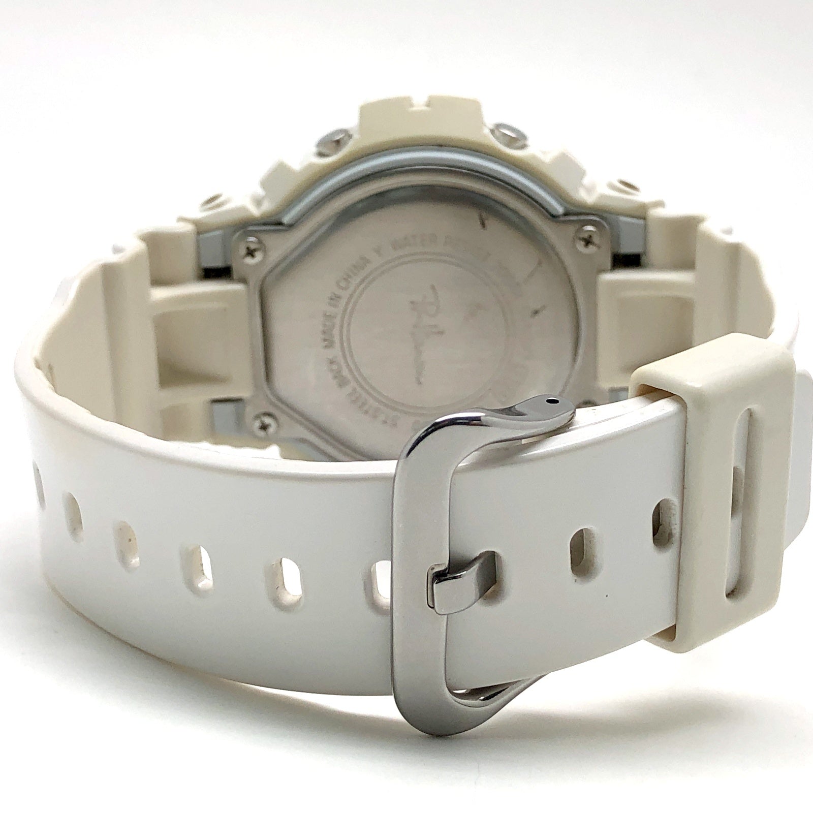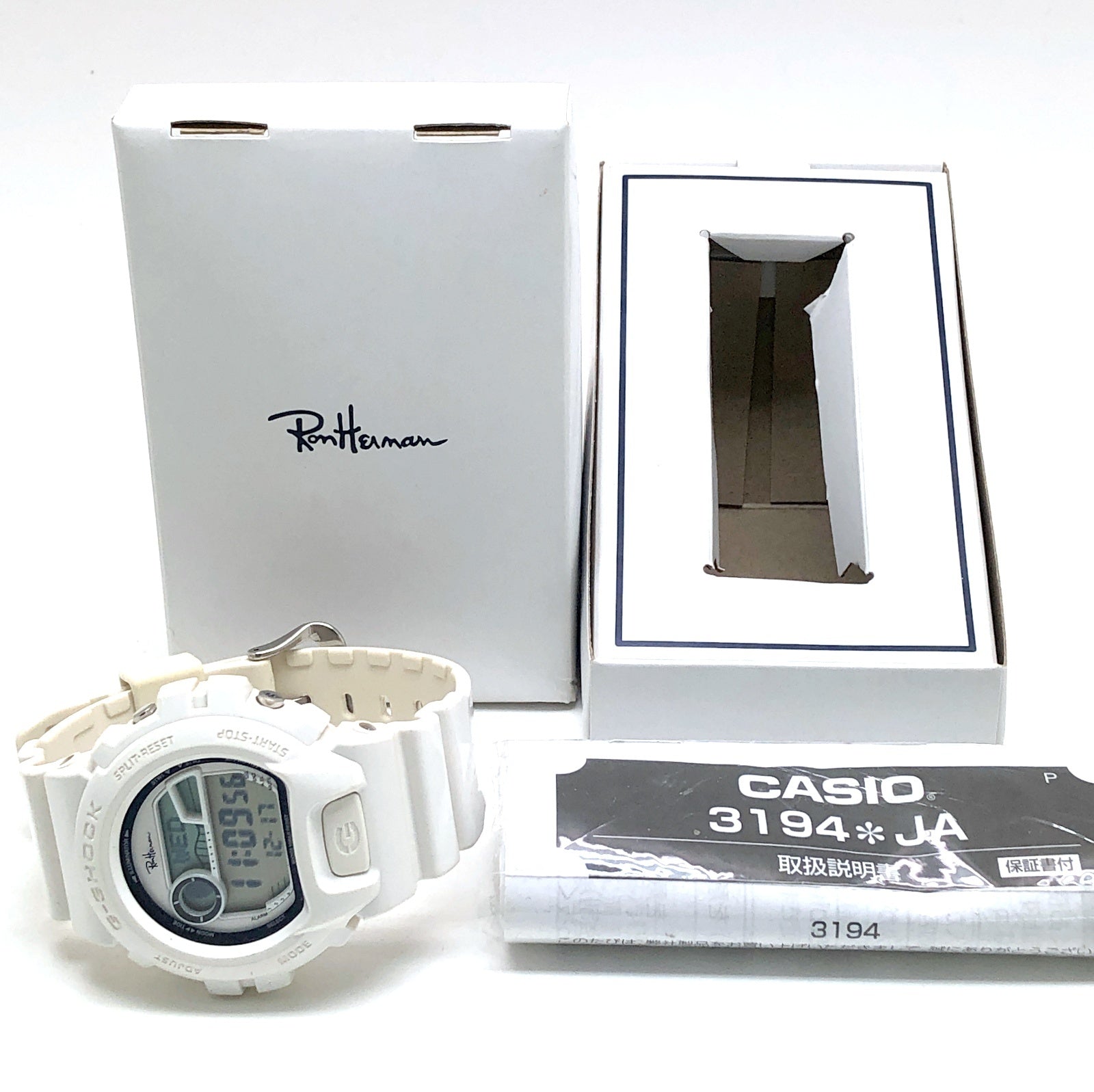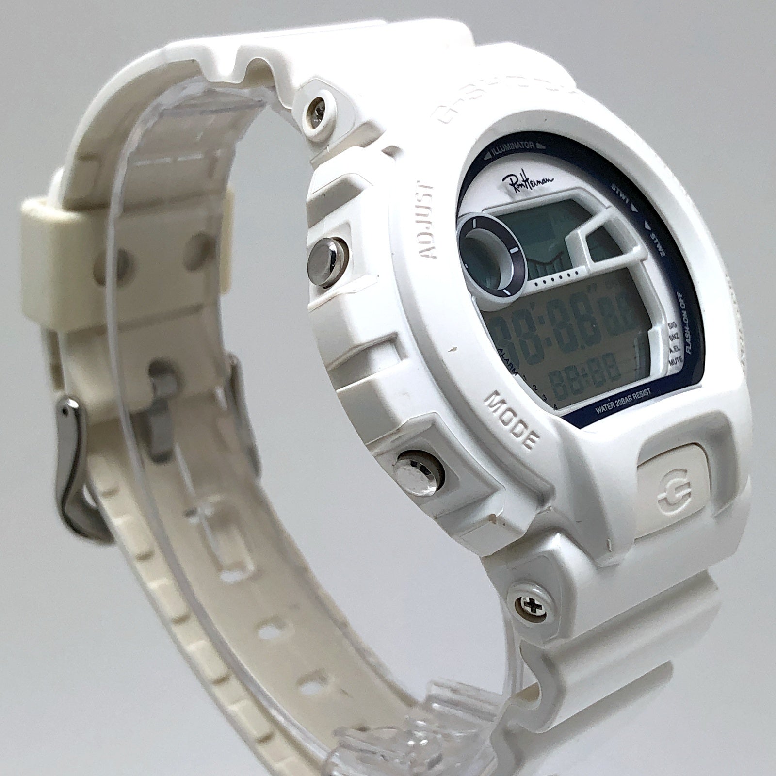 | コメント | 2018年4月に、アメリカ・カリフォルニア発のスペシャリティストア「Ron Herman(ロンハーマン)」の、日本国内2店舗開店5周年を記念して発売されたコラボレーションモデル。ベースにはタイドグラフとムーンデータが搭載されたスポーツモデルG-LIDEのGLX-6900を採用。ベゼルとバンドには光沢塗装が施されたホワイトが採用され、文字盤にはホワイト、ディスプレイリングにはネイビーブルーが配色されています。文字盤上部にはロンハーマンのブランドロゴがデザインされ、裏蓋にもブランドロゴが刻印されています。 |